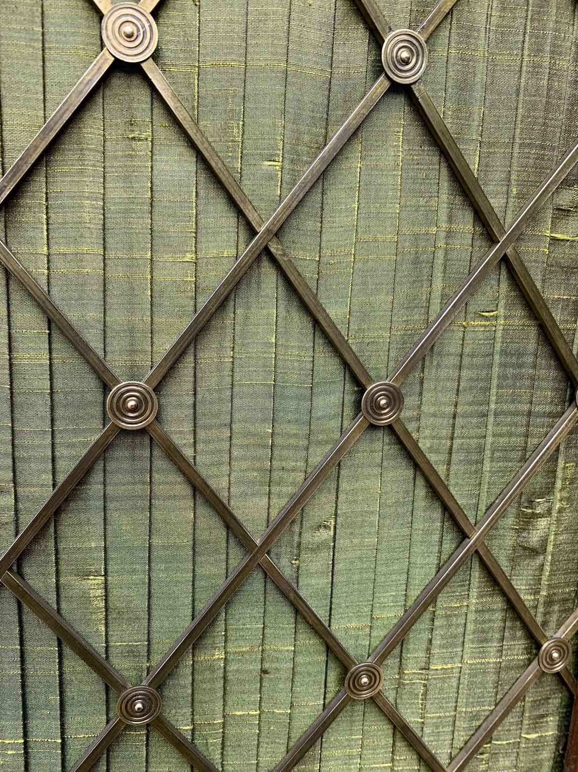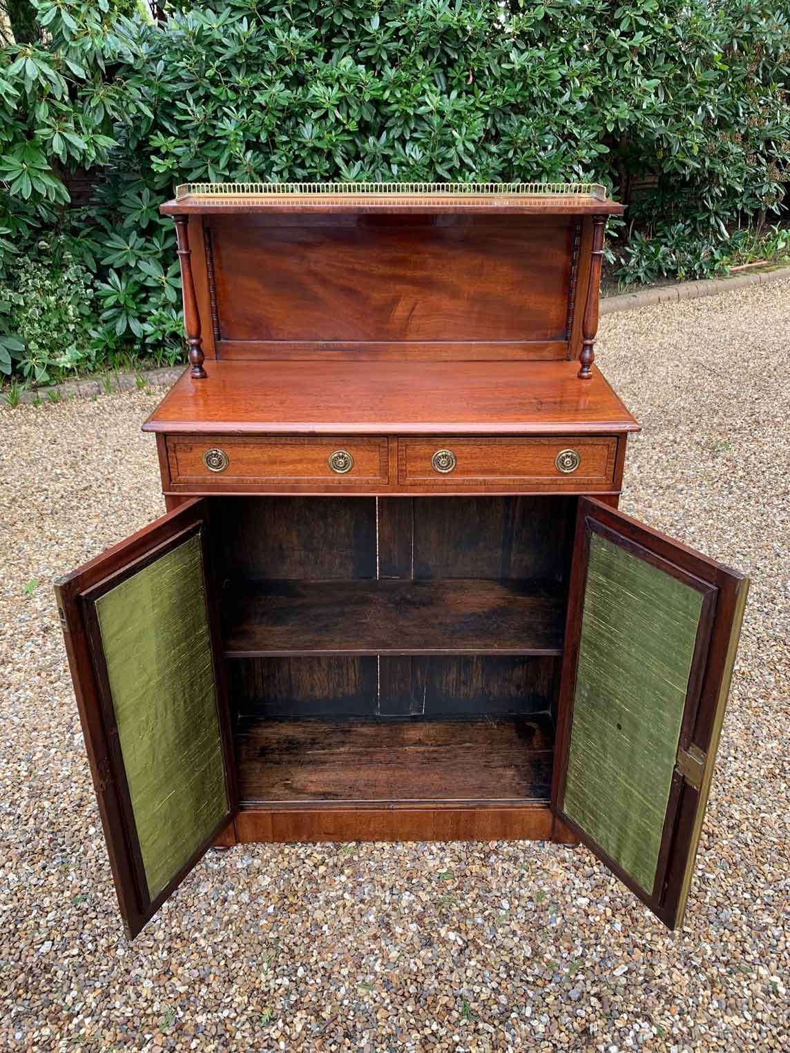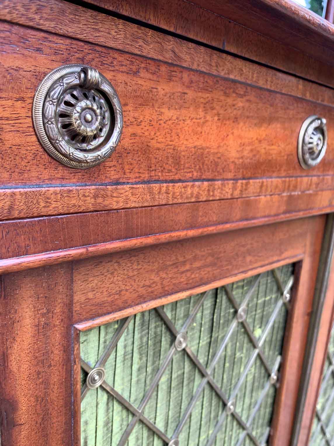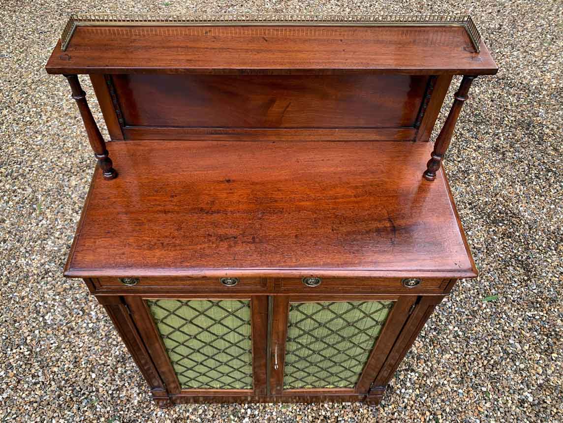 19th Century Mahogany Victorian Chiffonier, with two drawers with brass ring handles. Supported by baluster turned columns with a brass gallery on top, above moulded freize and brass grille pleated doors, supported on plinth base.