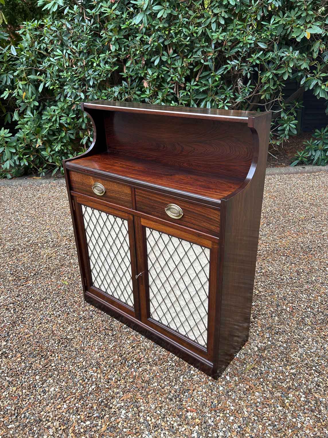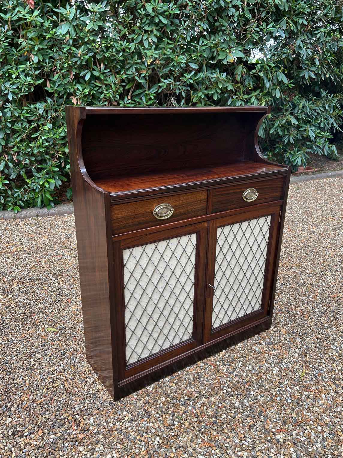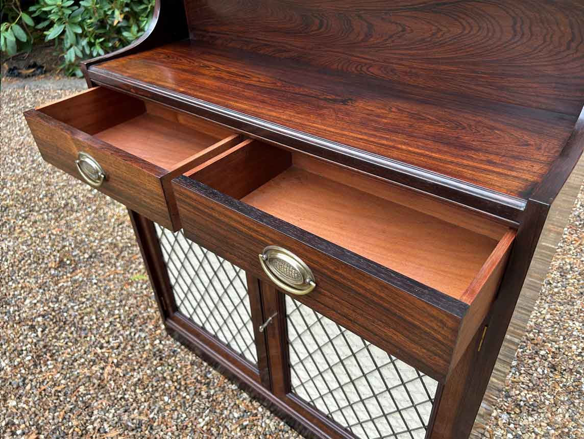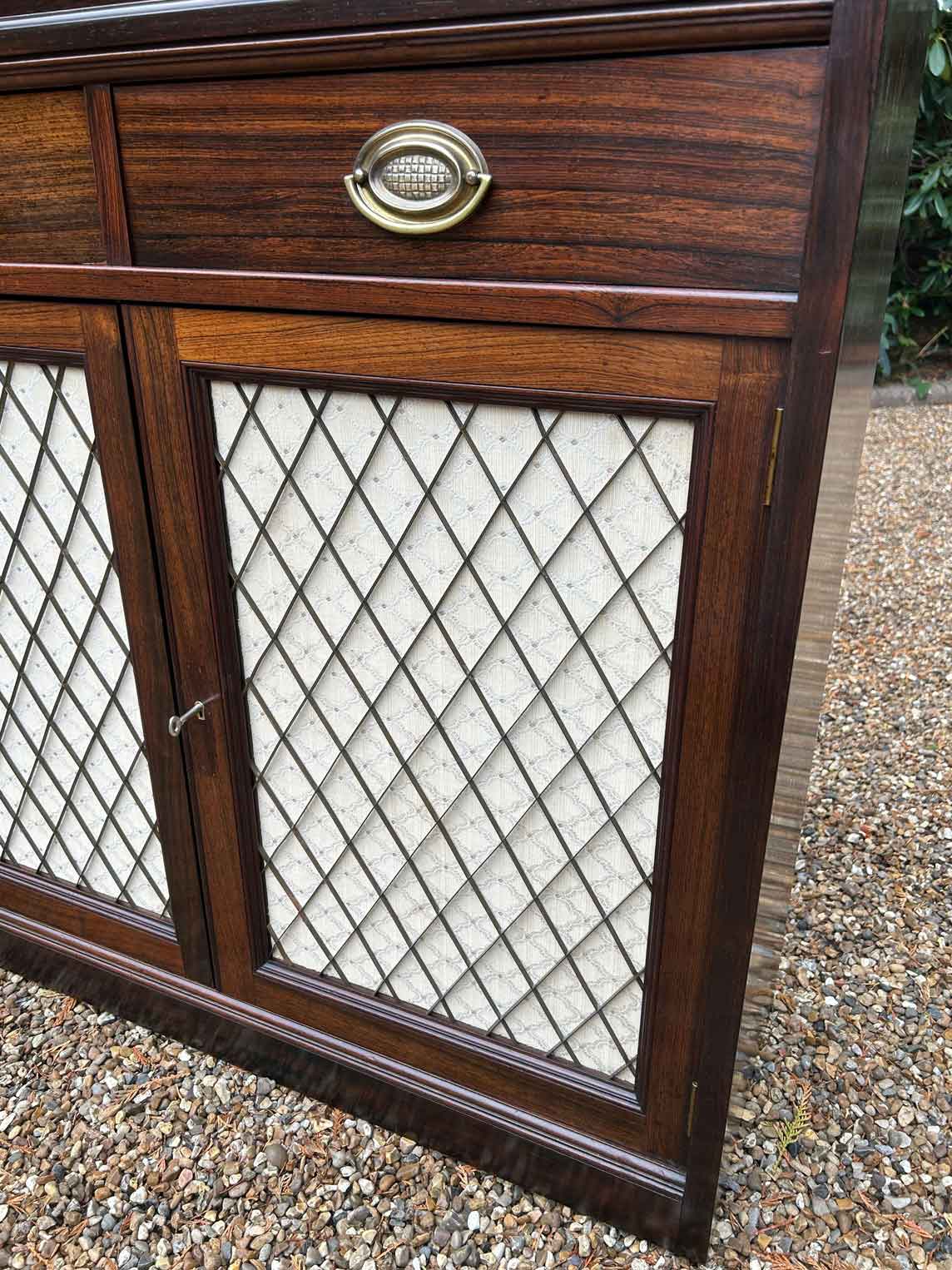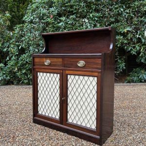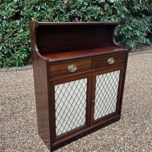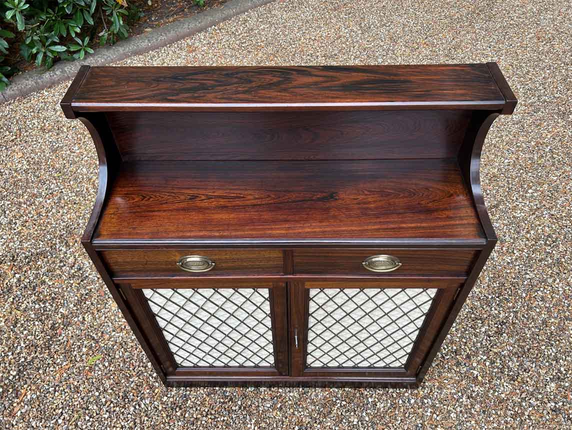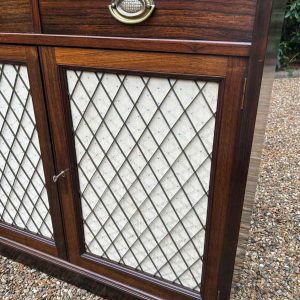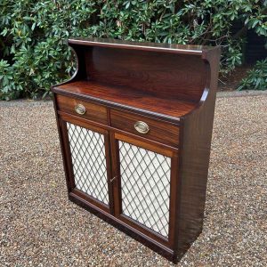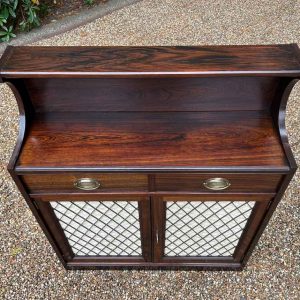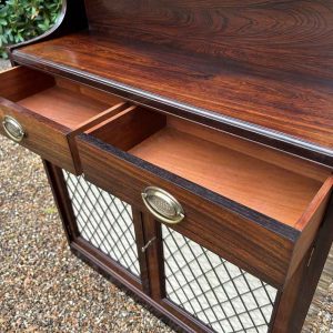 A very high quality 19th Century Rosewood Chiffonier with a shelf back above two mahogany lined drawers with brass oval plate handles. A pair of brass grille doors open to an adjustable solid rosewood shelf on inside.