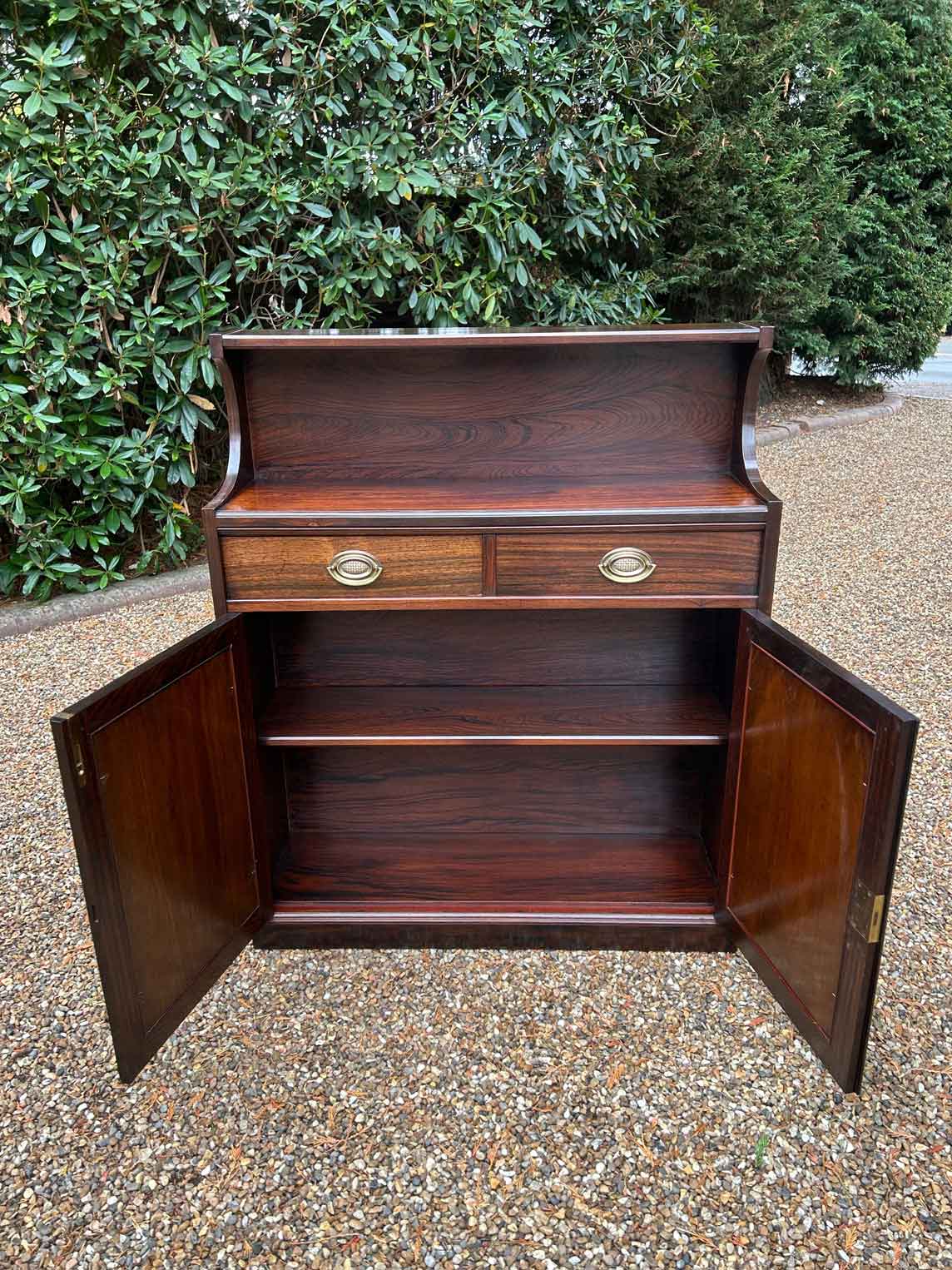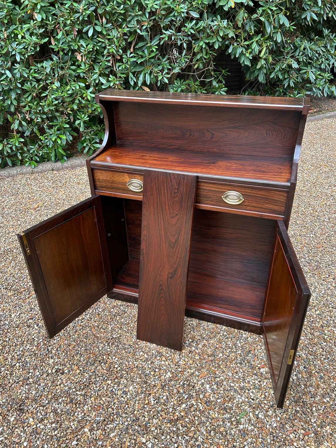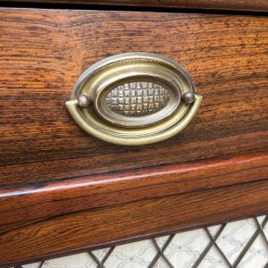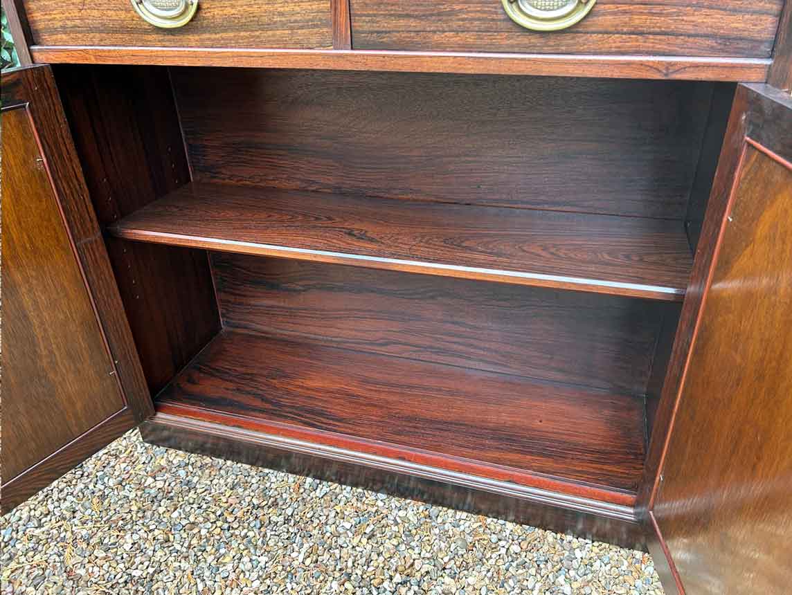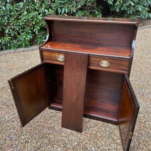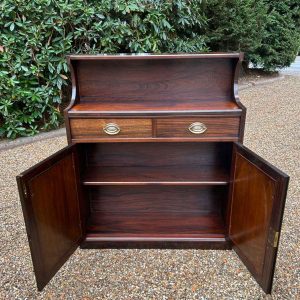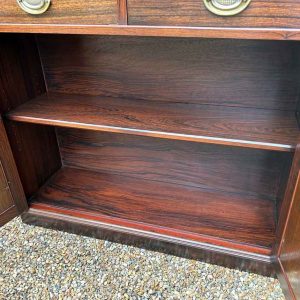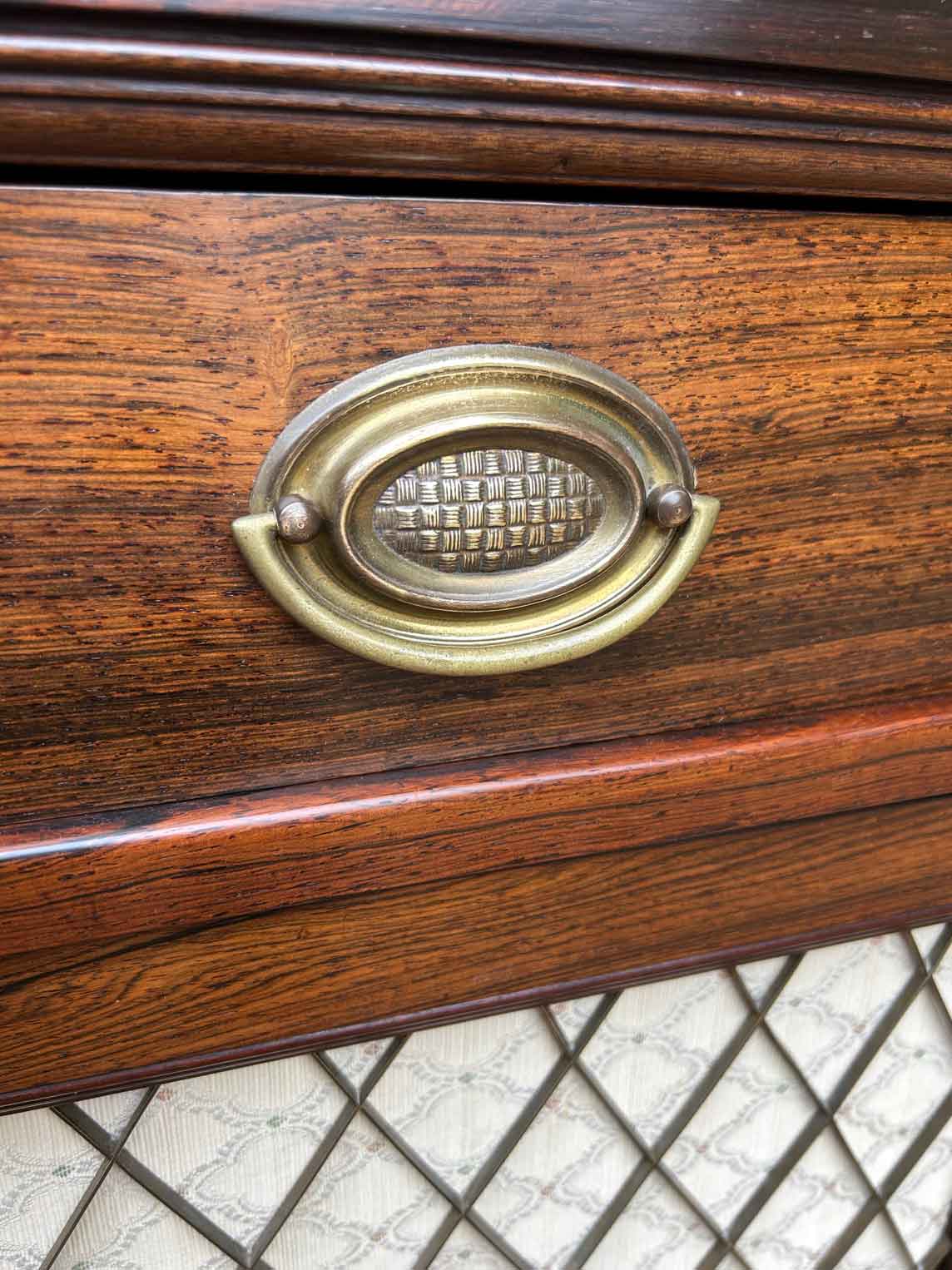 A very high quality 19th Century Rosewood Chiffonier with a shelf back above two mahogany lined drawers with brass oval plate handles. A pair of brass grille doors open to an adjustable solid rosewood shelf on inside.