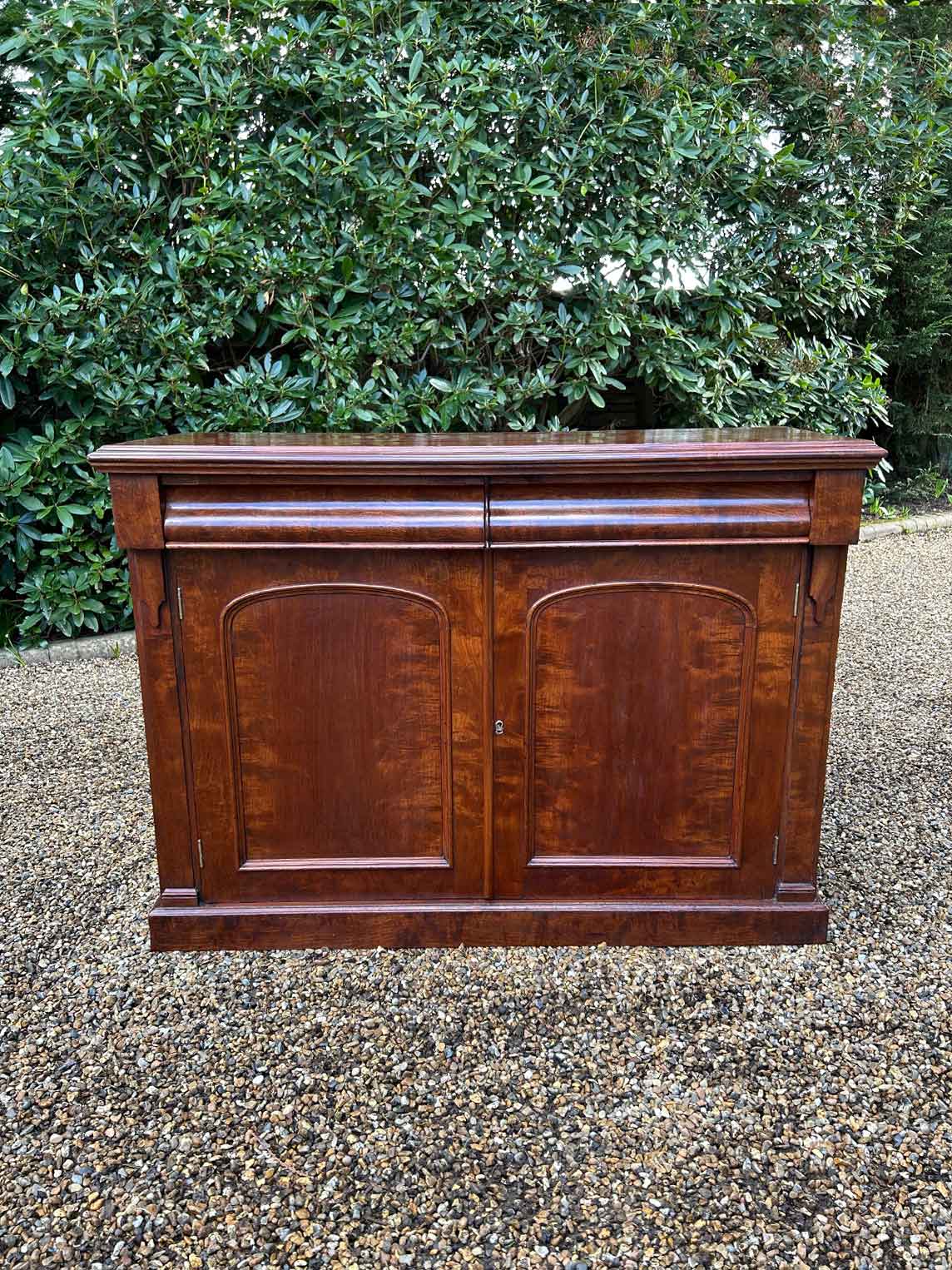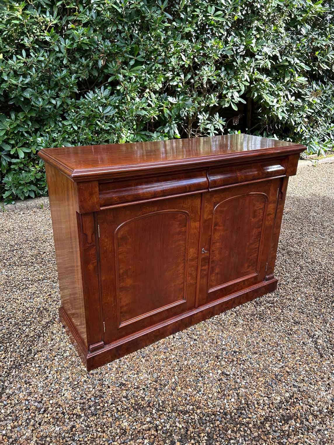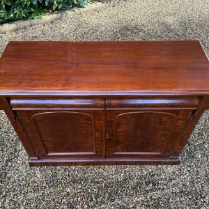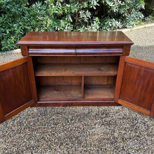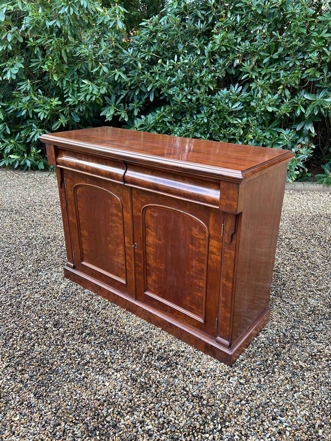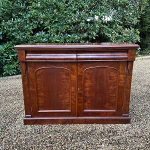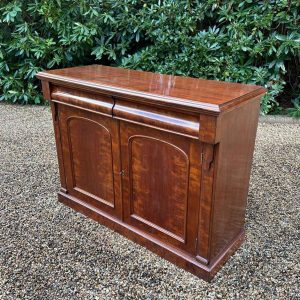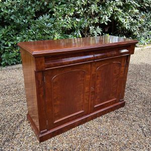 19th Century William IV Mahogany Chiffonier with two cusion drawer and cupboard, enclosed by two arched panel doors with a shelf on inside, supported on a plinth base.