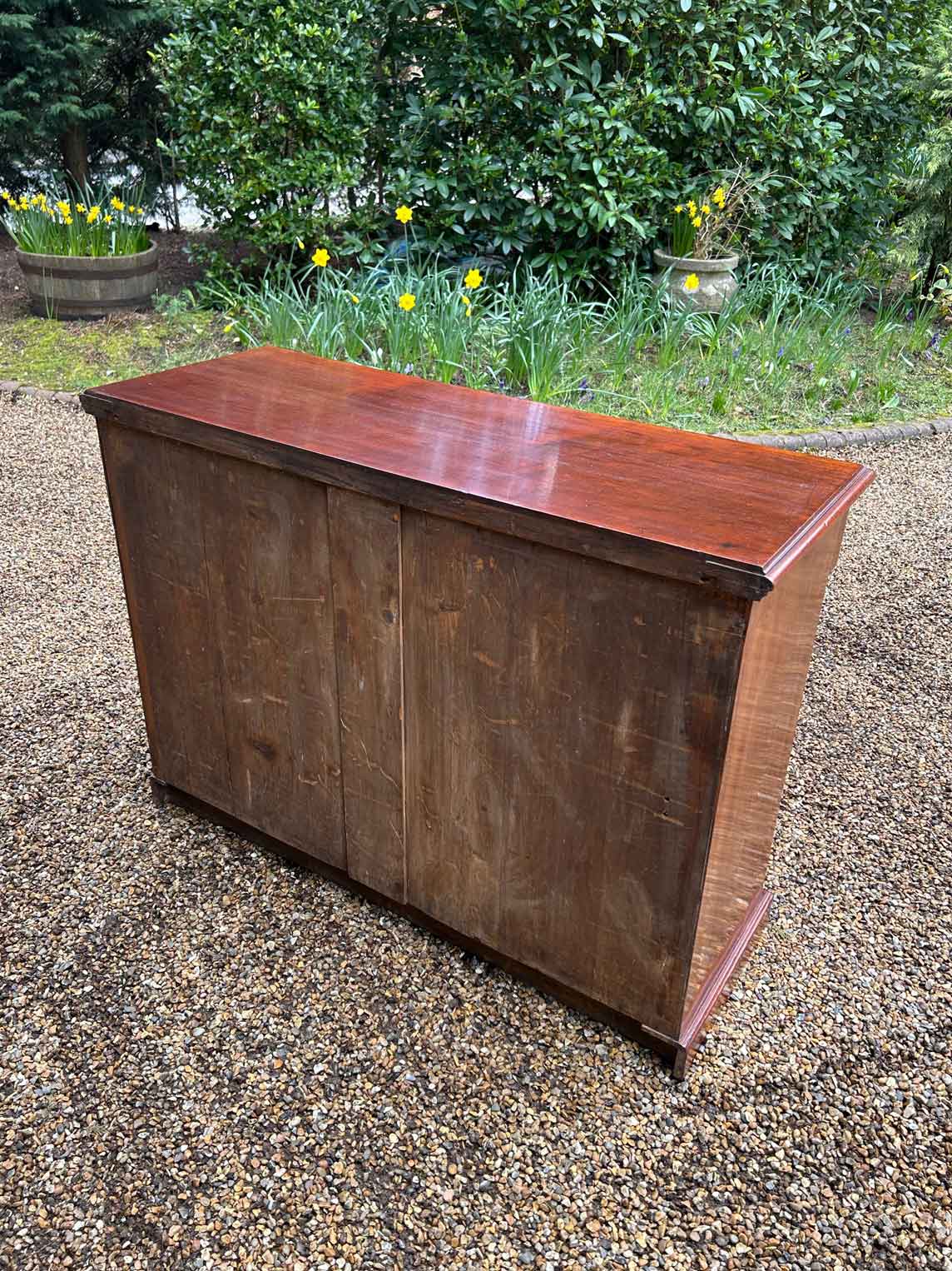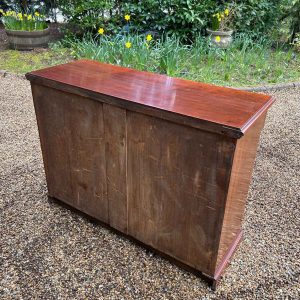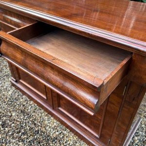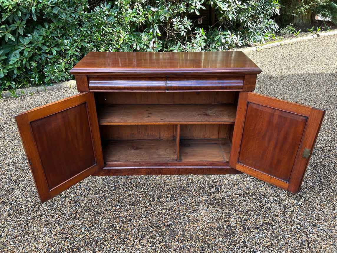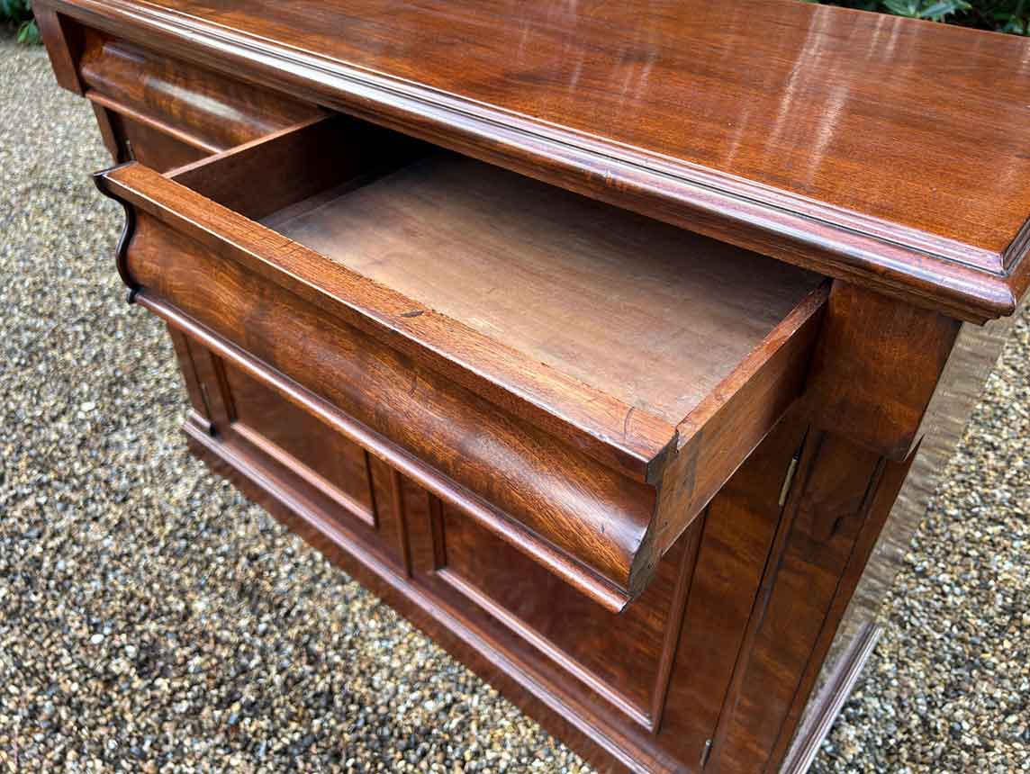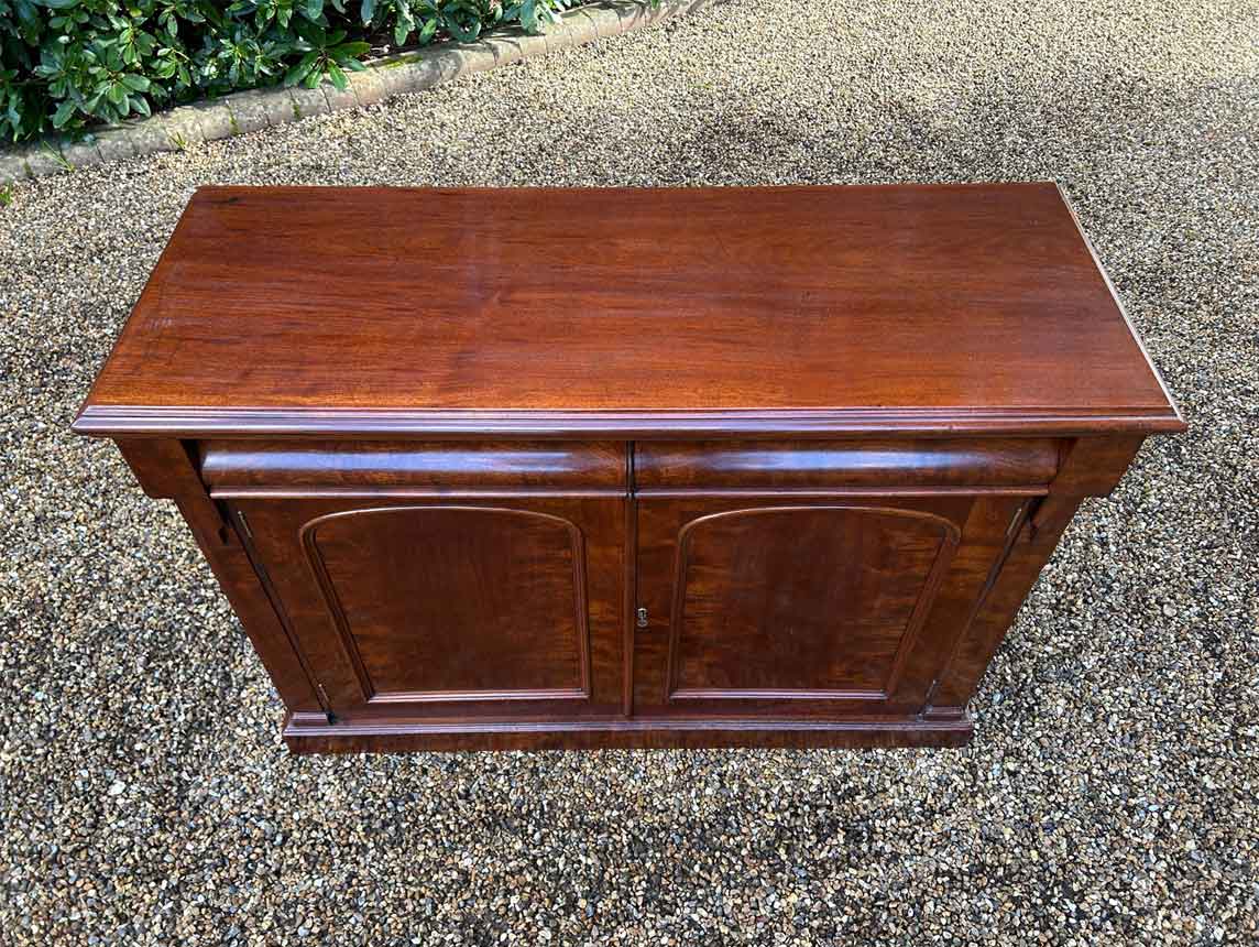 19th Century William IV Mahogany Chiffonier with two cusion drawer and cupboard, enclosed by two arched panel doors with a shelf on inside, supported on a plinth base.