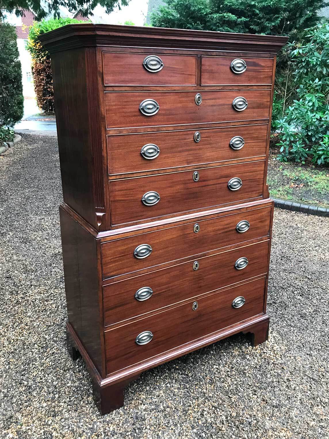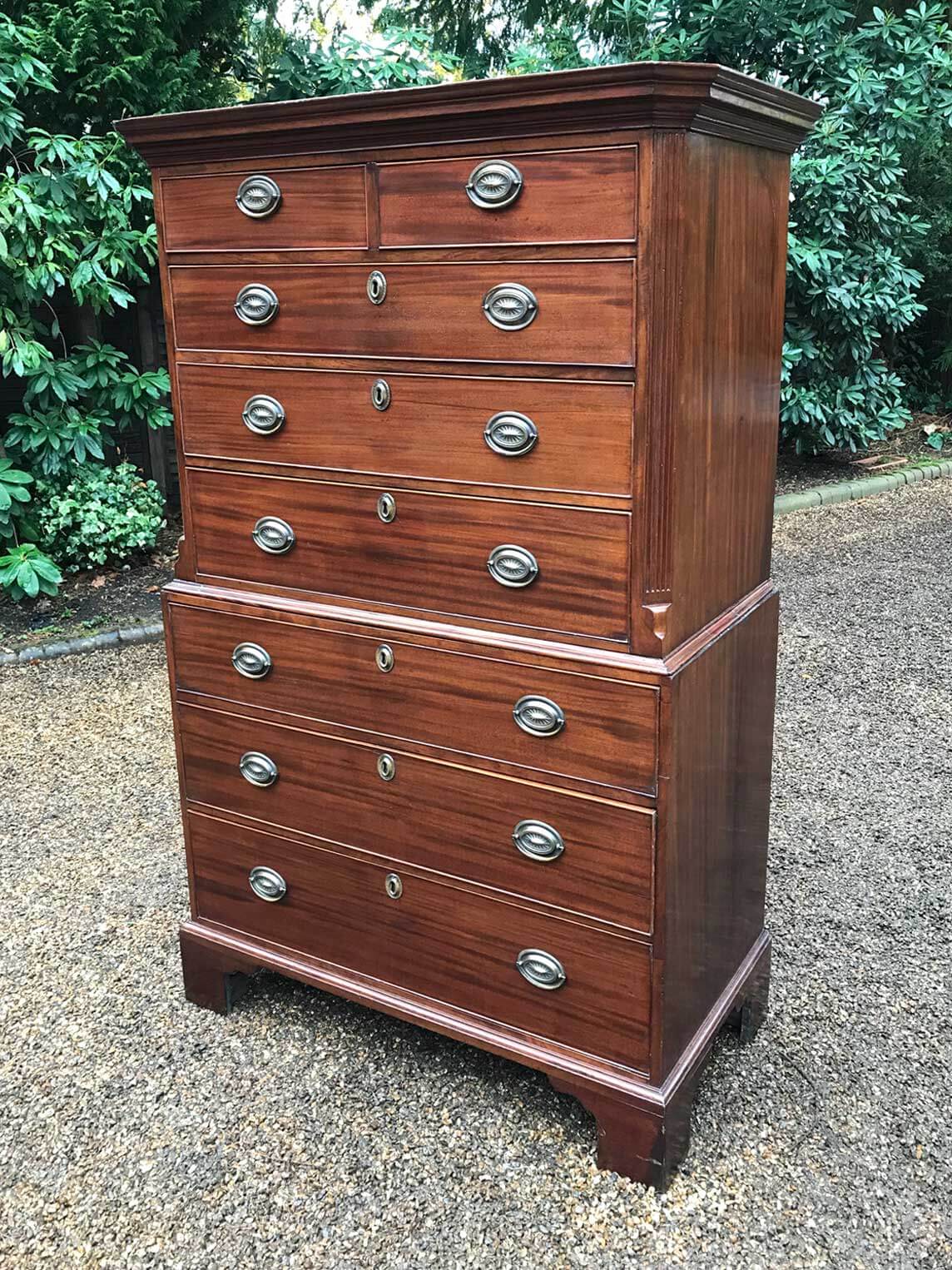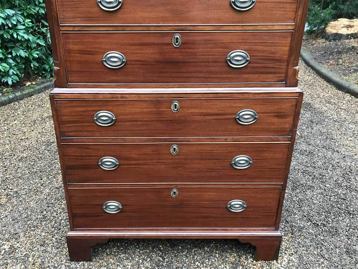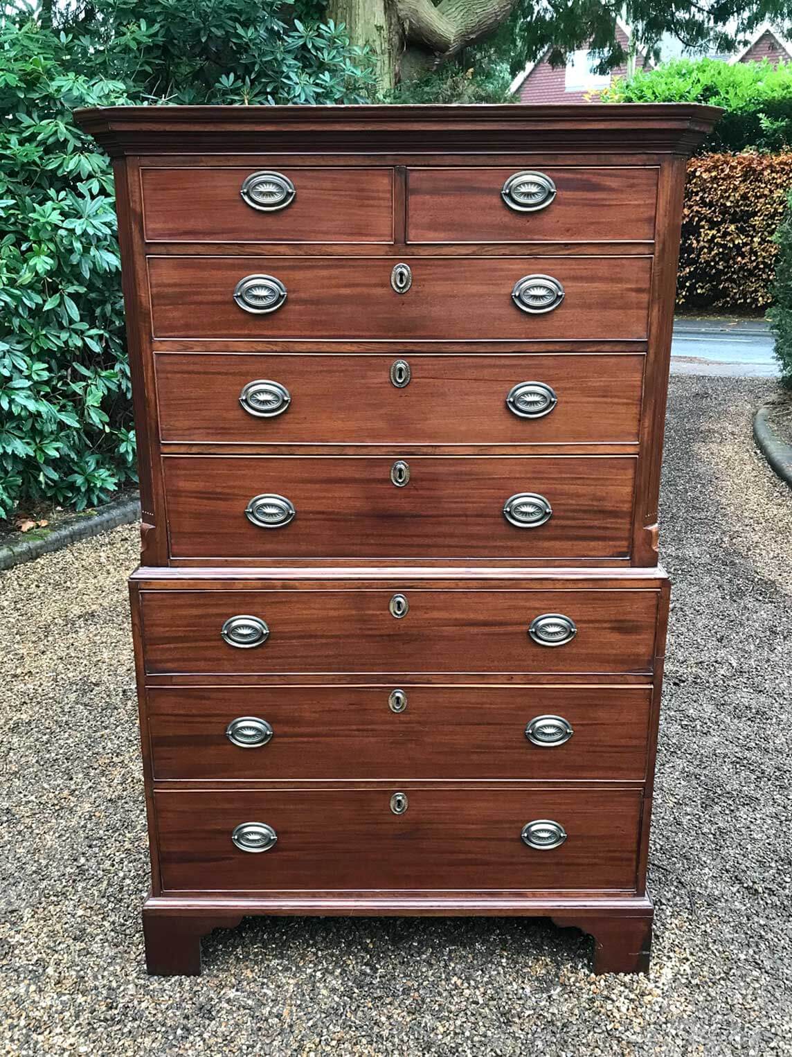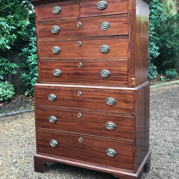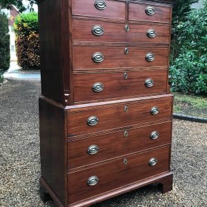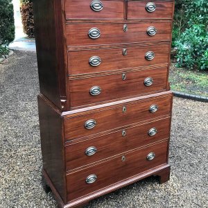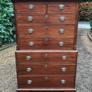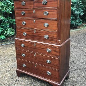 A very high quality solid 18th Century Mahogany Chest On Chest (Tallboy). Two short drawers at the top and six long drawers. Original brass plate handles and mahogany lined drawers. Comes apart in two separate sections on original bracket feet.