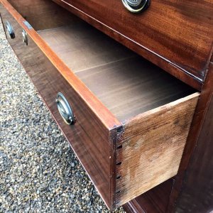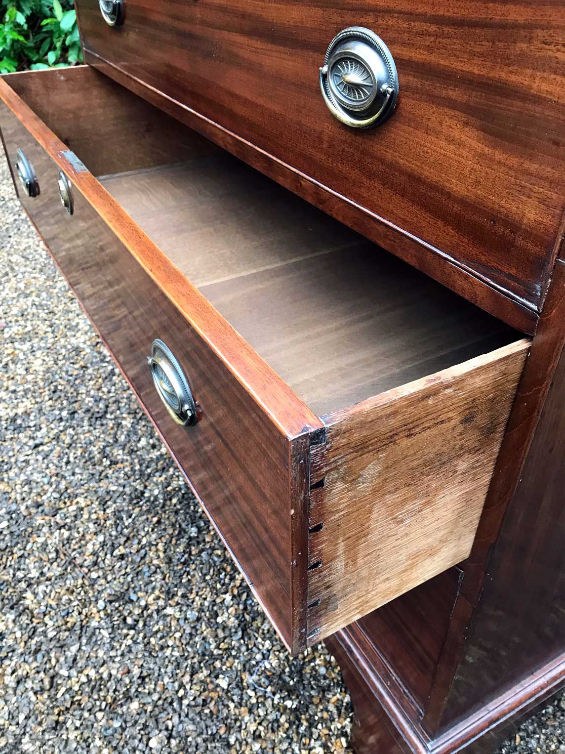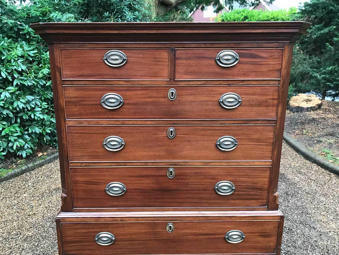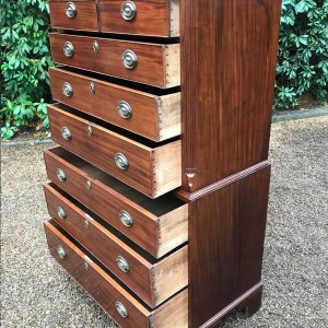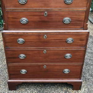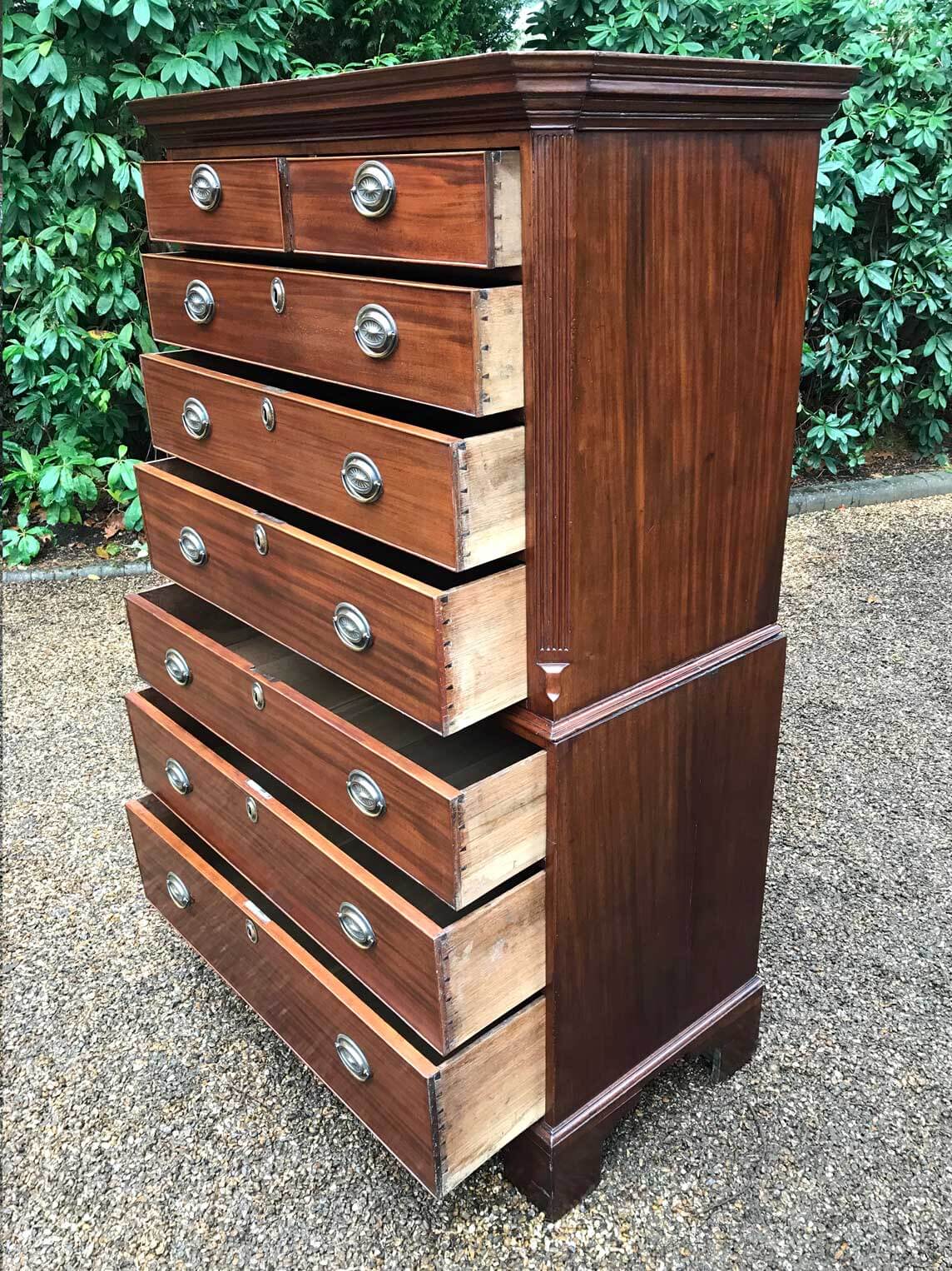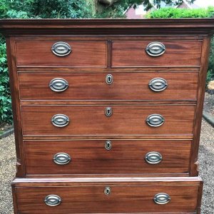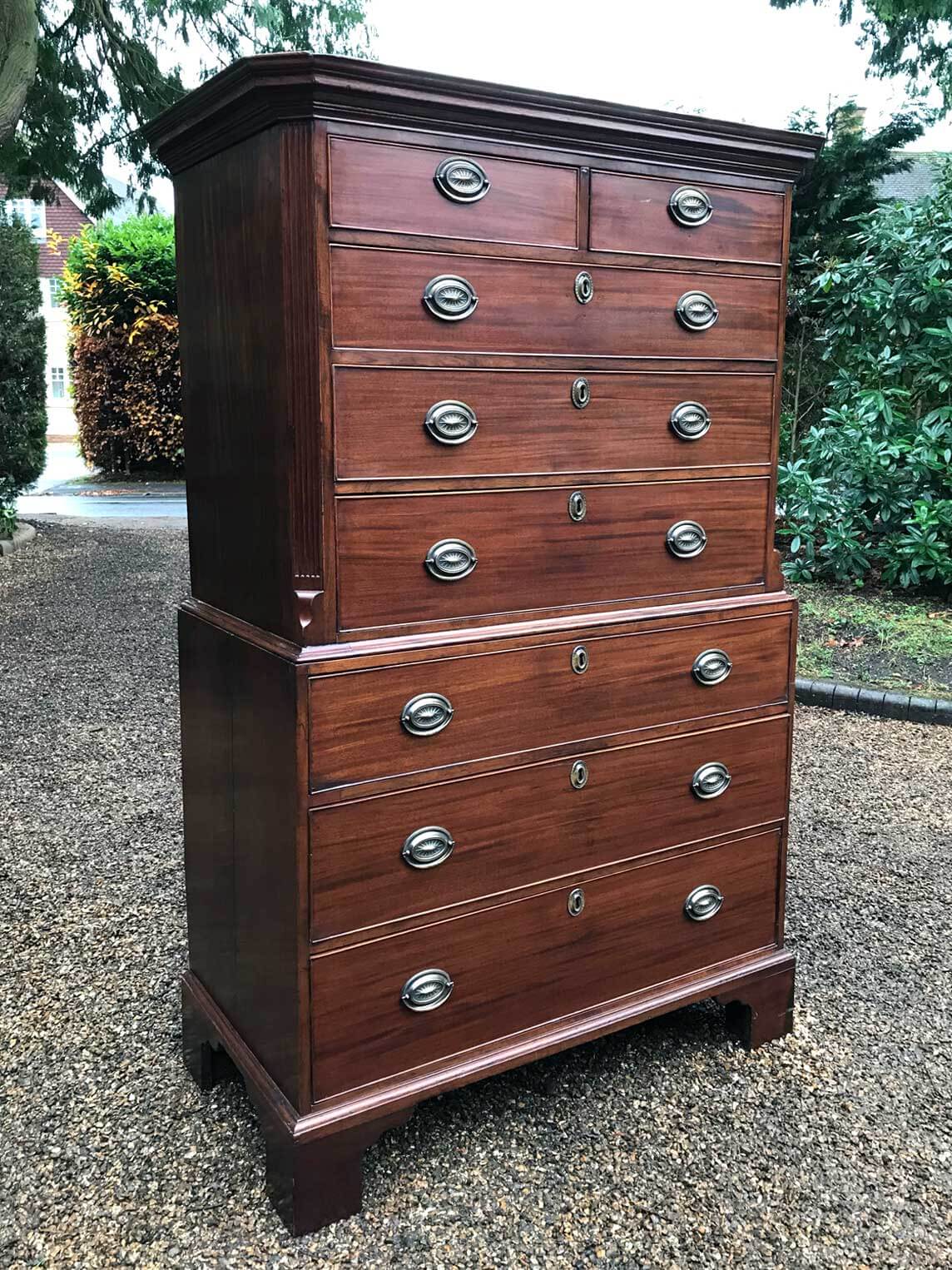 A very high quality solid 18th Century Mahogany Chest On Chest (Tallboy). Two short drawers at the top and six long drawers. Original brass plate handles and mahogany lined drawers. Comes apart in two separate sections on original bracket feet.
