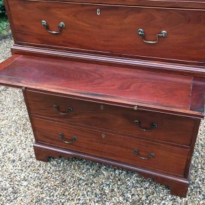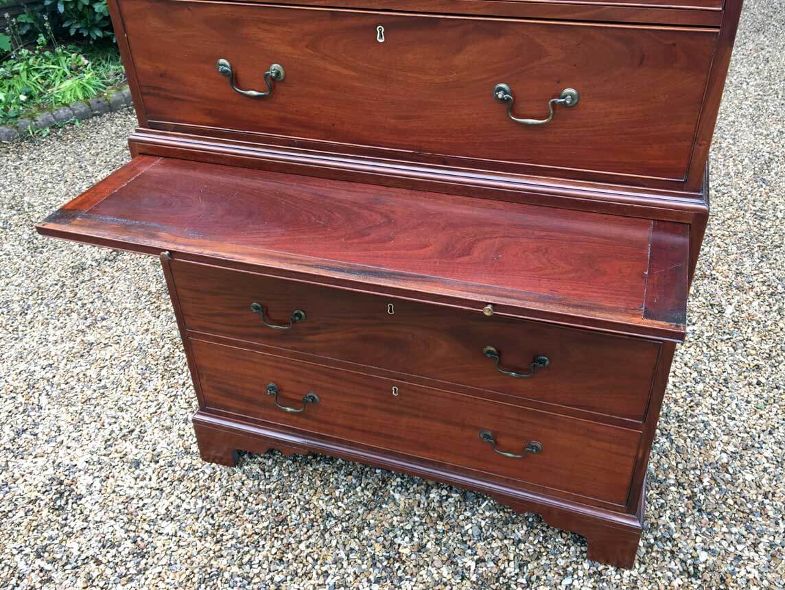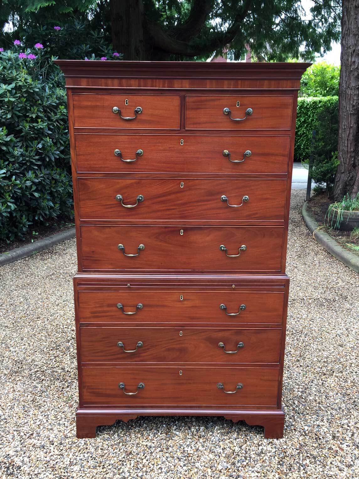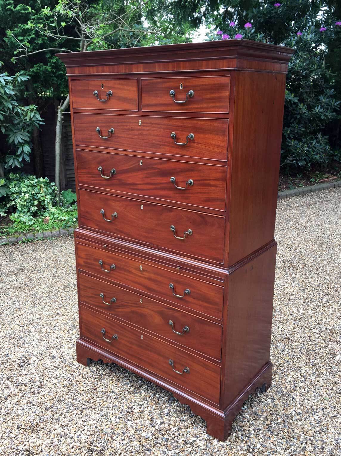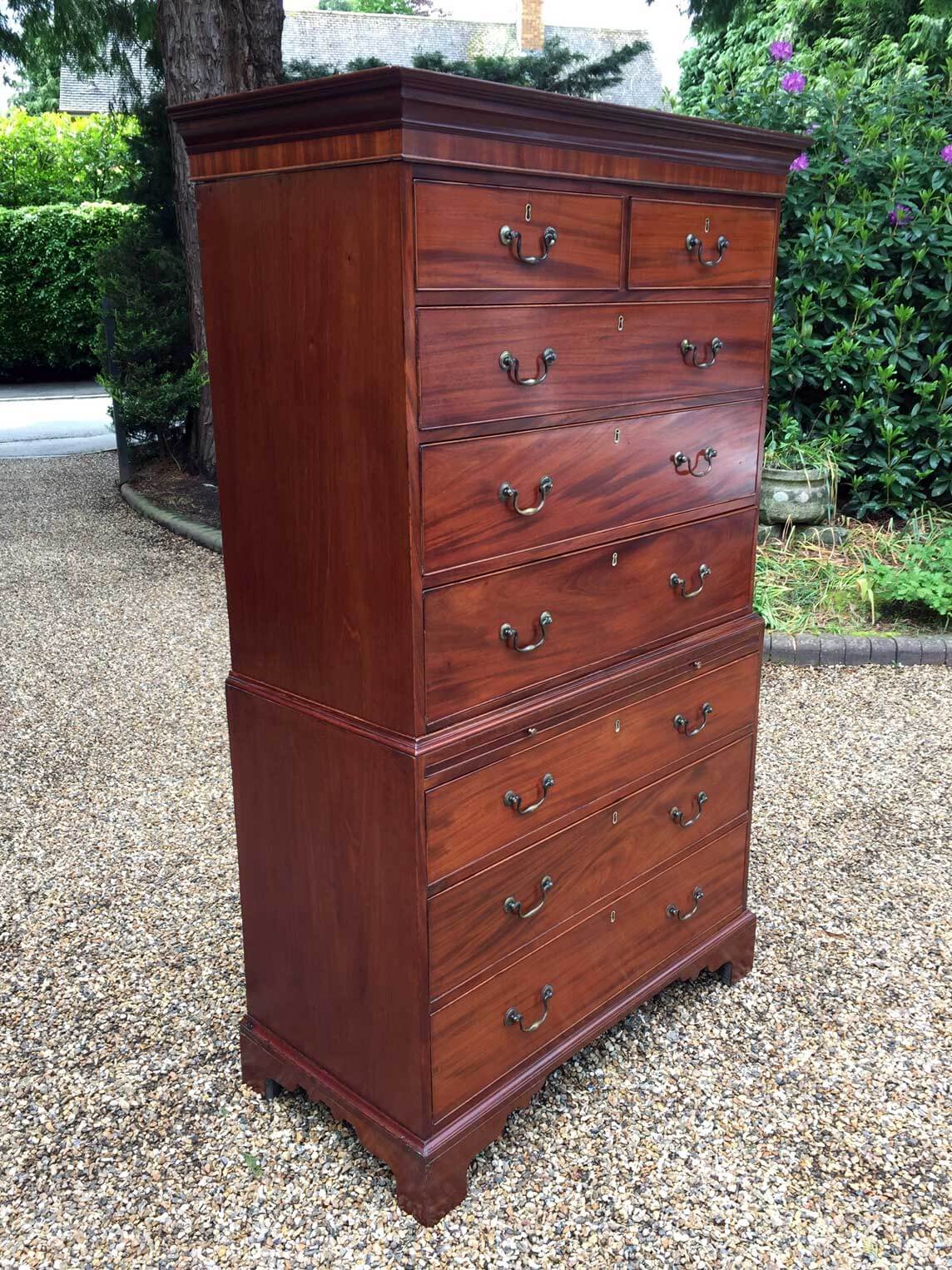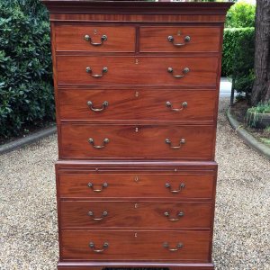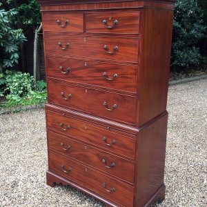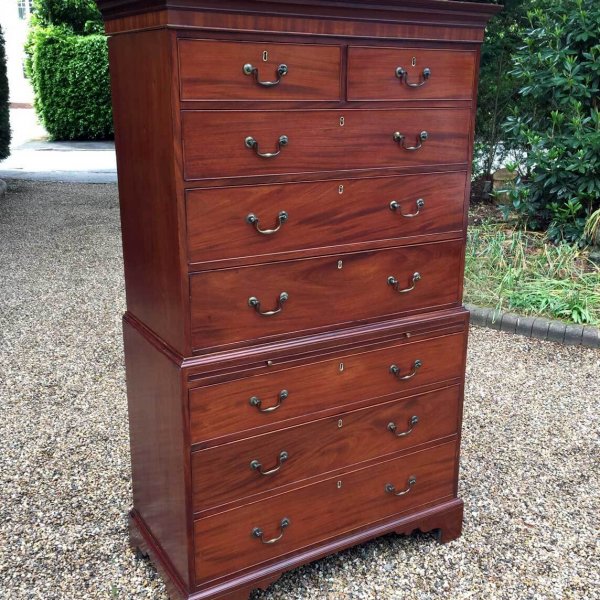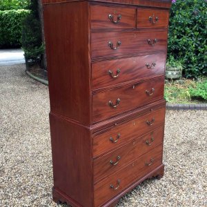 A very high quality 18th Century Mahogany Chest On Chest (Tallboy) with a brushing slide. Two short drawers at the top and six long drawers. Original brass swan neck handles and mahogany lined drawers. Comes apart in three separate sections on original bracket feet.