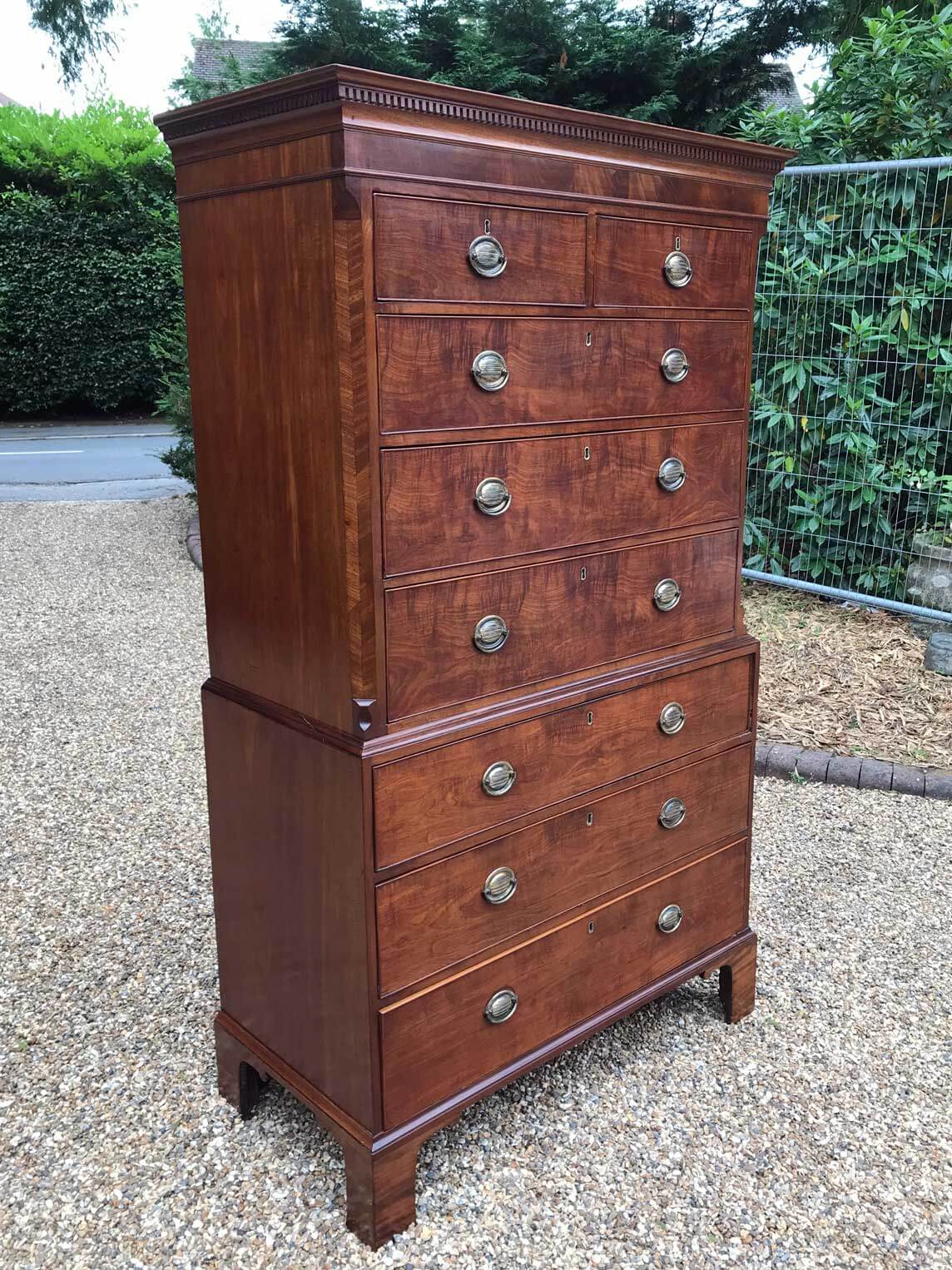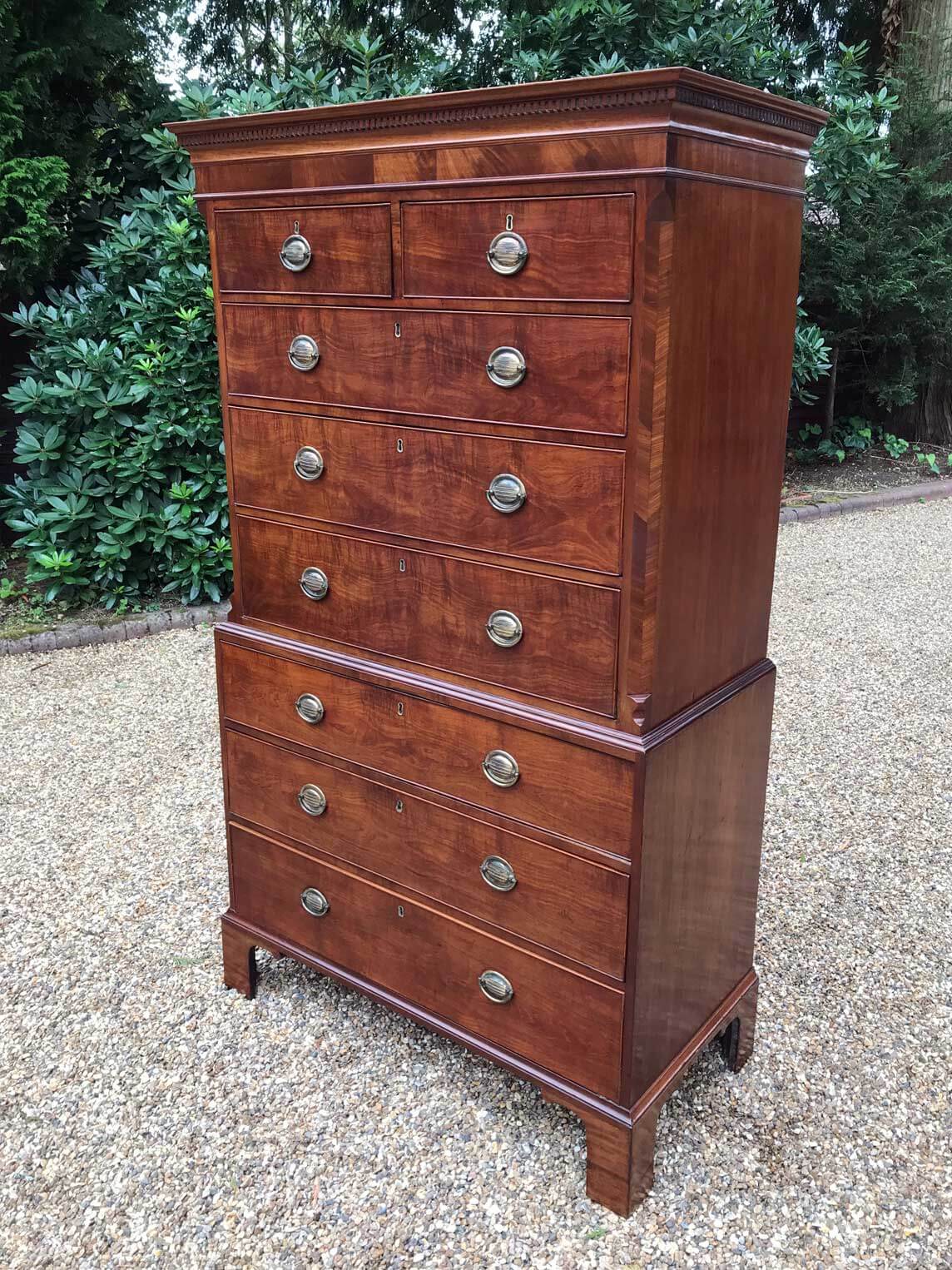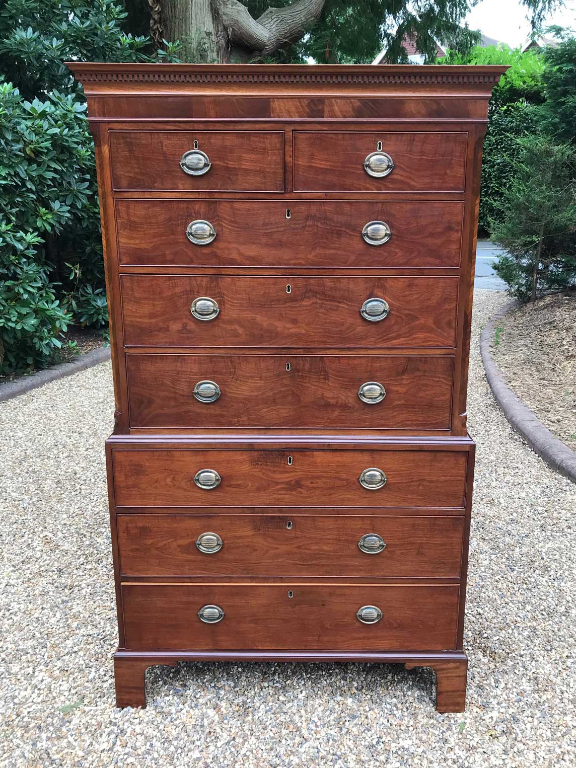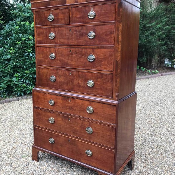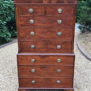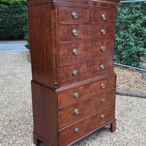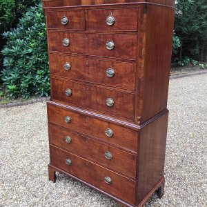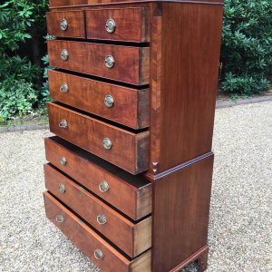 A very high quality 18th Century Mahogany Chest On Chest (Tallboy) Two short drawers at the top and six long drawers. Original oval brass handles and solid oak lined drawers. Comes apart in two separate sections on original bracket feet.