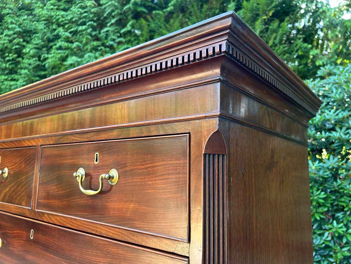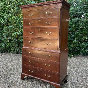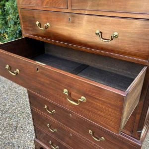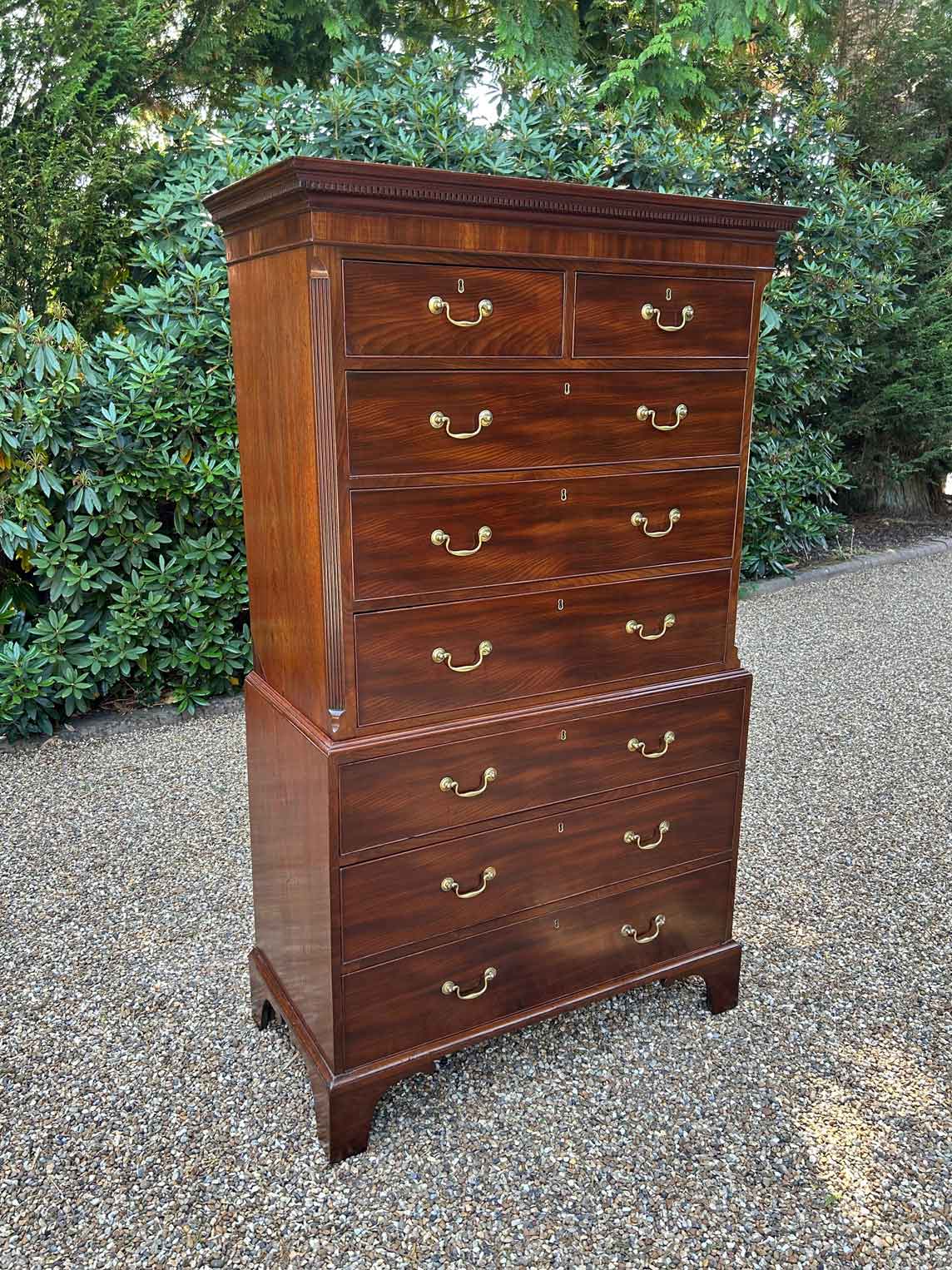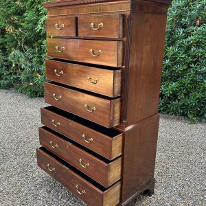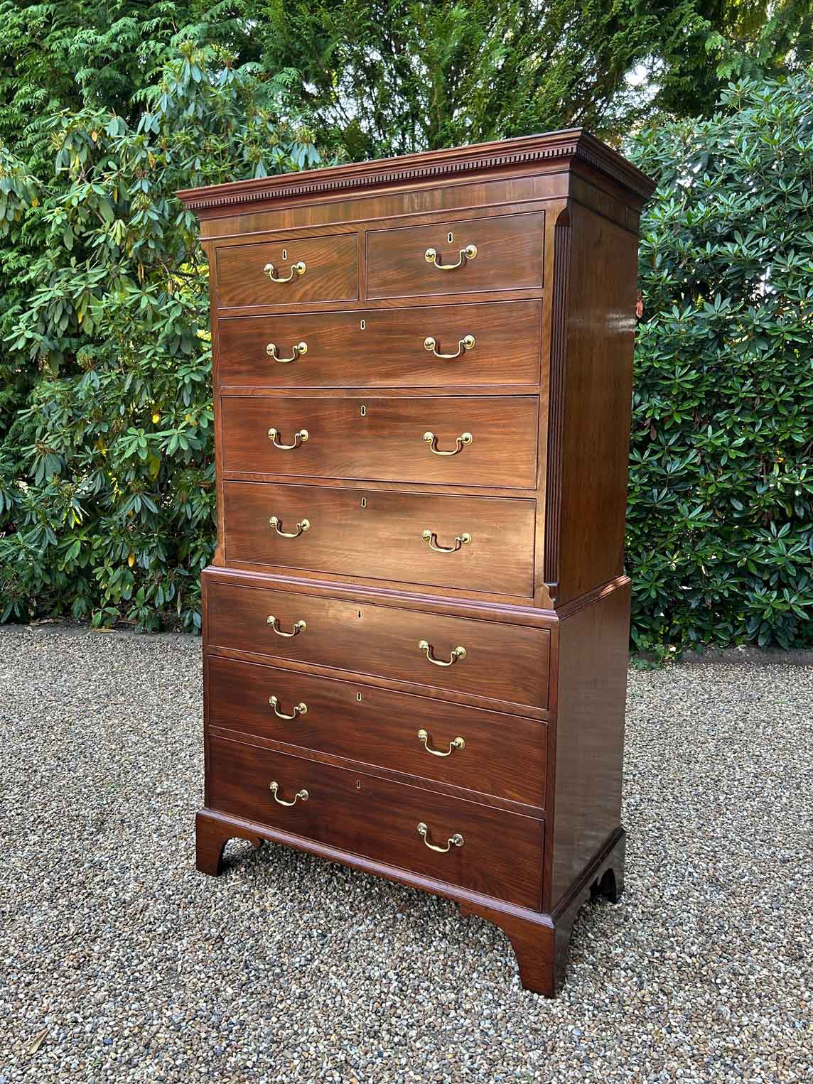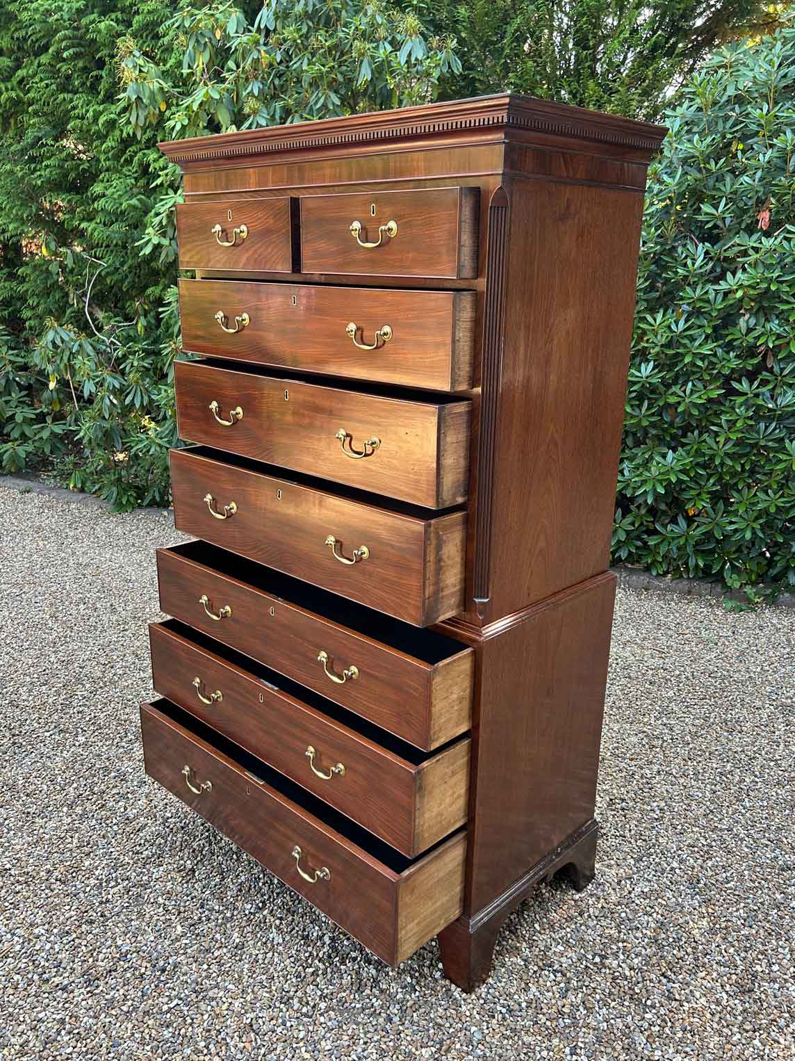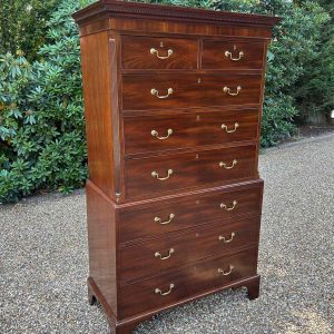 A very high quality 18th Century (George III) Mahogany Chest On Chest / Tallboy. Two short drawers at the top and six long drawers with original swan neck handles and oak lined drawers. With frieze to cornice and reeded sides. Comes apart in two separate sections on original bracket feet.