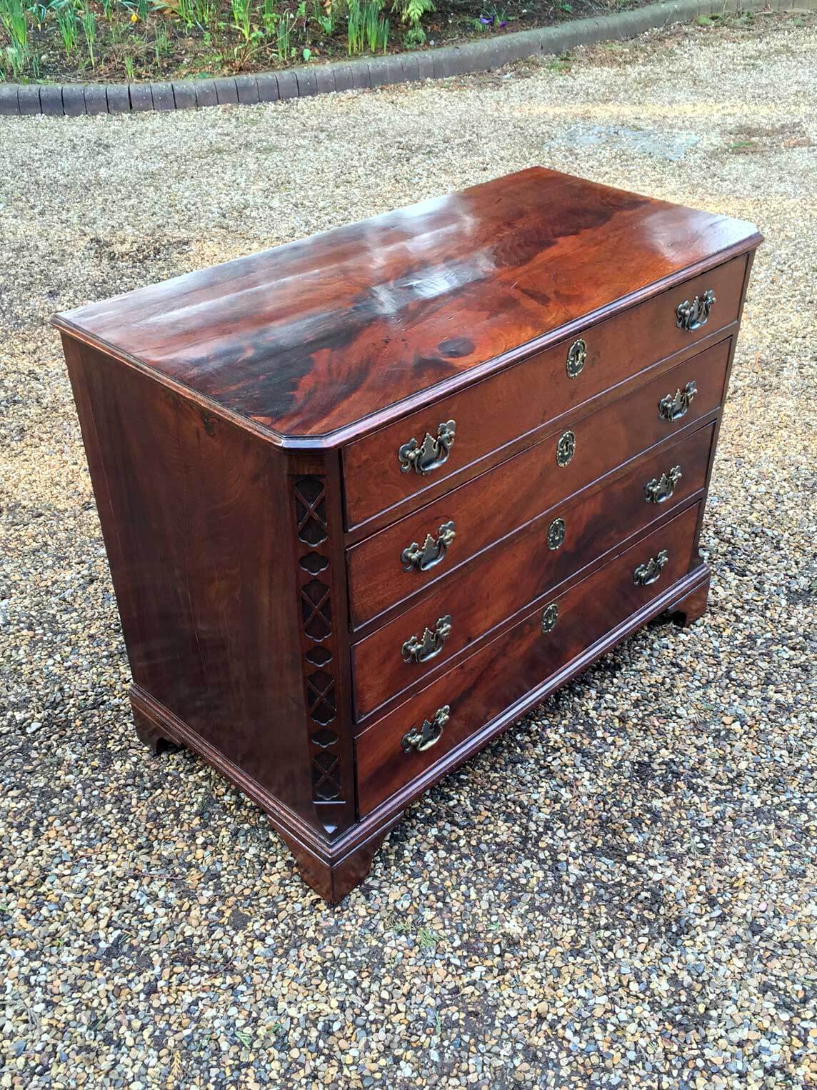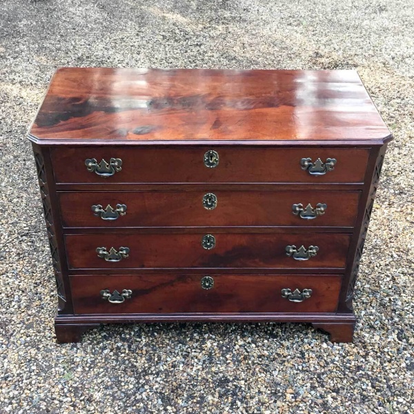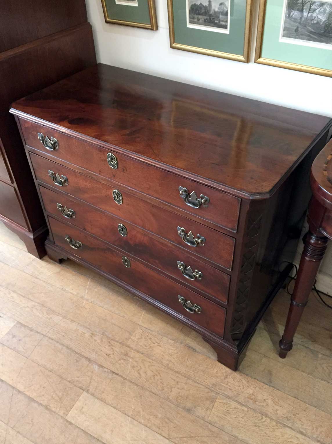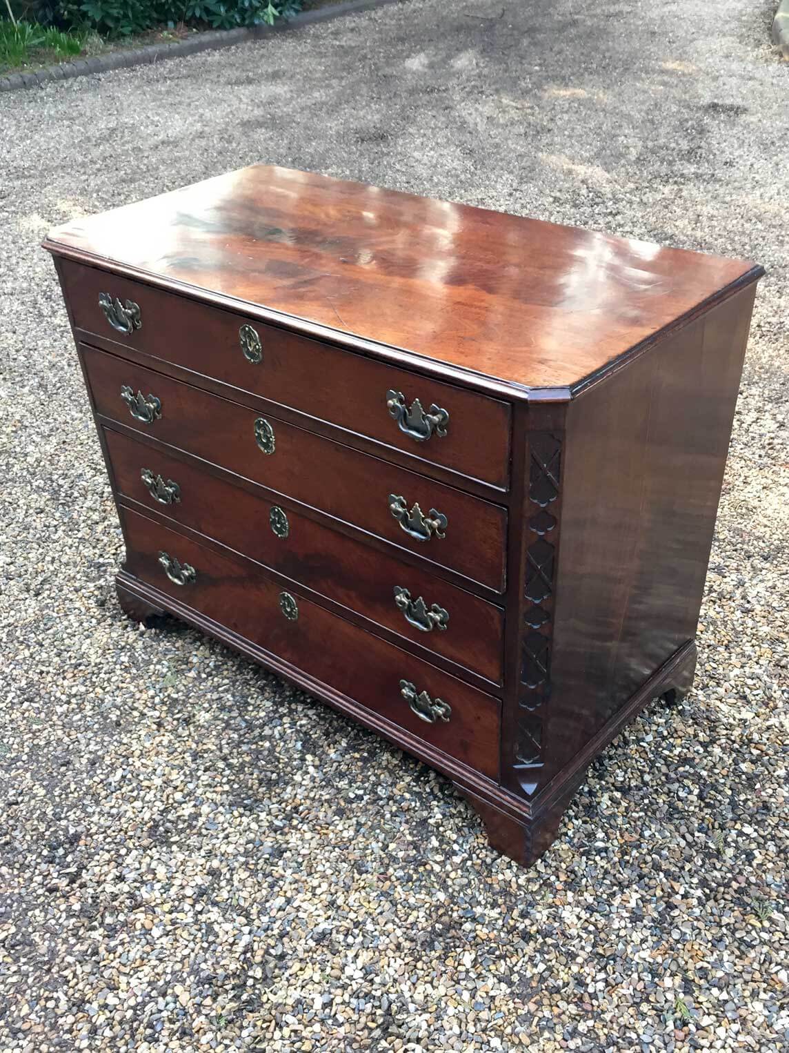 Gerogian Mahogany Chest Of Drawers with incise carving to the sides. Four grauated long drawers with original brass handles, raised on bracket base.