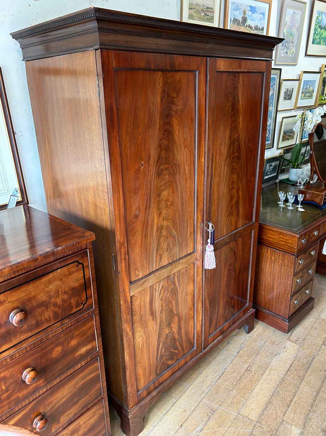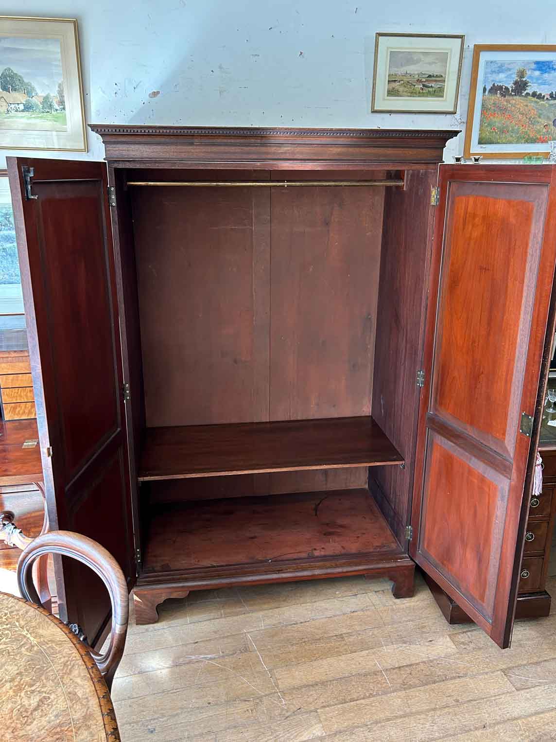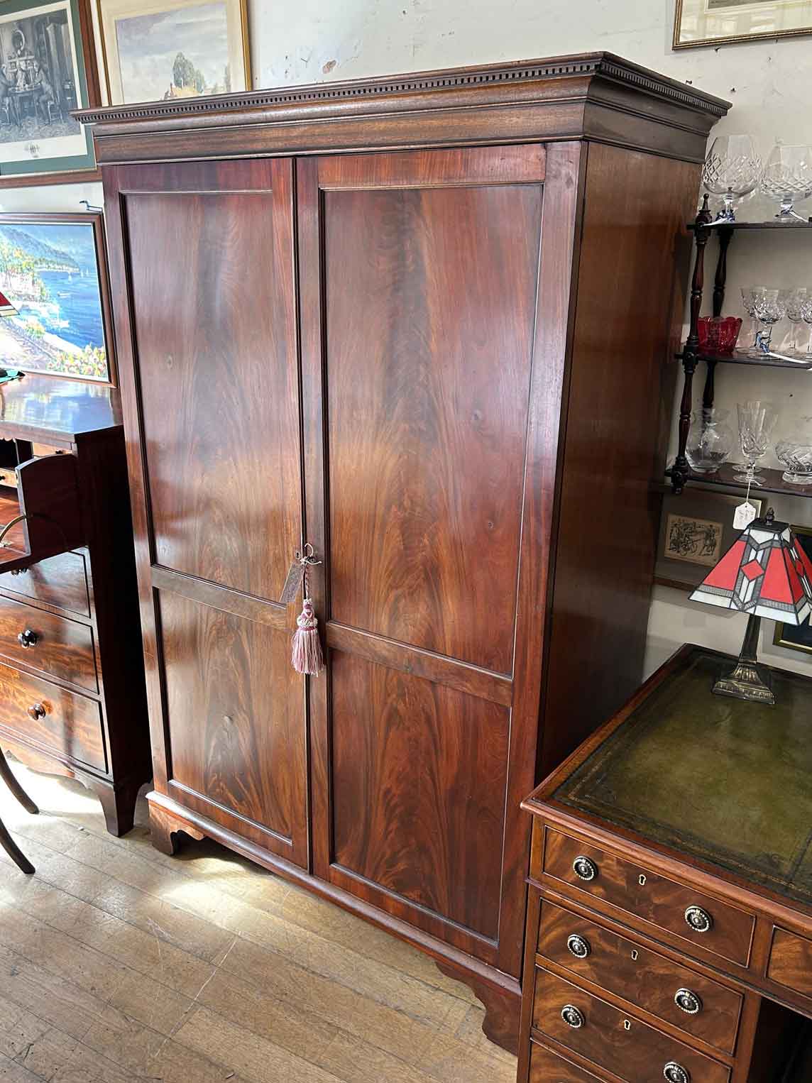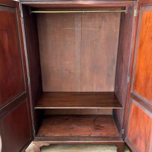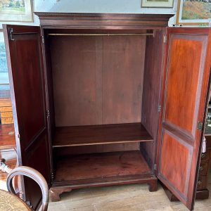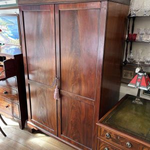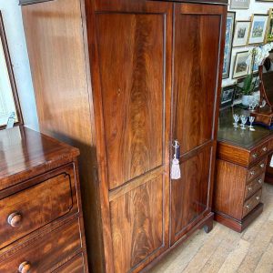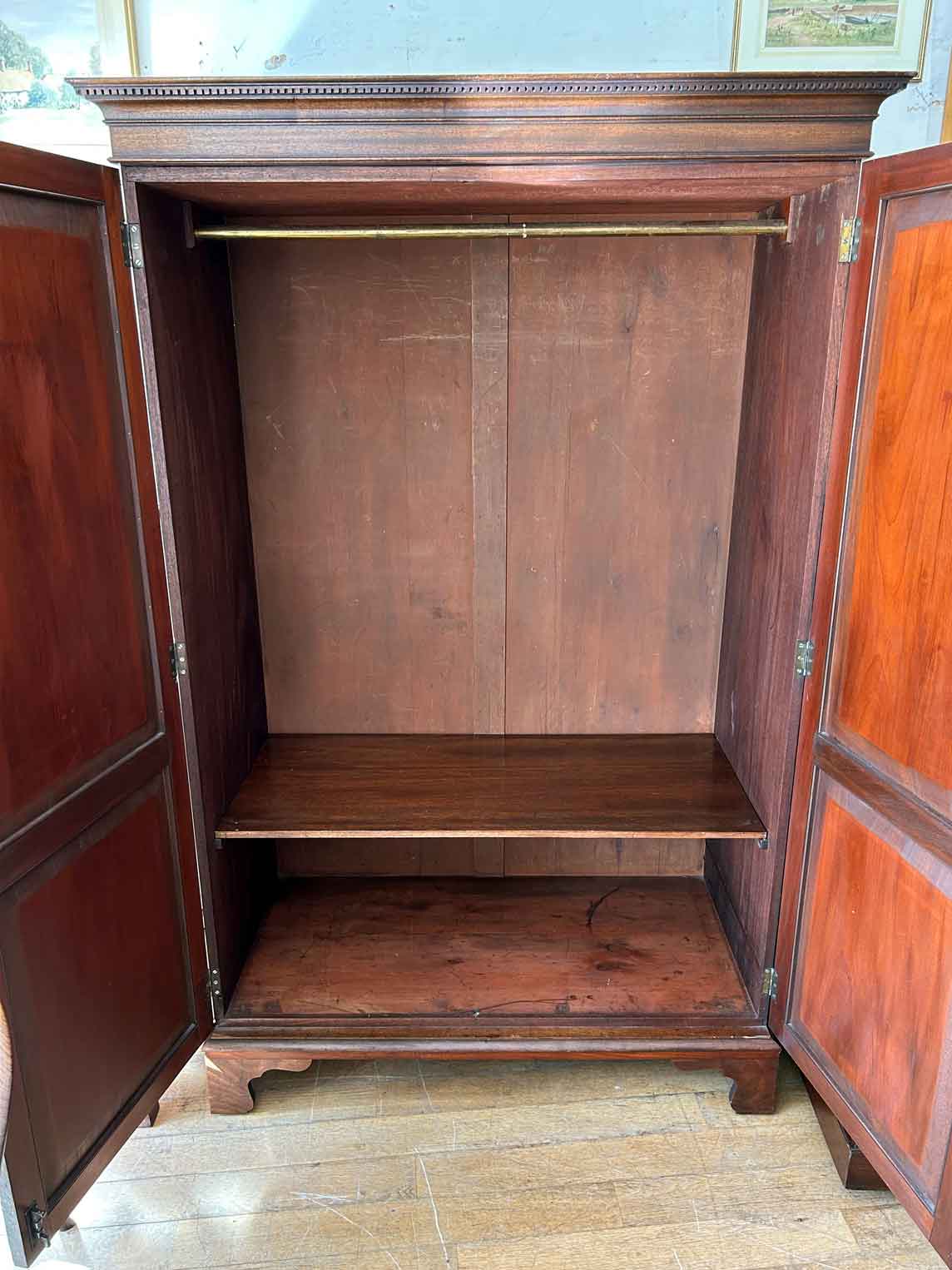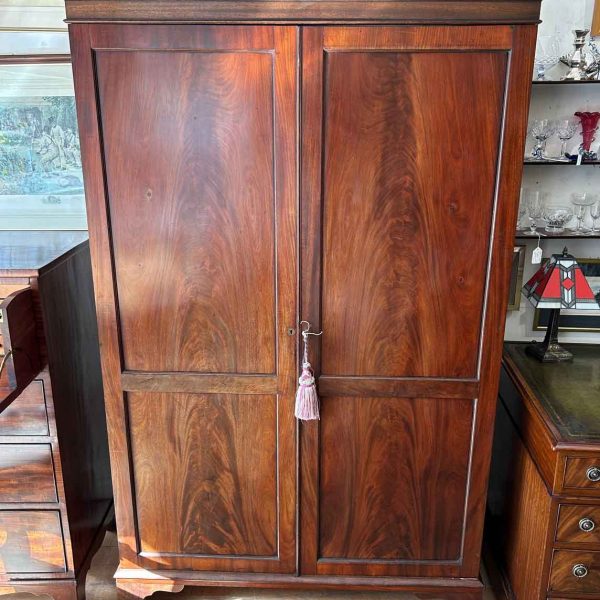 Georgian Mahogany Wardrobe with two long panelled doors, hanging space inside with a freeze cornice and working key.