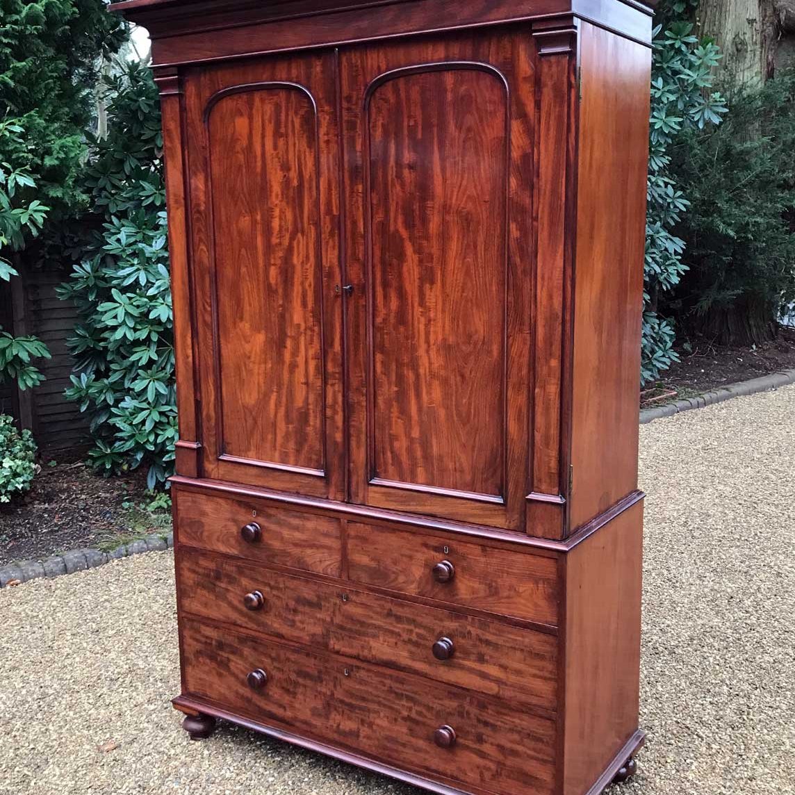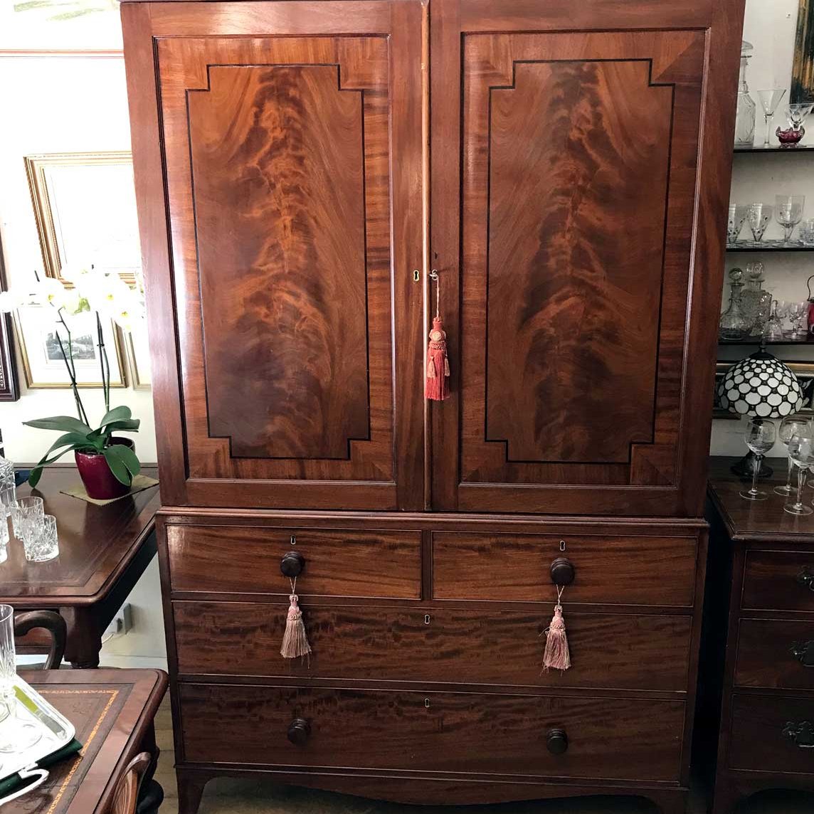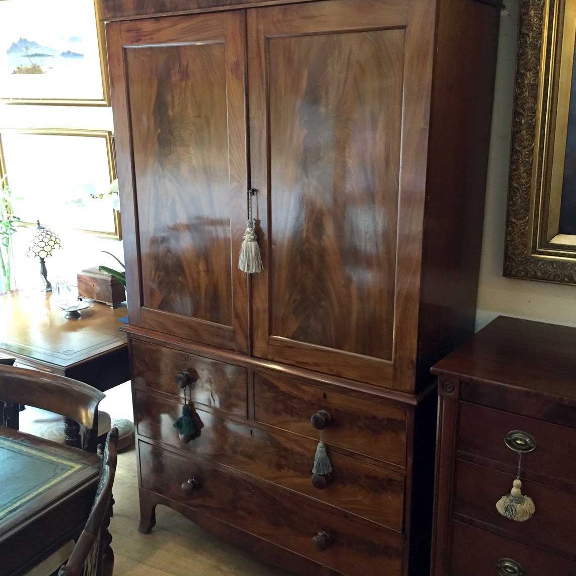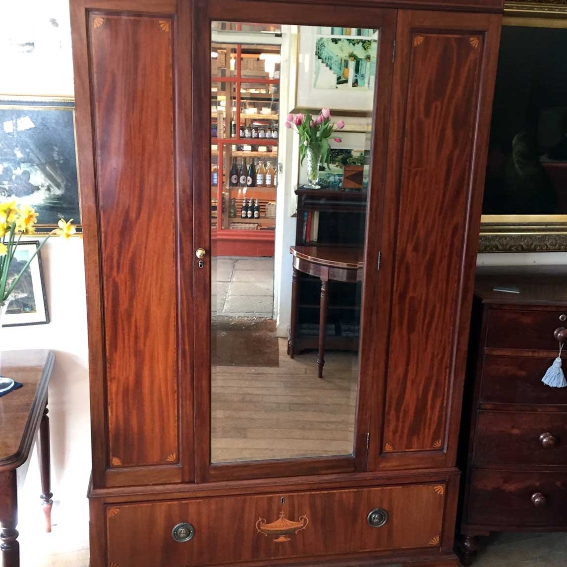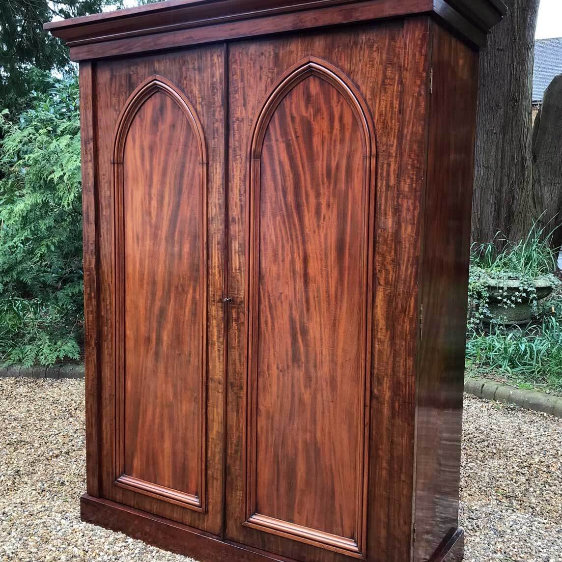 Georgian Mahogany Wardrobe with two long panelled doors, hanging space inside with a freeze cornice and working key.