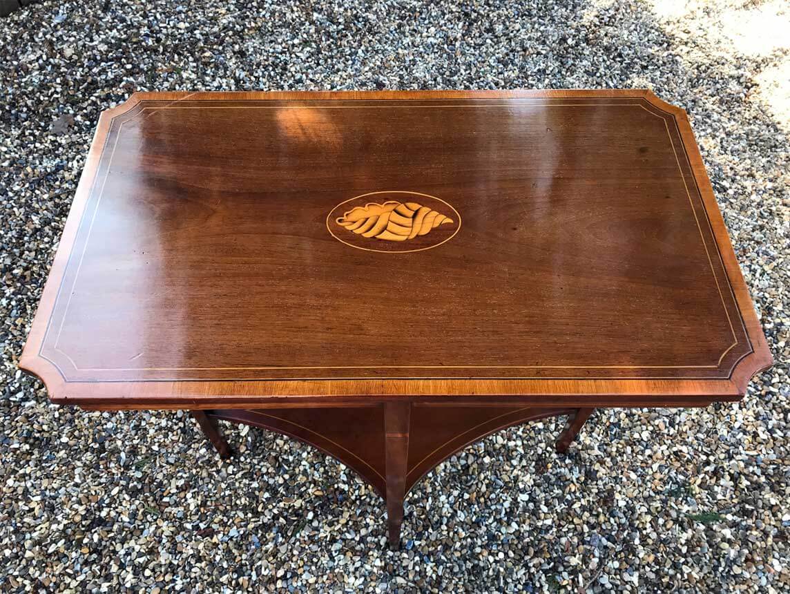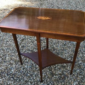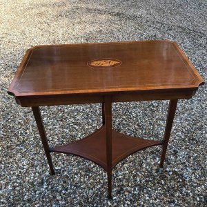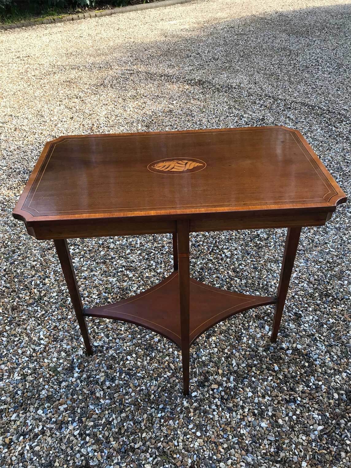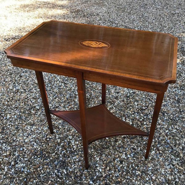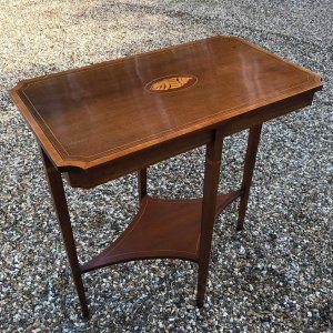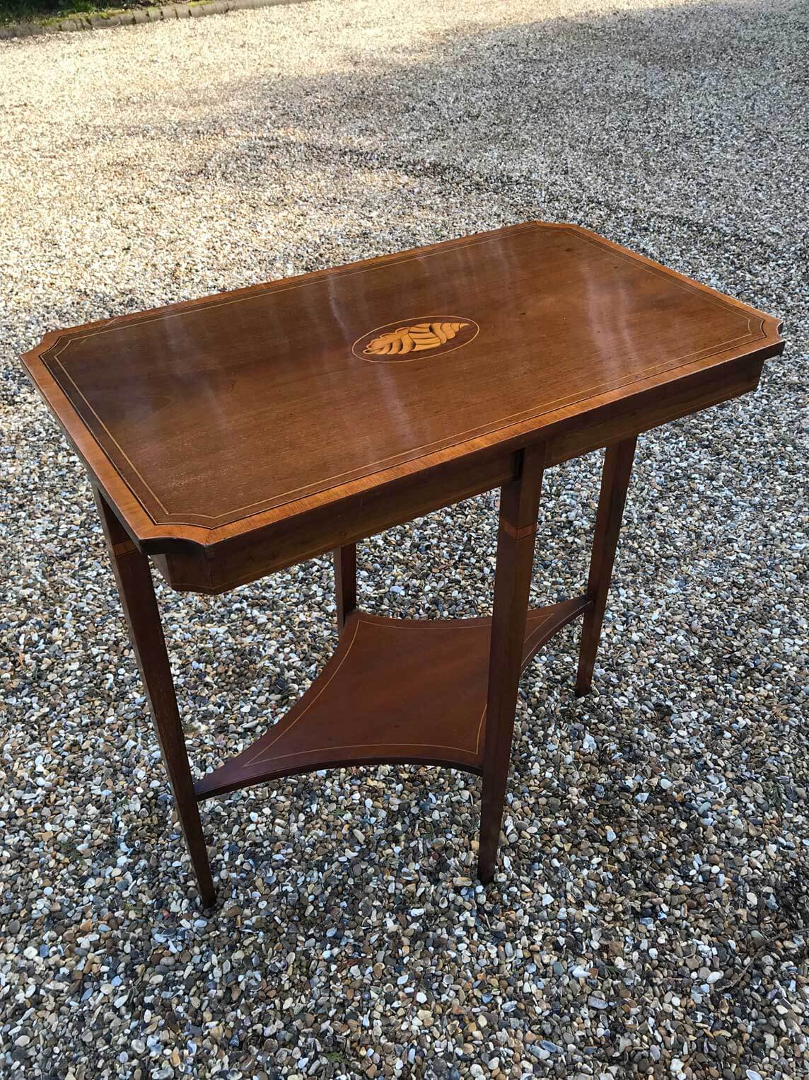 19th Century Late Victorian Inlaid Side Table with an inlaid shell decoration on the top, on four square legs with a lower shelf below.