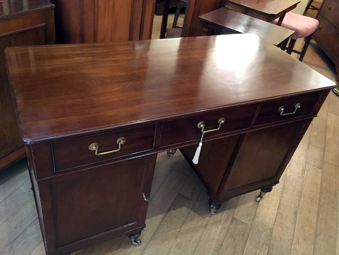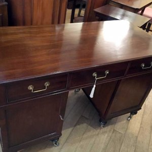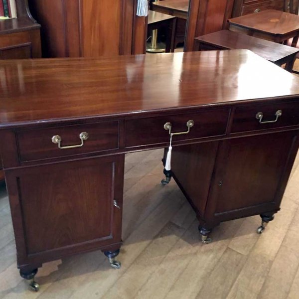 Georgian Mahogany Kneehole Desk with three top drawers and two cupboards. Brass swan neck handles and castors on turned legs to base.