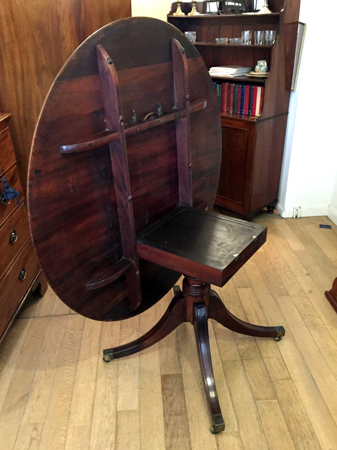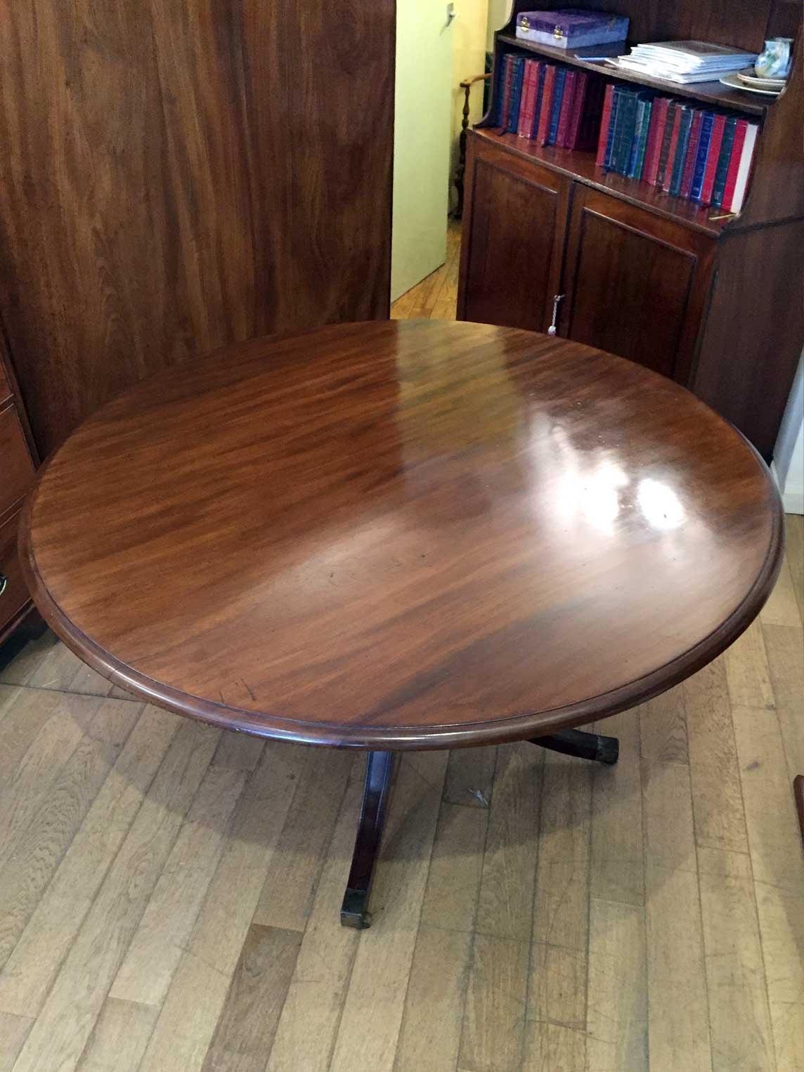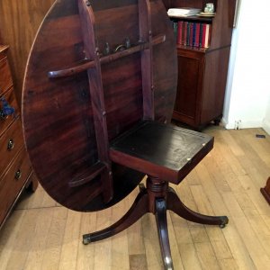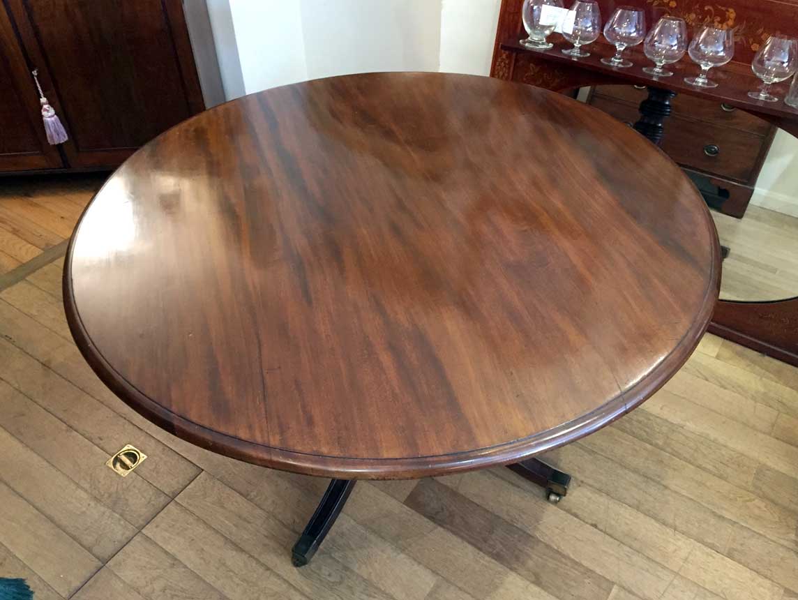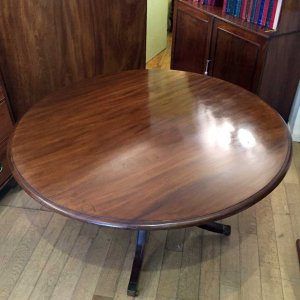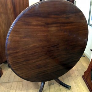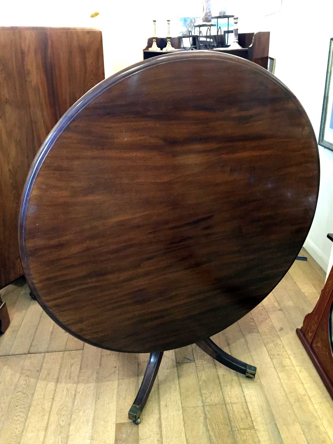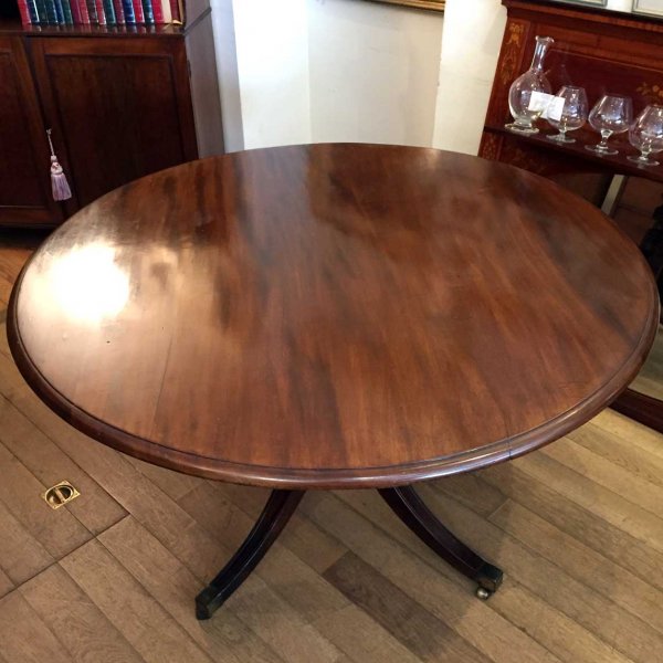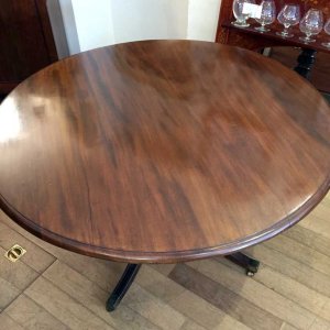 The Victorian Mahogany Circular Tilt Top Breakfast Table above a turned baluster column, raised on four splayed legs with brass caps and castors.