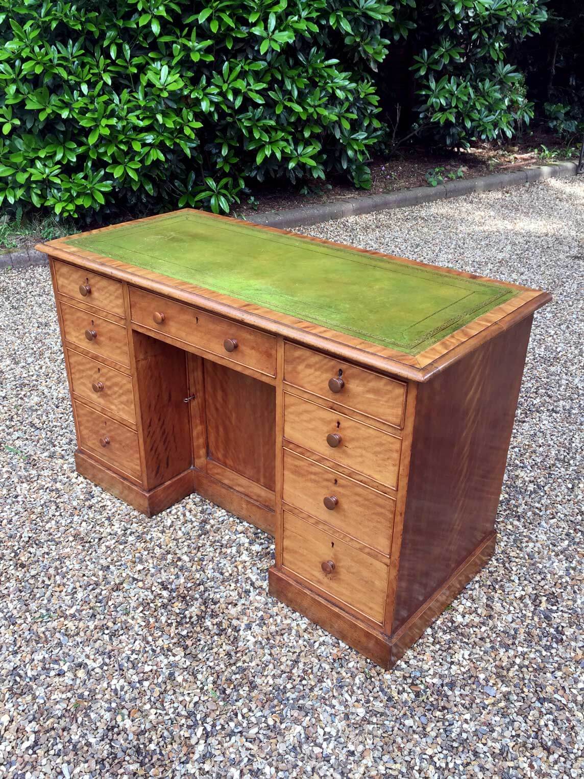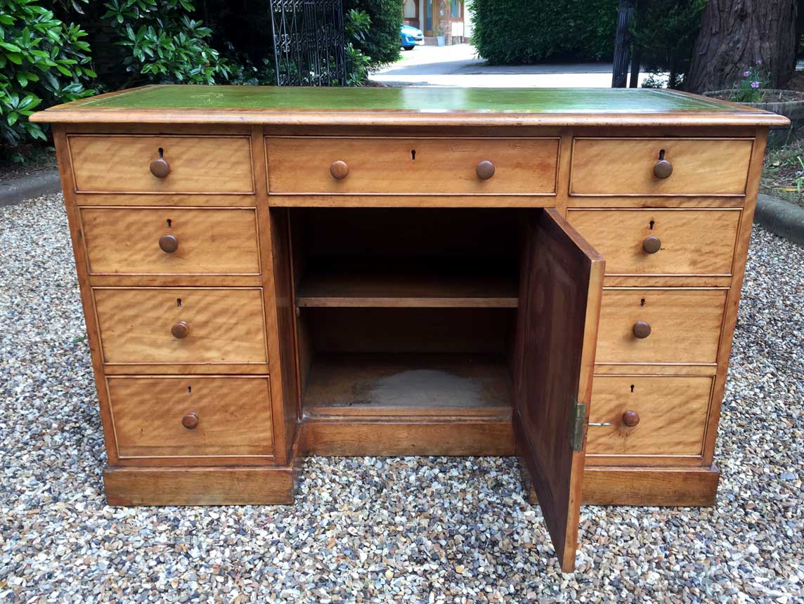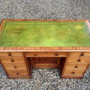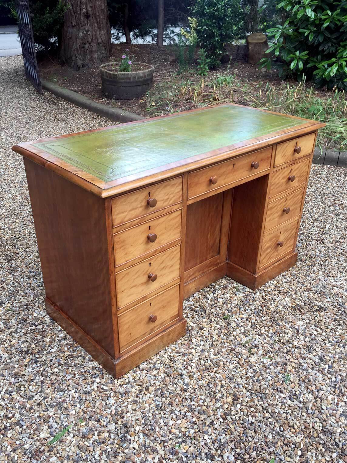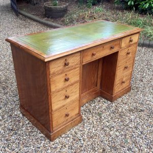 19th Century Victorian Satinwood Kneehole Desk with oak lined drawers and wooden bun handles, with green leather writing surface and has a original panelled back.