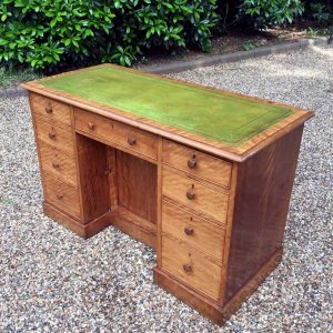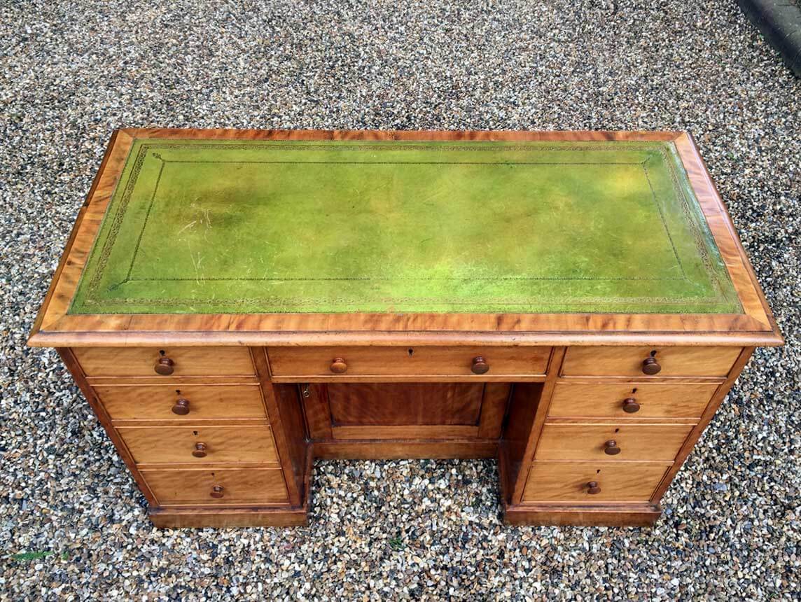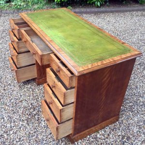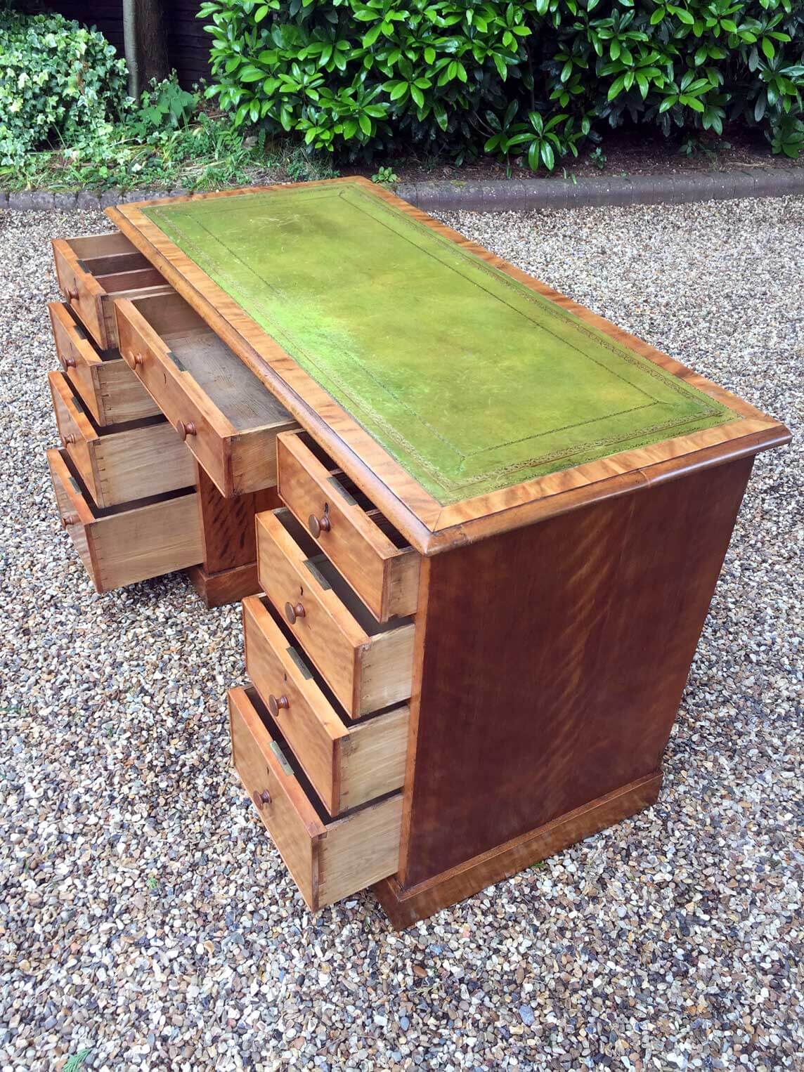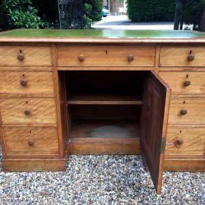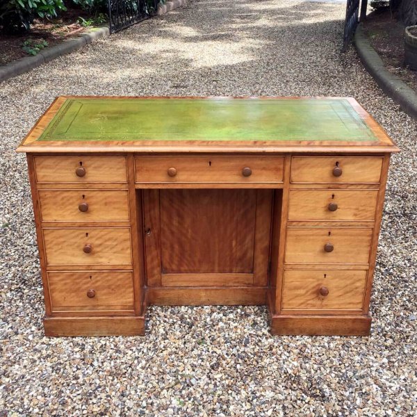 19th Century Victorian Satinwood Kneehole Desk with oak lined drawers and wooden bun handles, with green leather writing surface and has a original panelled back.