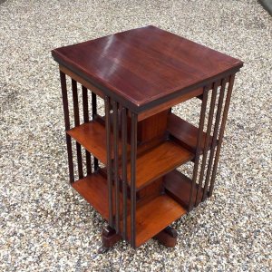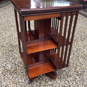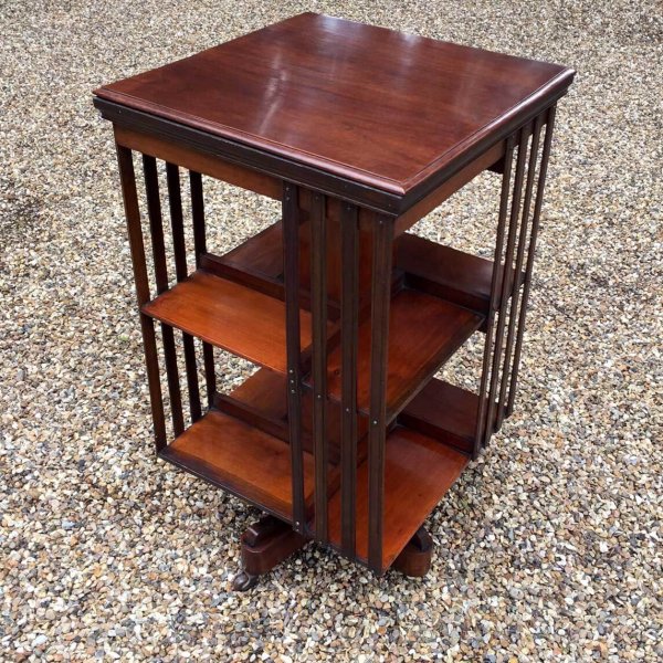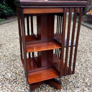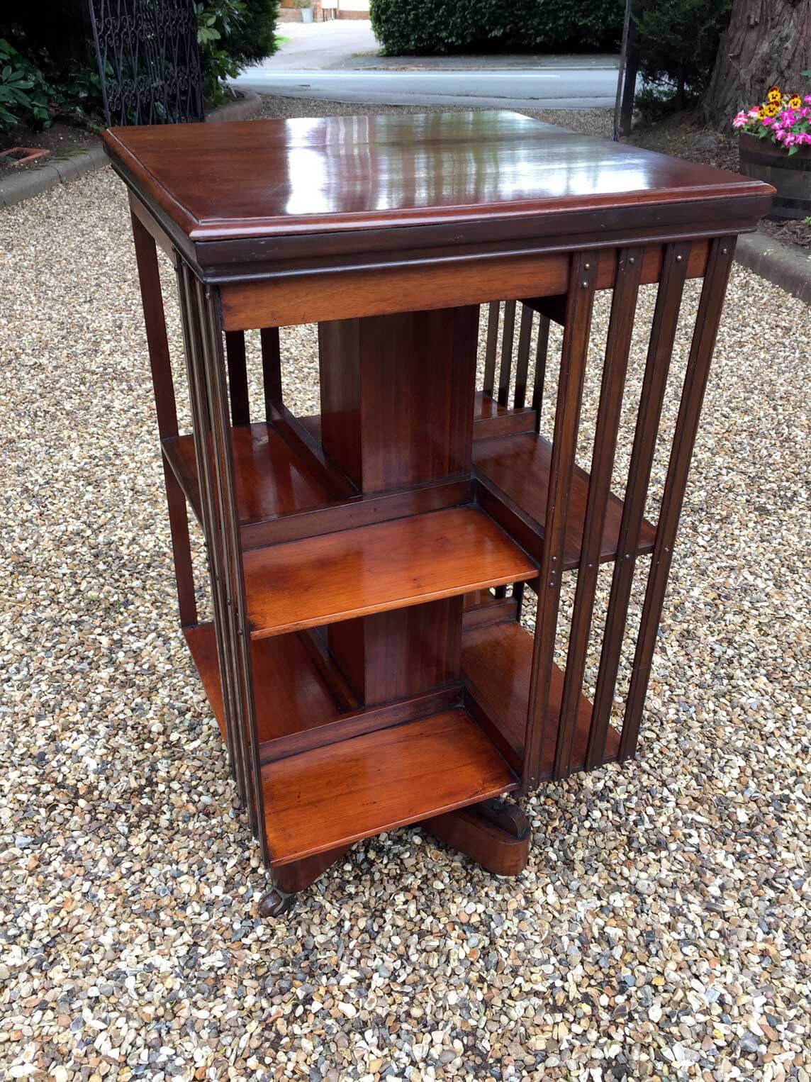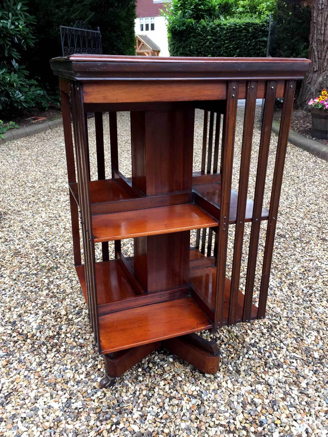 19th Century Mahogany Victorian Revolving Bookcase has two tiers of book storage and four vertical mahogany slats to each side and the revolving platform base is raised on four casters.