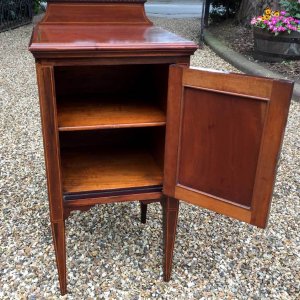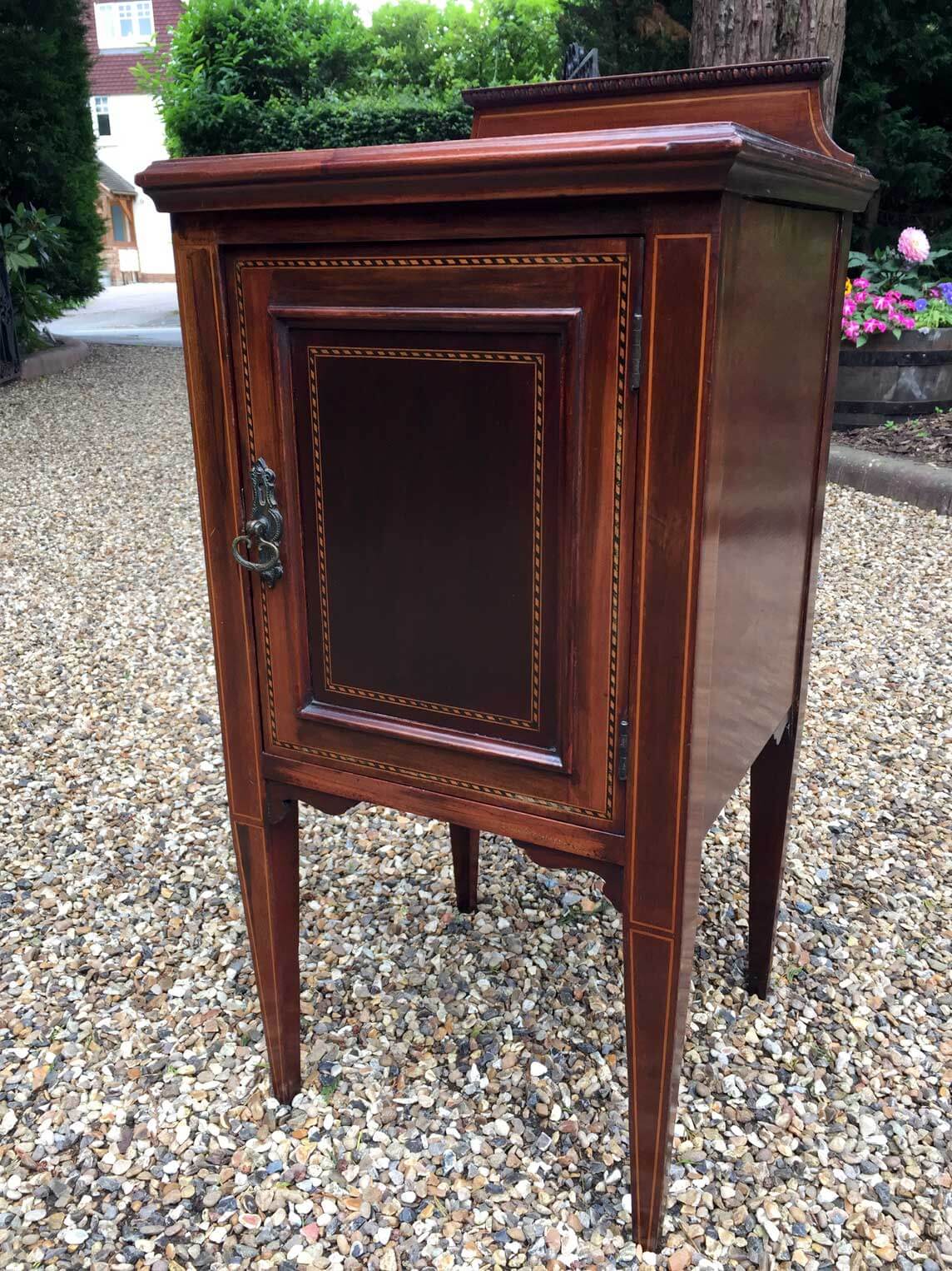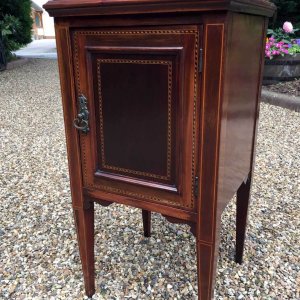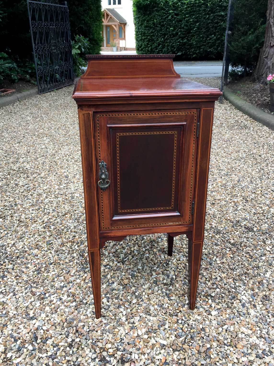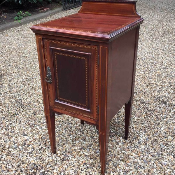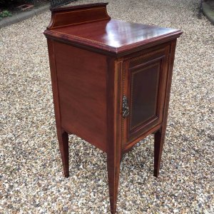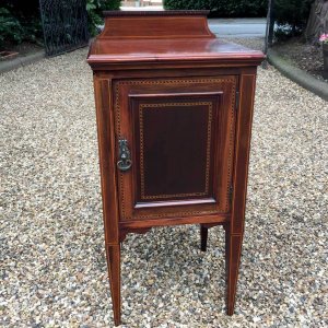 An Edwardian solid Mahogany Inlaid Bedside Cabinet with decorative inlay throughout and an cupboard that opens to a interior shelf.