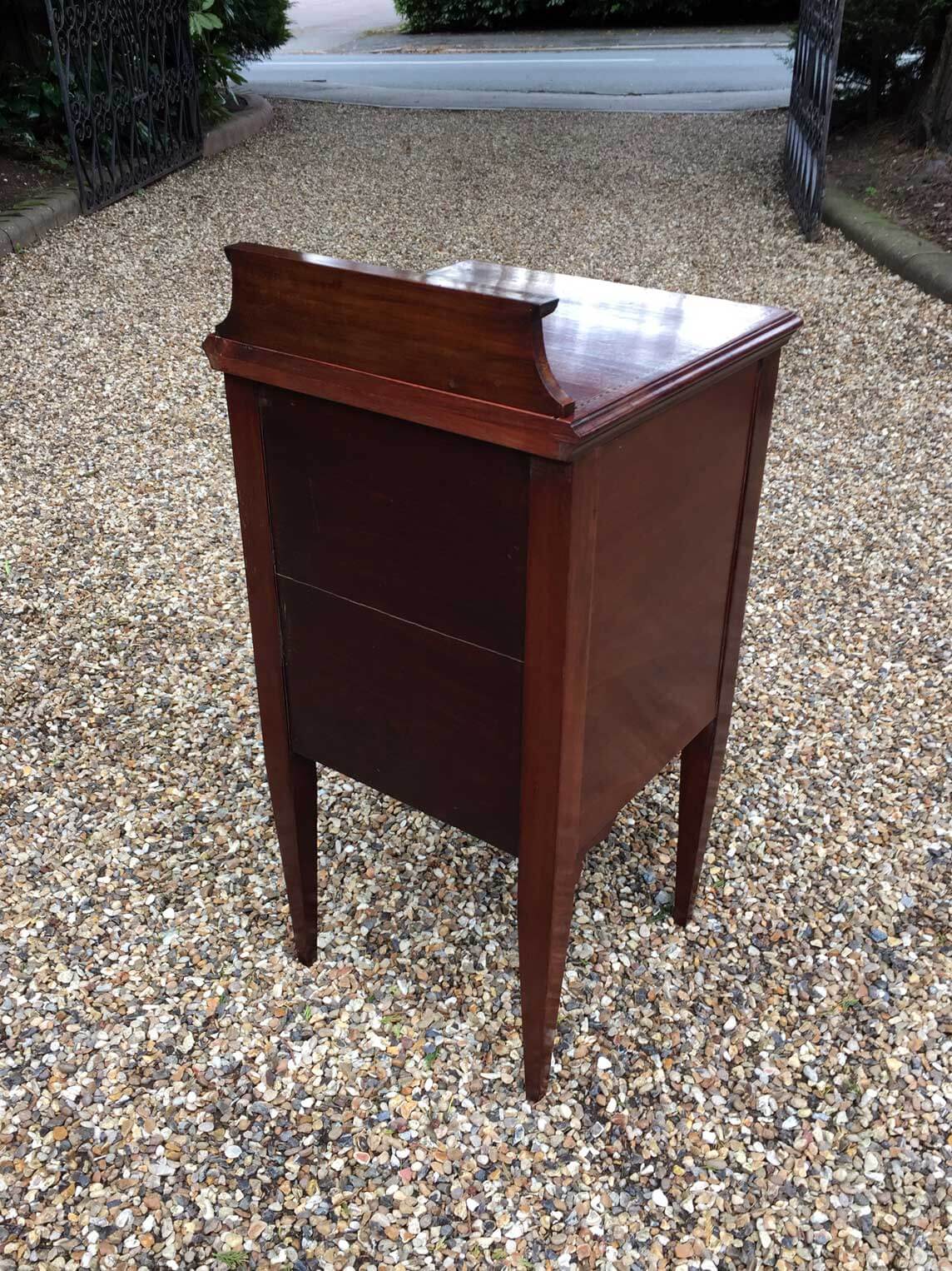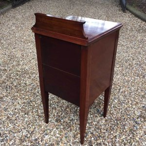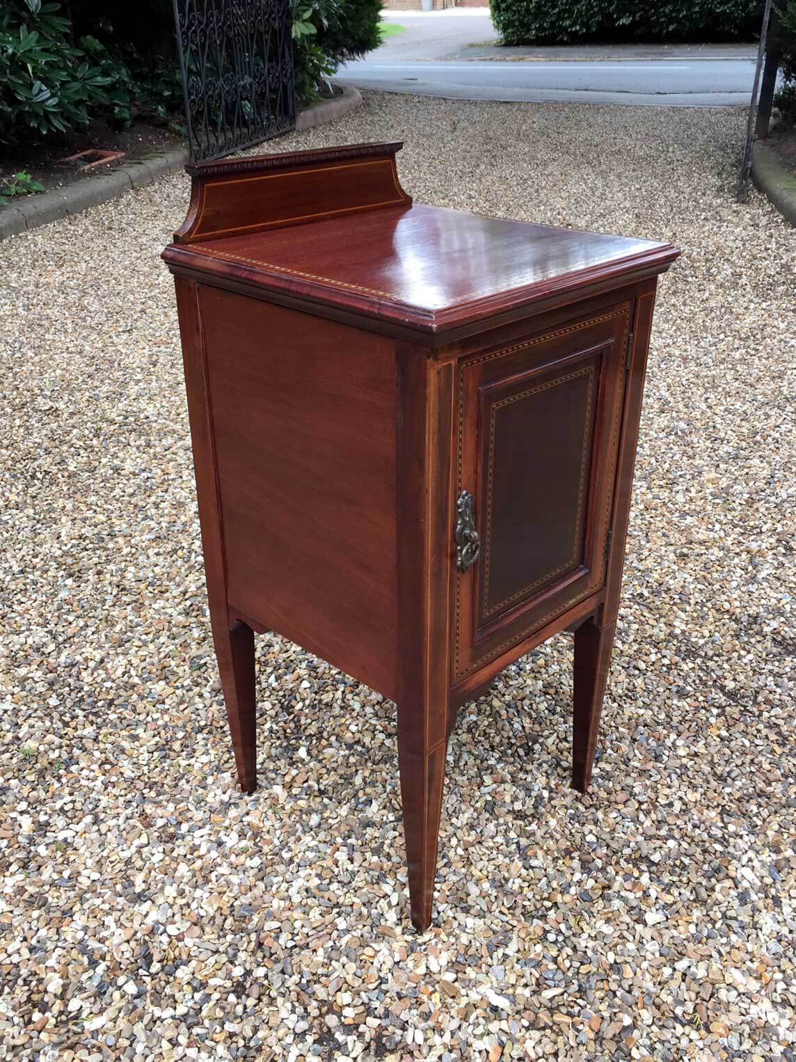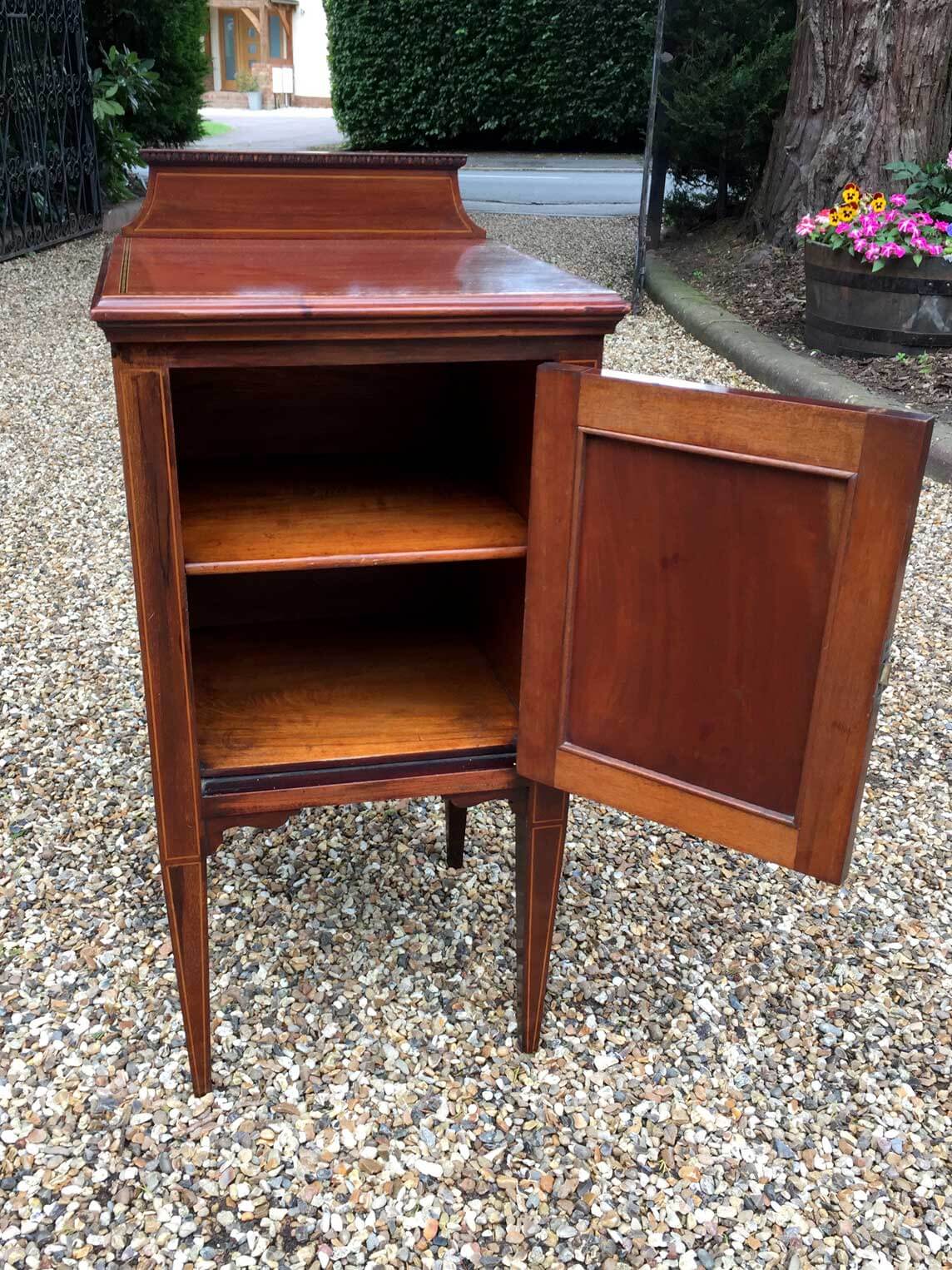 An Edwardian solid Mahogany Inlaid Bedside Cabinet with decorative inlay throughout and an cupboard that opens to a interior shelf.