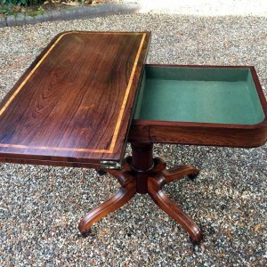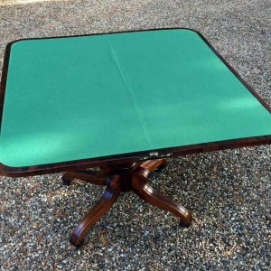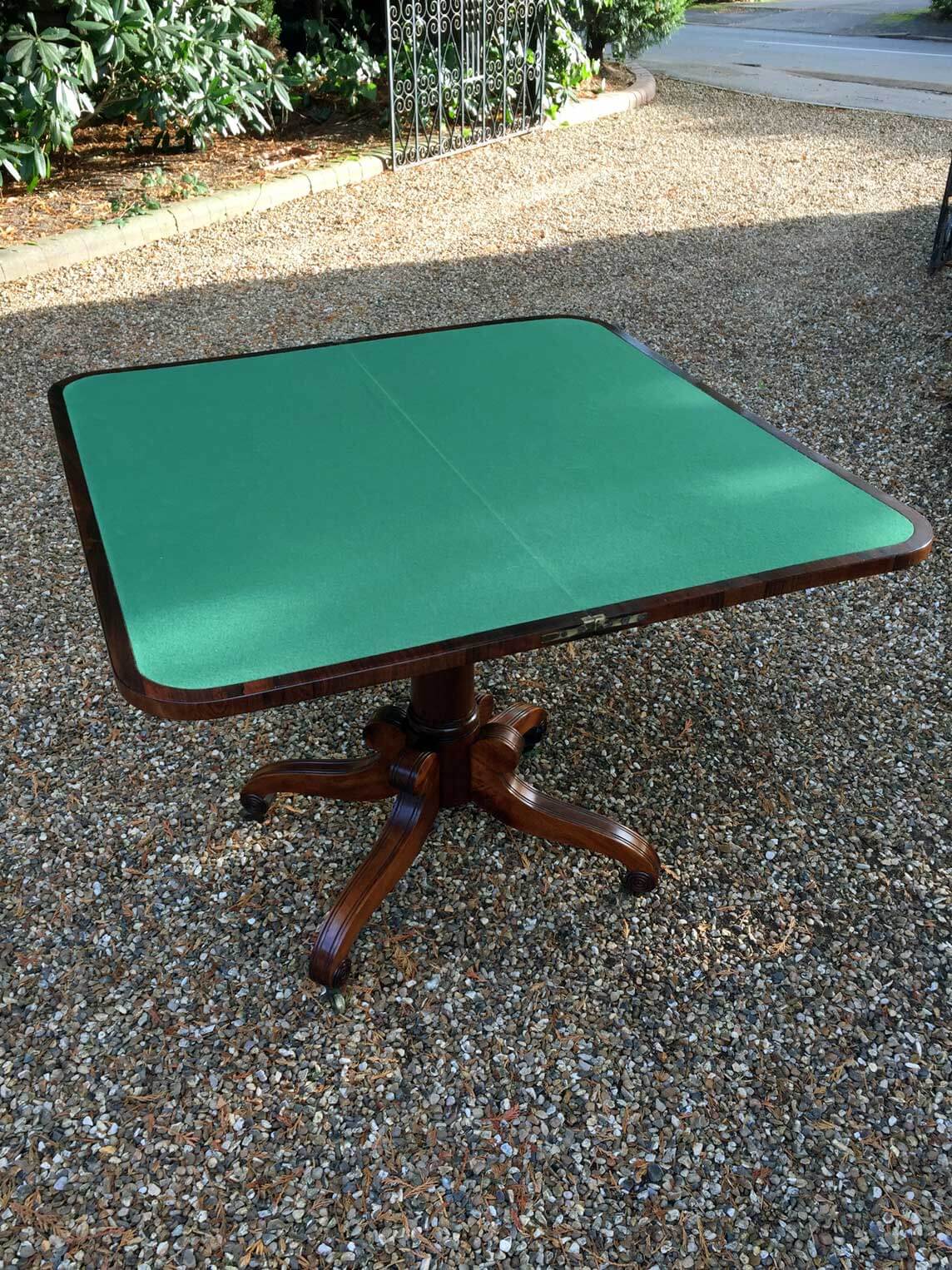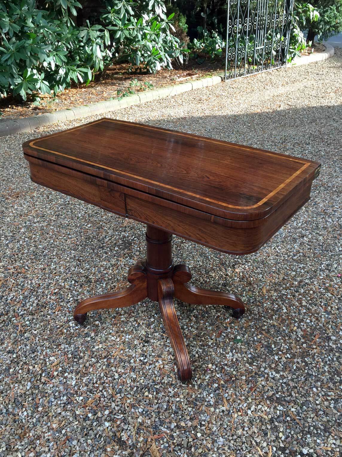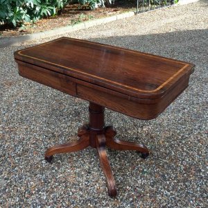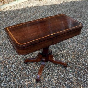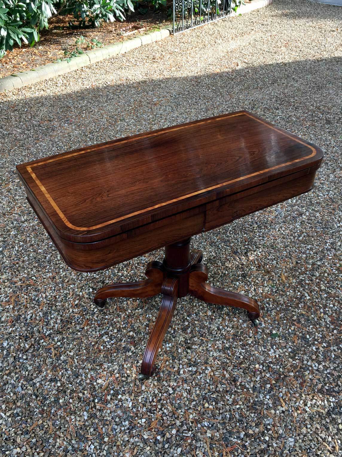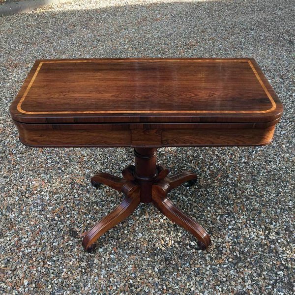 A superb quality 19th Century Regency Rosewood Card Table with beautifully figured rosewood and Satinwood inlay. The cylindrical stem which has four carved sabre shaped legs terminating in original brass swivel castors with a newly re-baized interior .