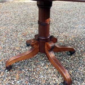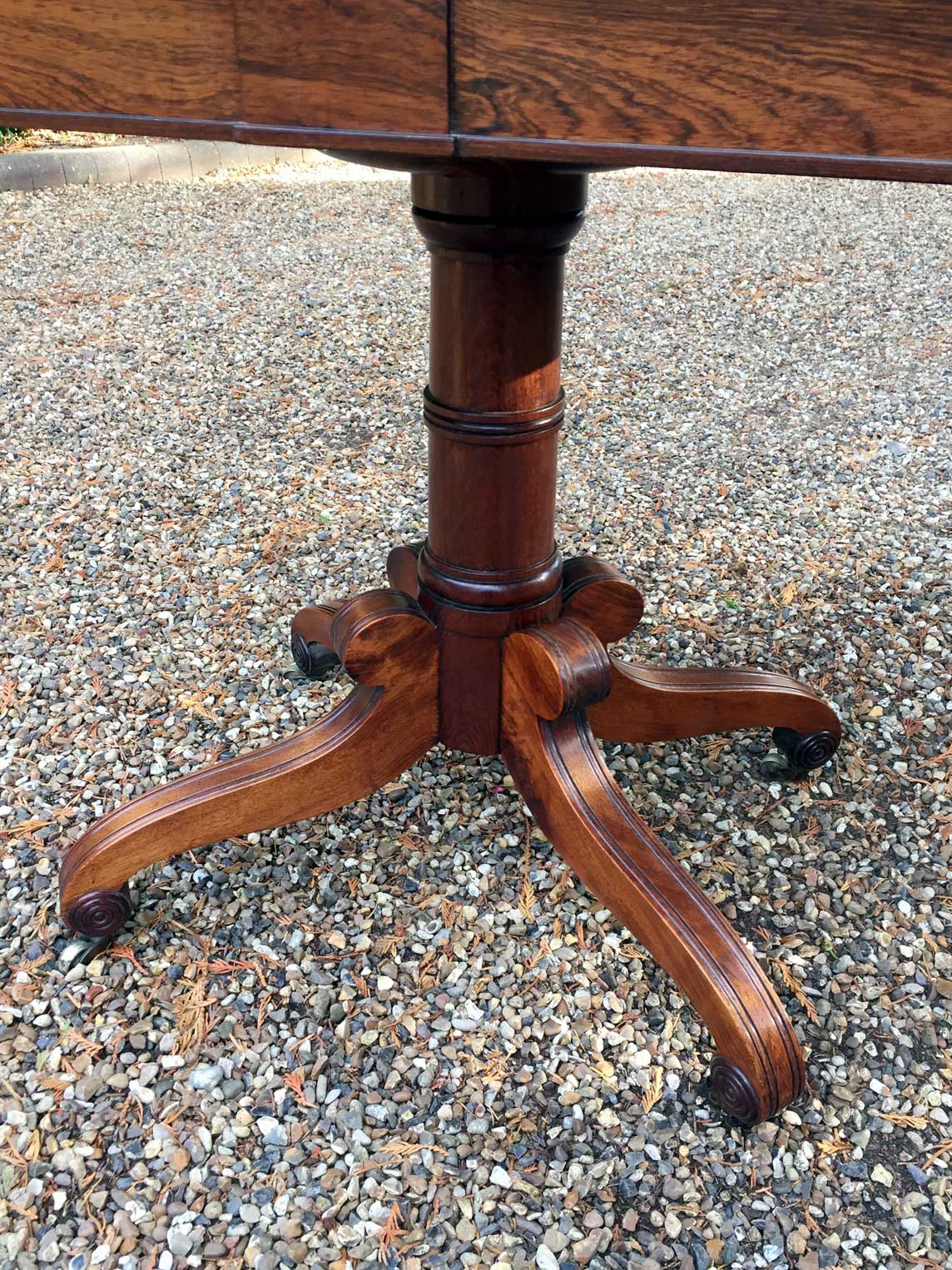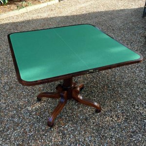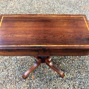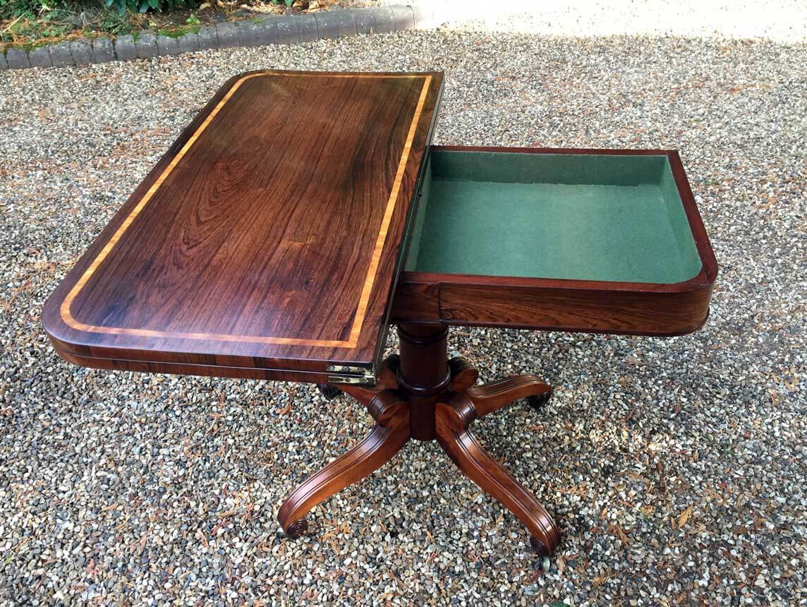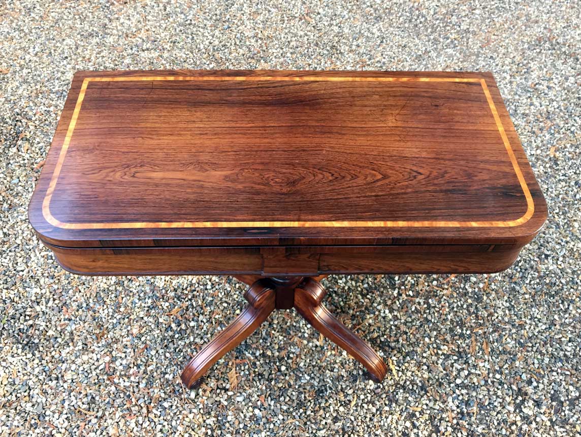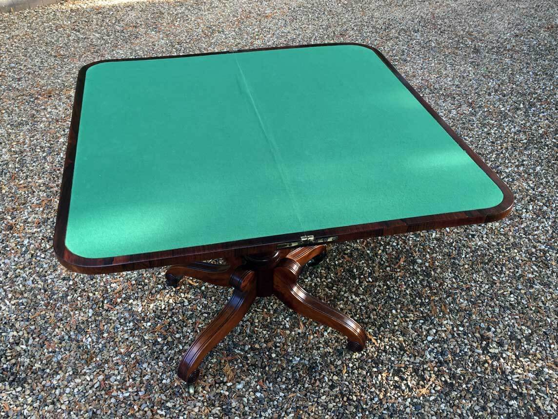 A superb quality 19th Century Regency Rosewood Card Table with beautifully figured rosewood and Satinwood inlay. The cylindrical stem which has four carved sabre shaped legs terminating in original brass swivel castors with a newly re-baized interior .