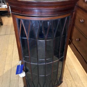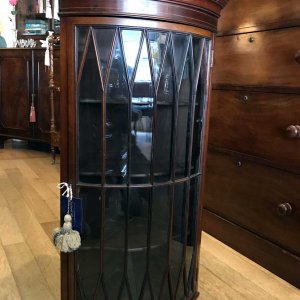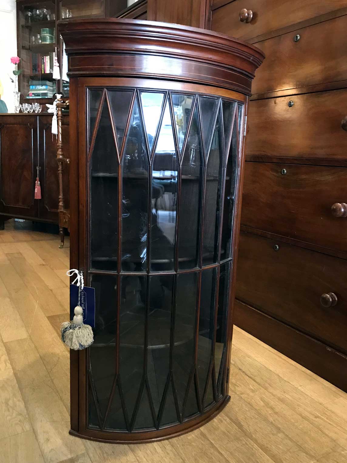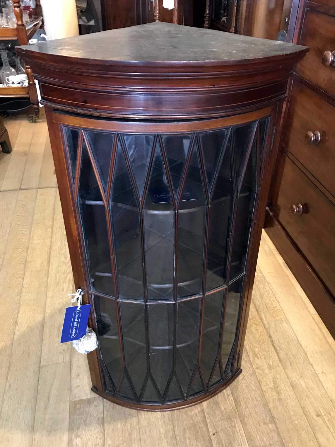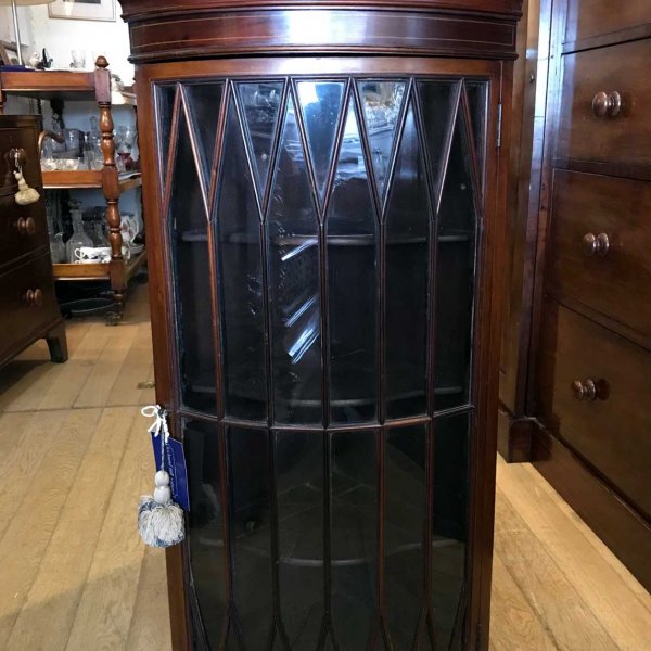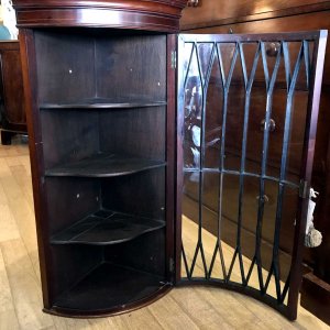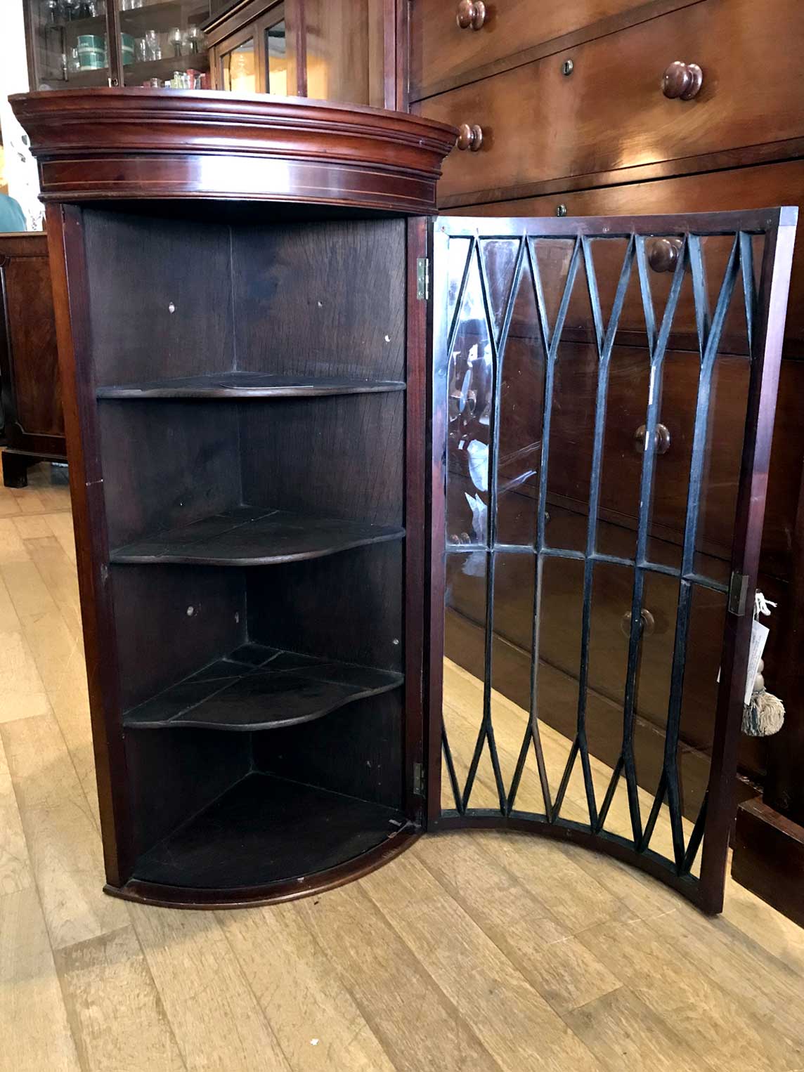 Early Edwardian Mahogany Inlaid Bow shaped Hanging Corner Cupboard with original astral glass and four shelves on the inside.