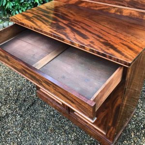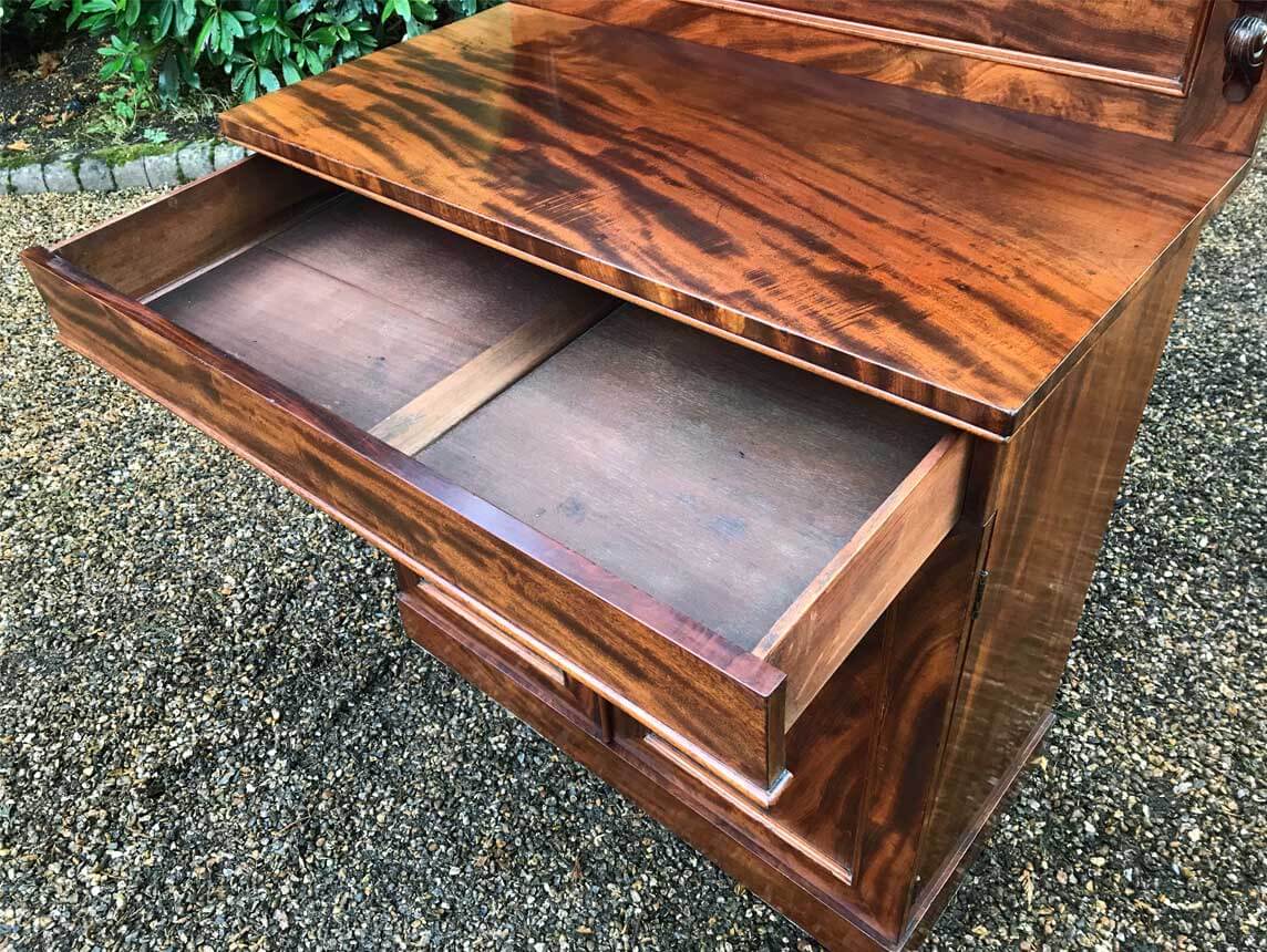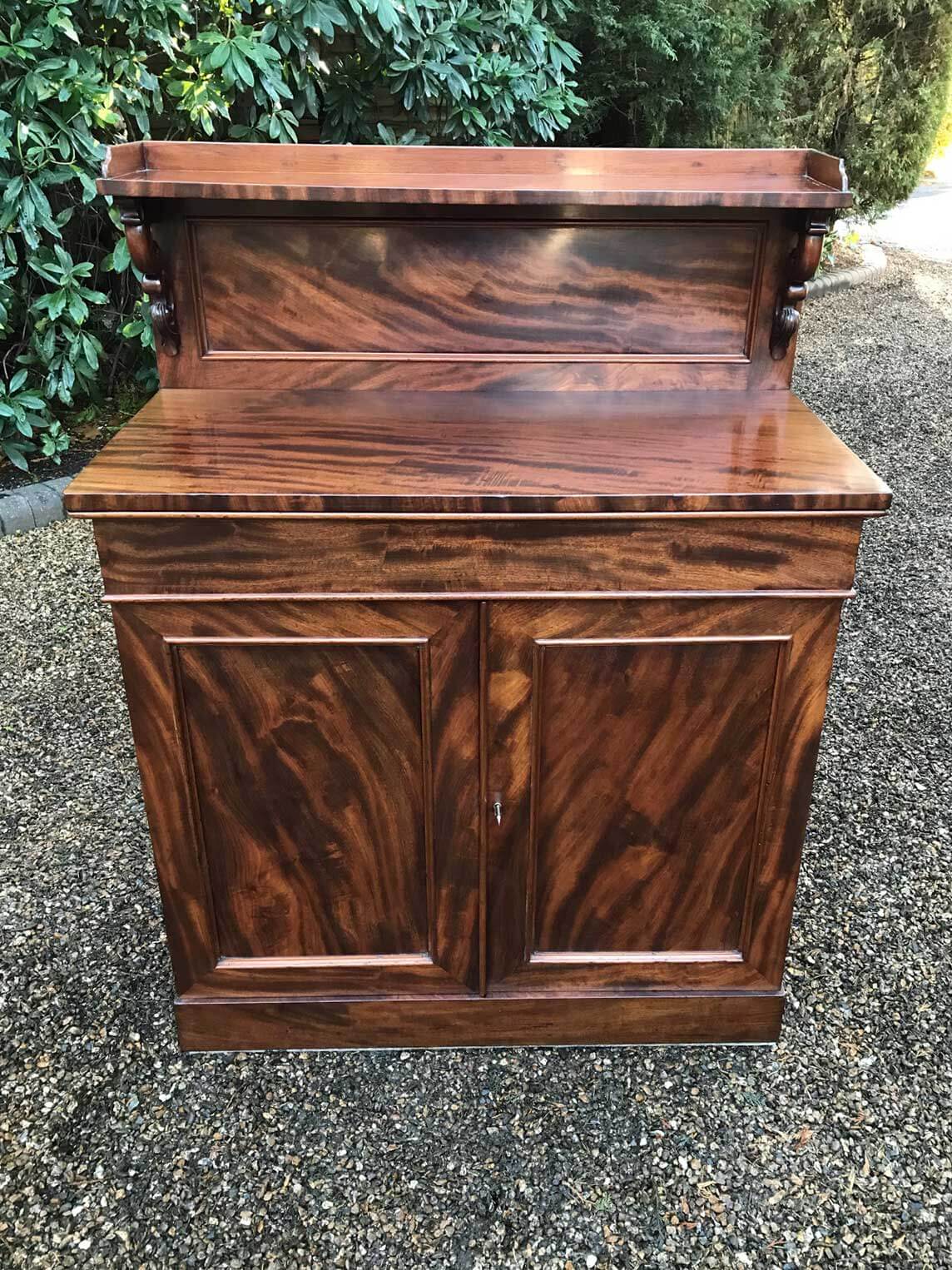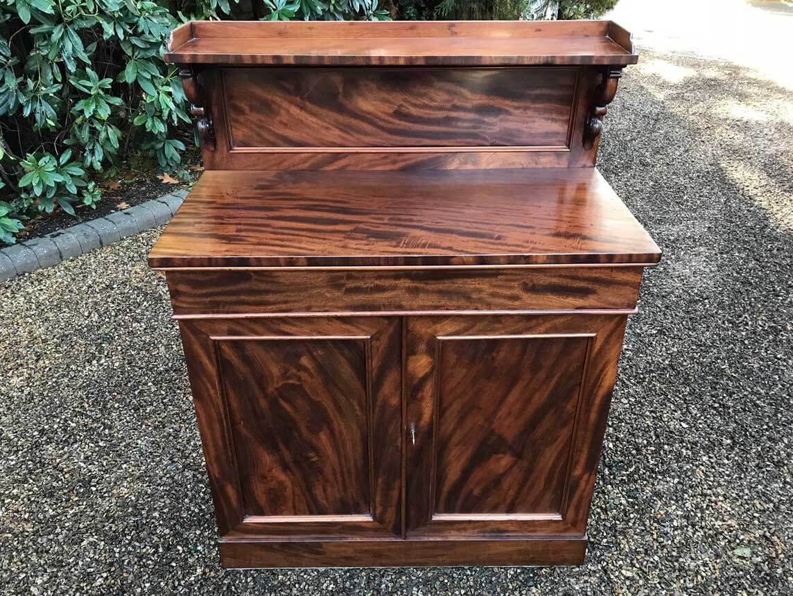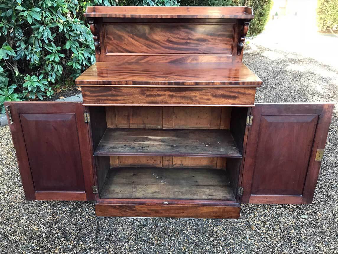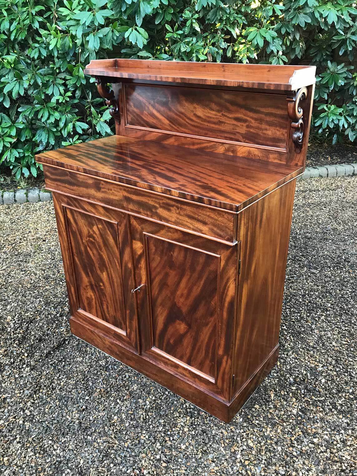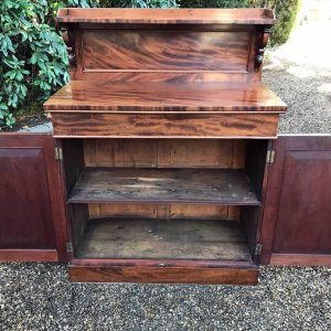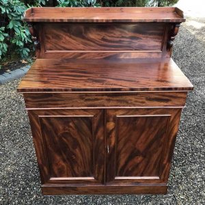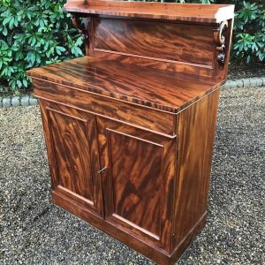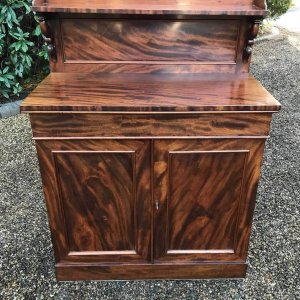 19th Century Mahogany Chiffonier with single cushion drawer and cupboard, enclosed by panel doors with a shelf on inside, supported on a plinth base.