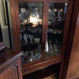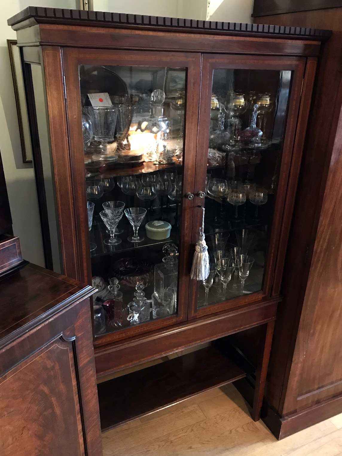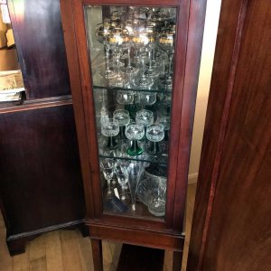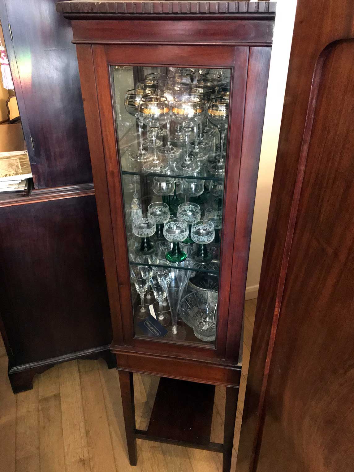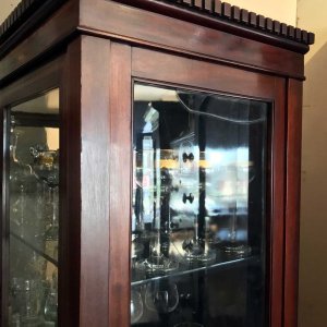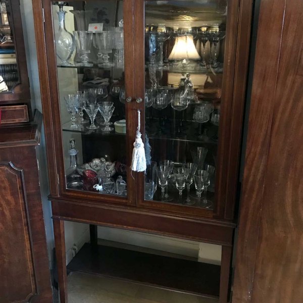 19th Century Mahogany Inlaid Victorian Display Cabinet with three glass shelves and working key on four legs and an under-teir shelf below. There is a crack on the top right hand side glass panel – please see photos for review.