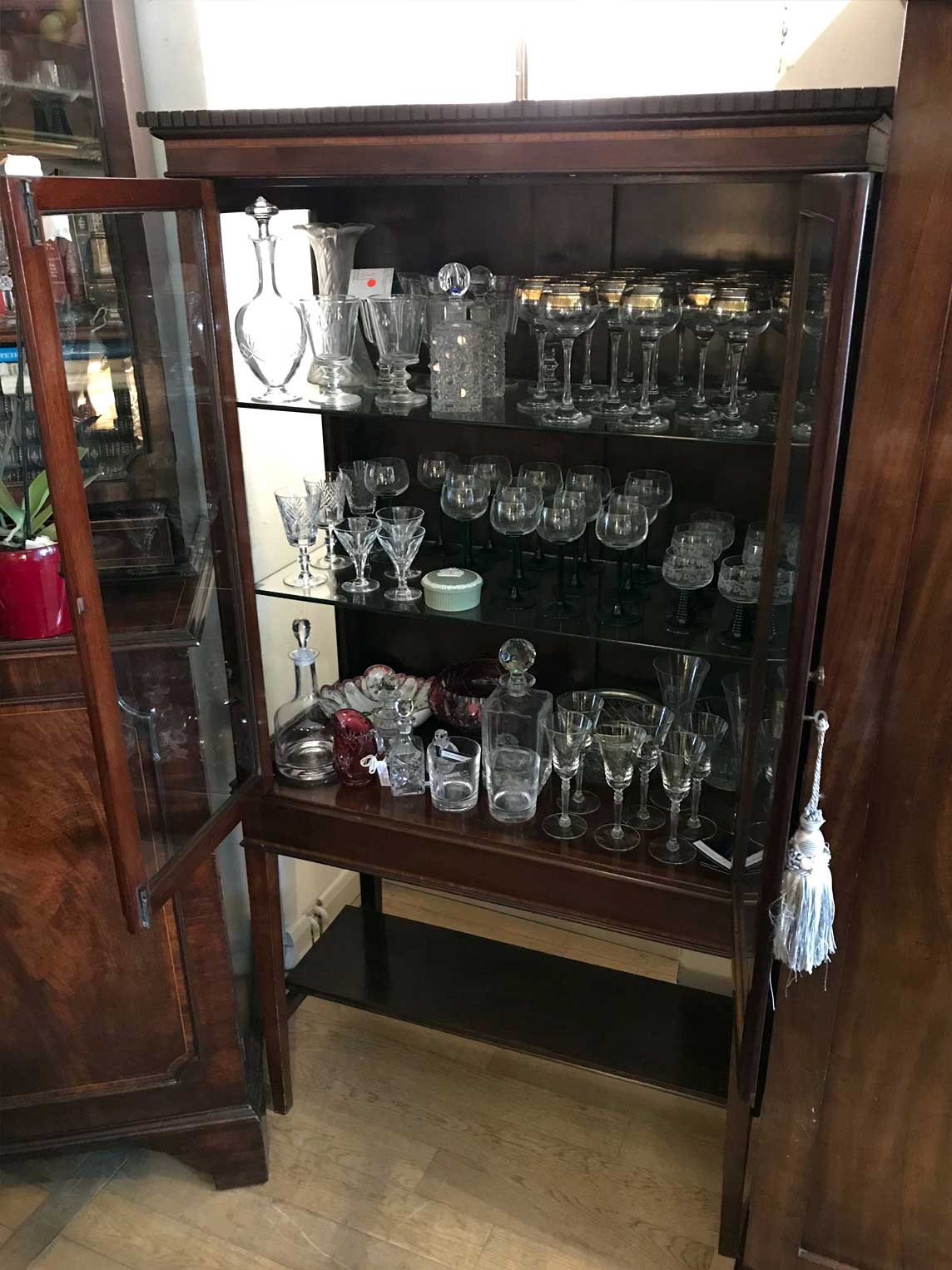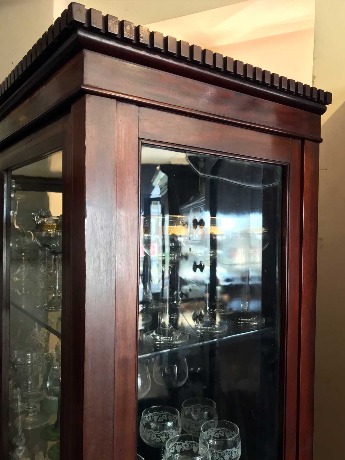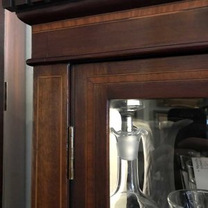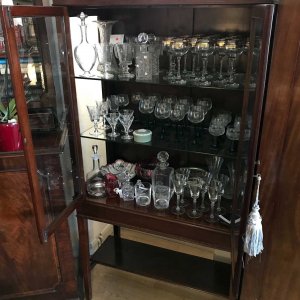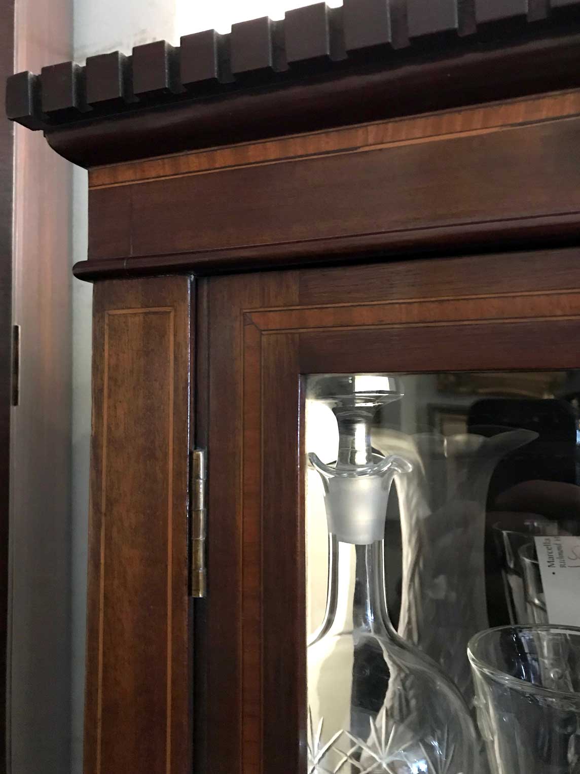 19th Century Mahogany Inlaid Victorian Display Cabinet with three glass shelves and working key on four legs and an under-teir shelf below. There is a crack on the top right hand side glass panel – please see photos for review.