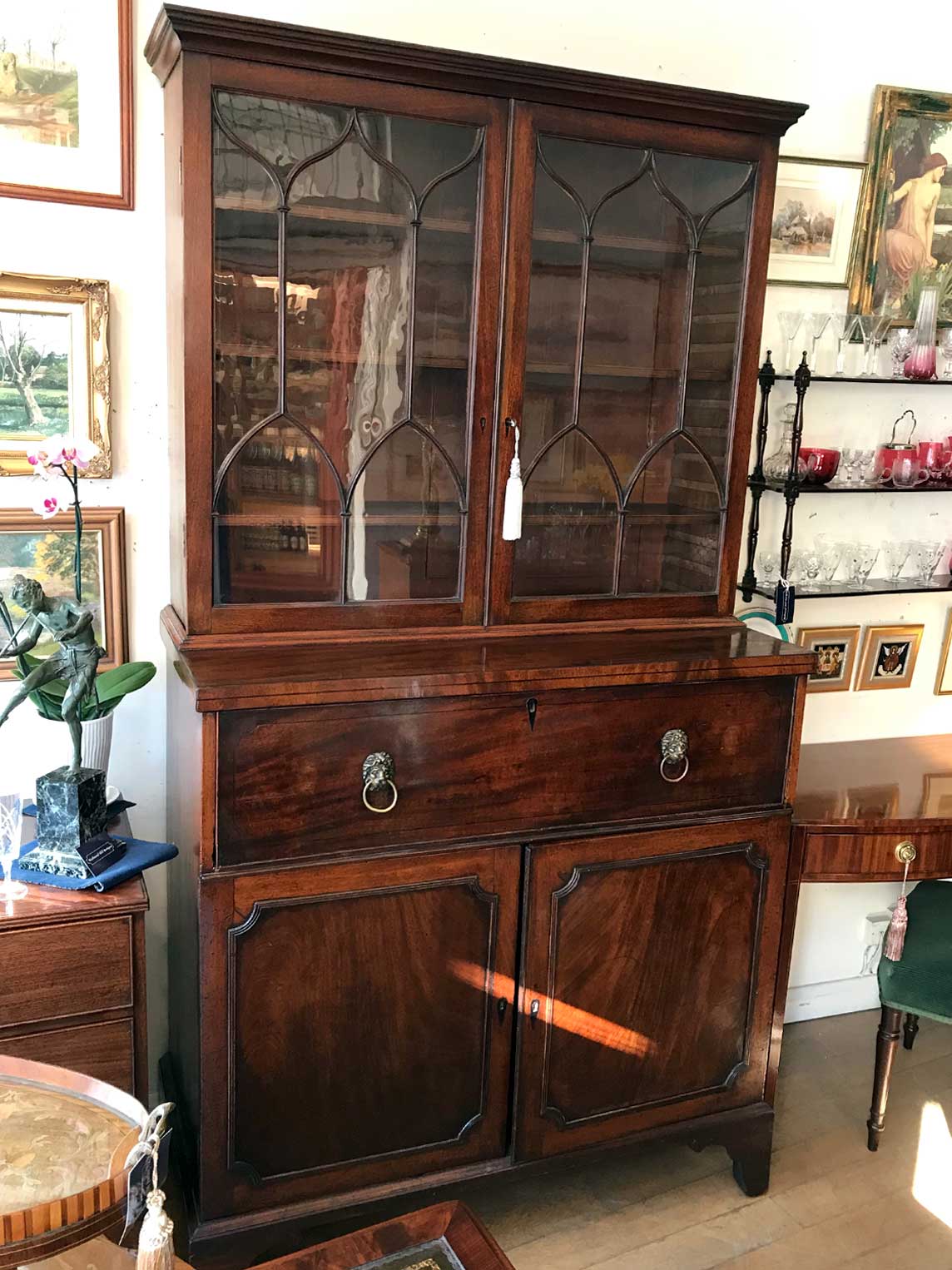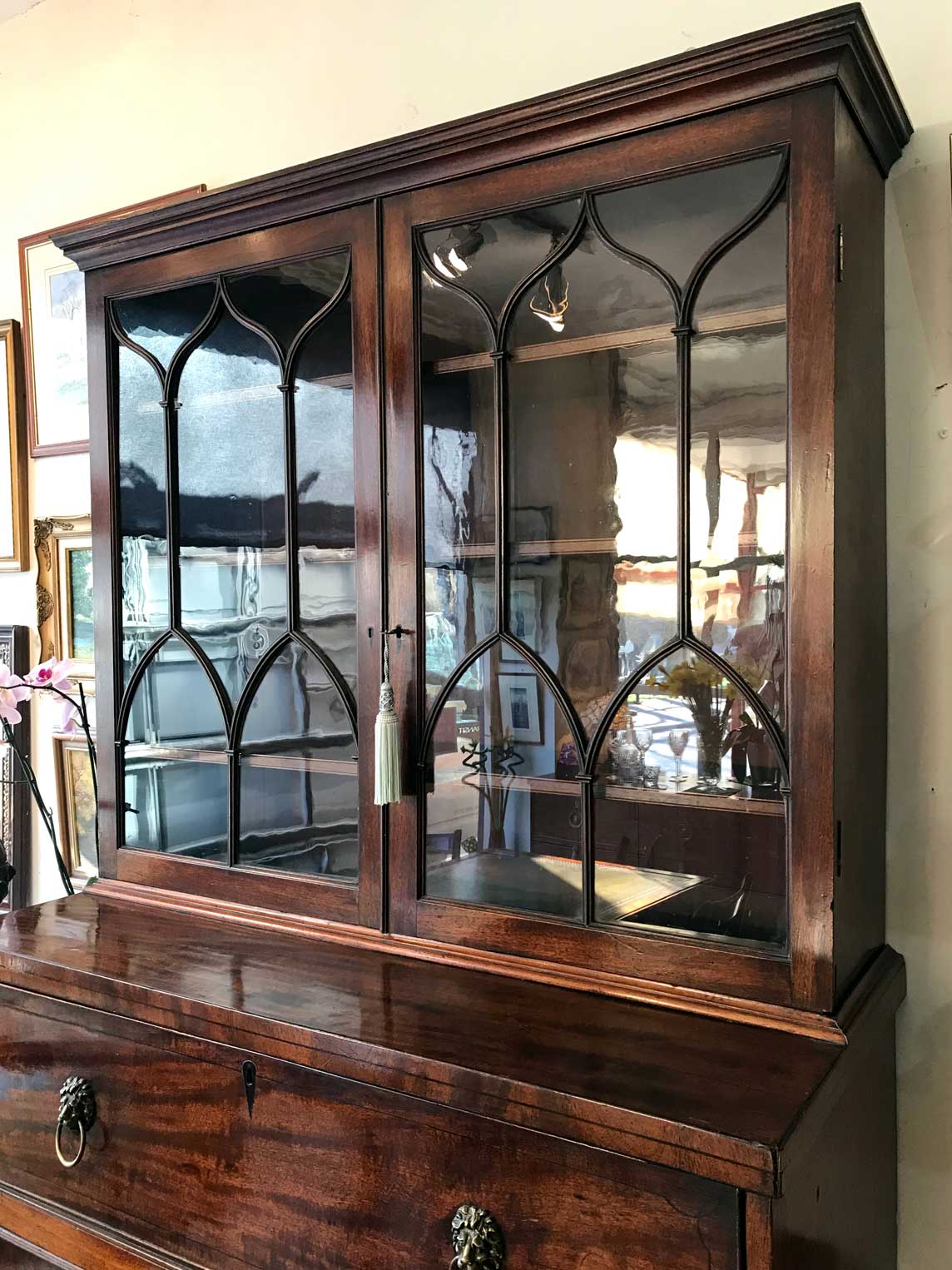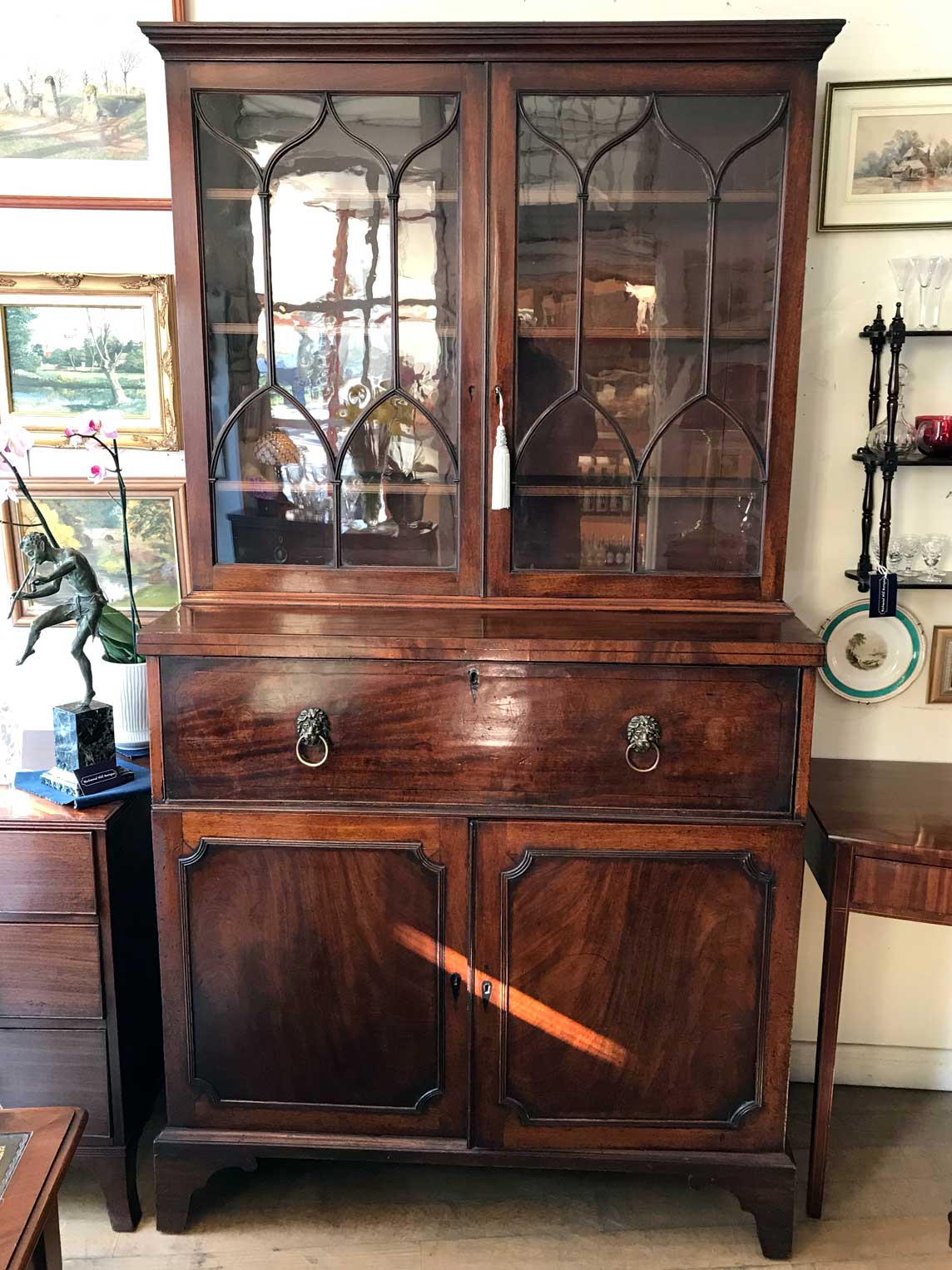 A high quality 18th Century Georgian Mahogany Secrétaire Bookcase / Cupboard with two glazed doors with adjustable sliding shelves. The pull out secretaire drawer with solid brass lion handles incloses a fitted interior with pigeon holes and drawers, over two plnaellled doors with three solid oak lined sliding trays on original bracket feet.