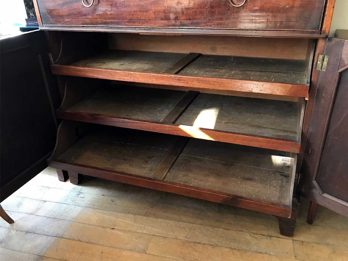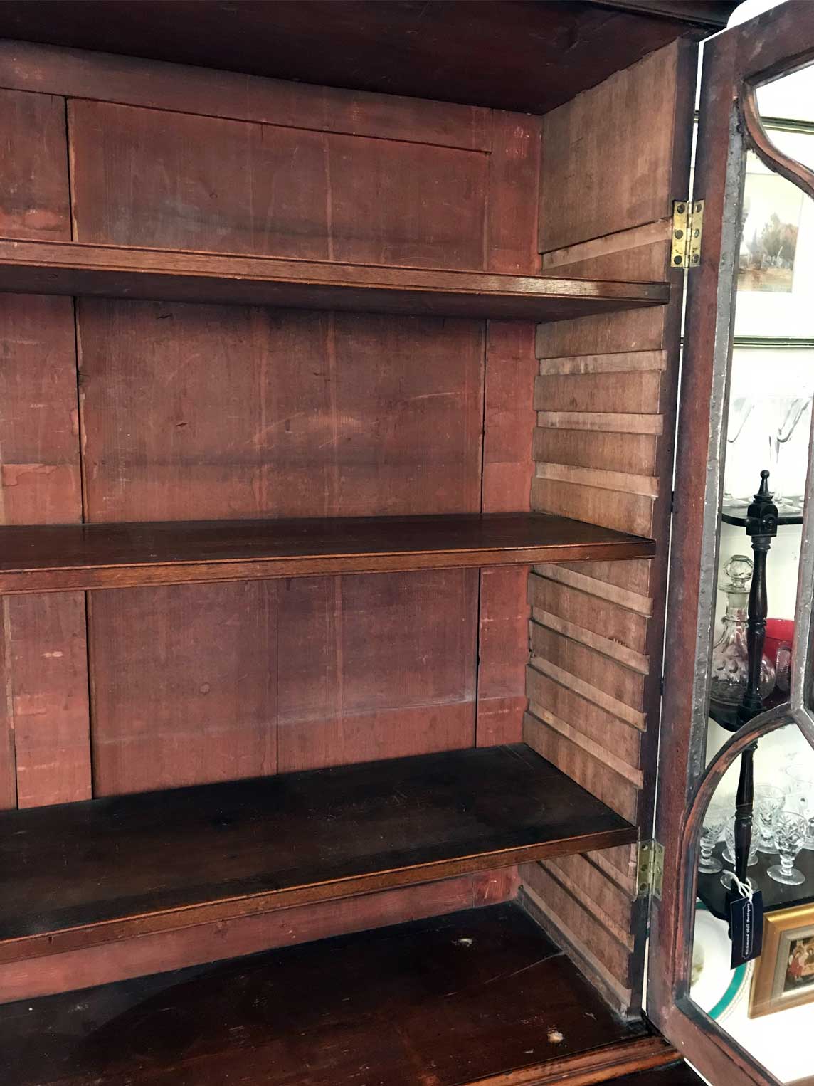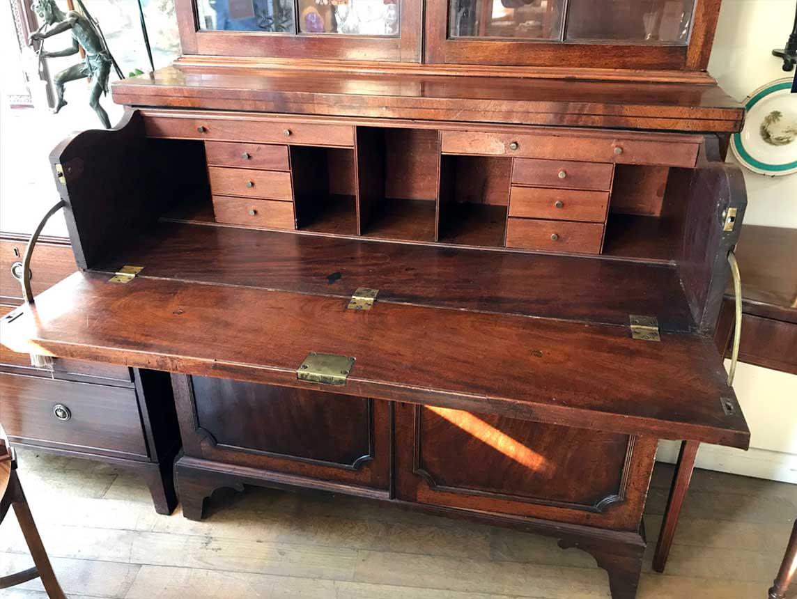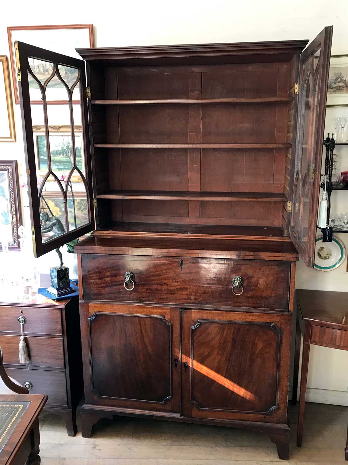 A high quality 18th Century Georgian Mahogany Secrétaire Bookcase / Cupboard with two glazed doors with adjustable sliding shelves. The pull out secretaire drawer with solid brass lion handles incloses a fitted interior with pigeon holes and drawers, over two plnaellled doors with three solid oak lined sliding trays on original bracket feet.