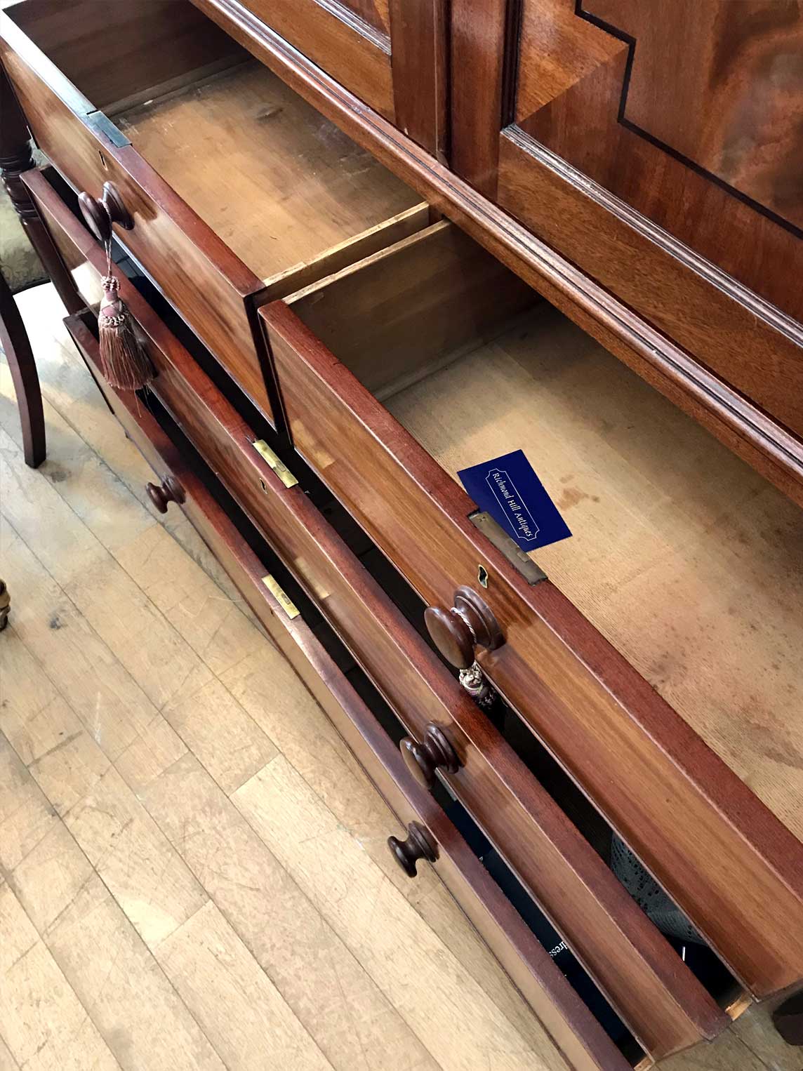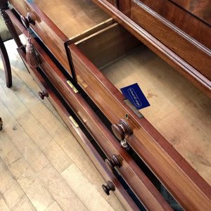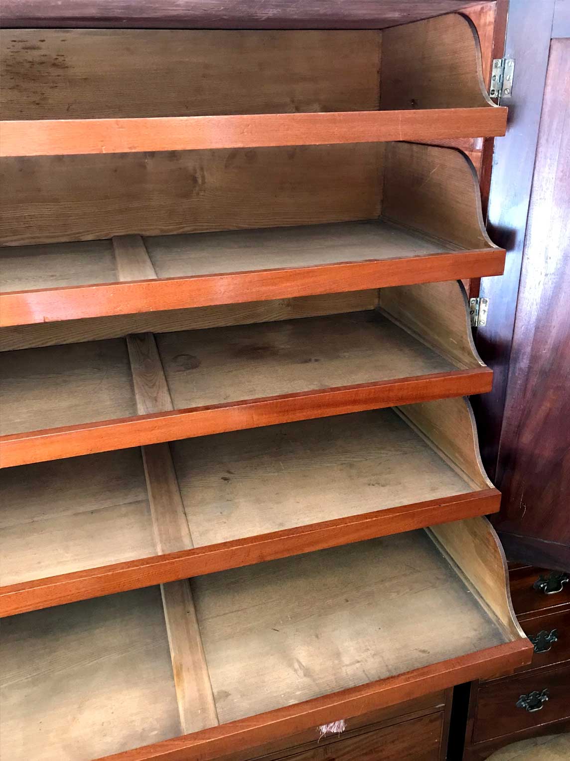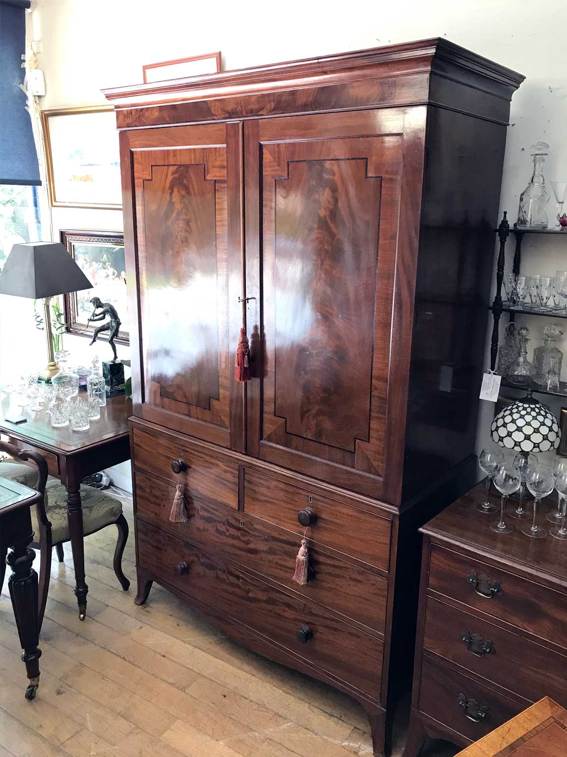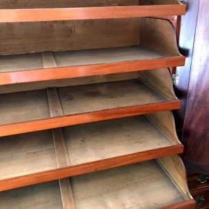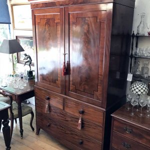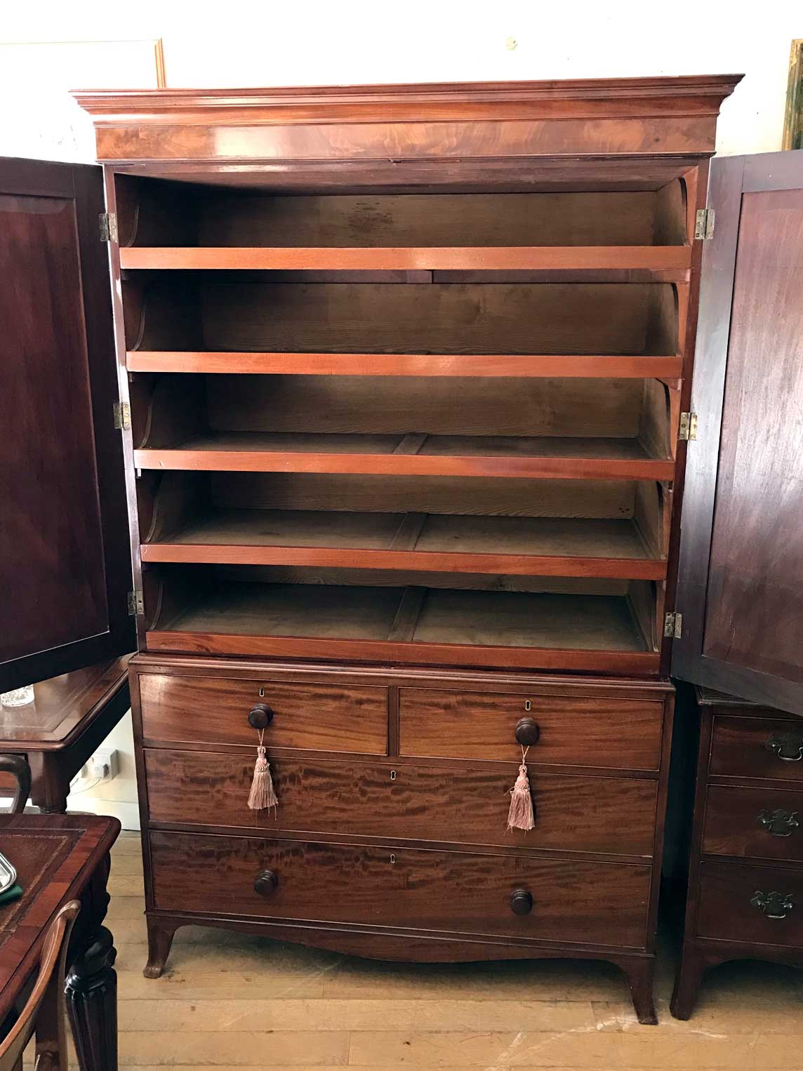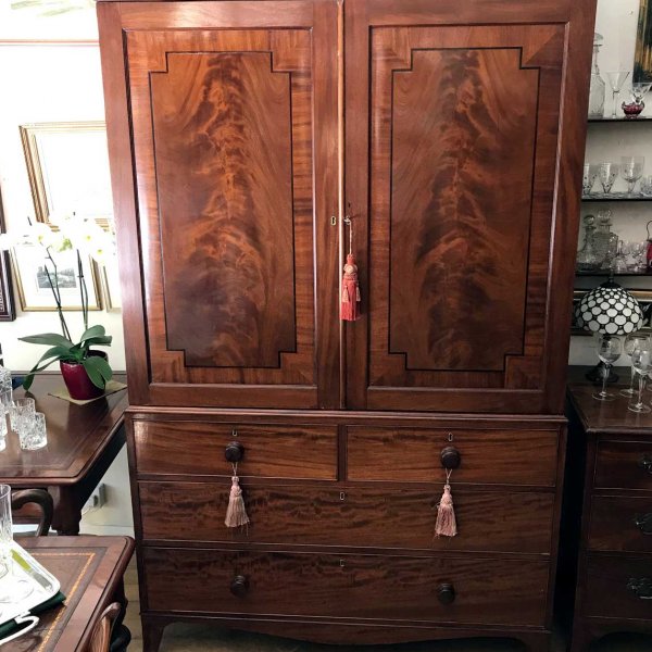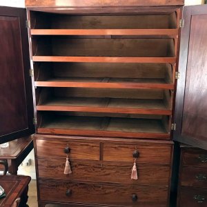 19th century Georgian Mahogany Linen Press with two panelled doors and five original interior sliding trays . Two short and two long with original turned bun handles and splayed feet. Comes apart in three separate sections,
