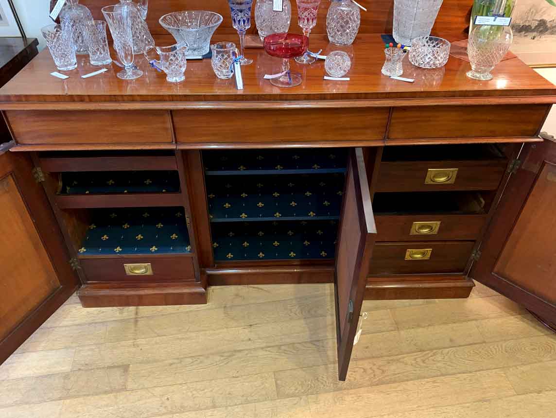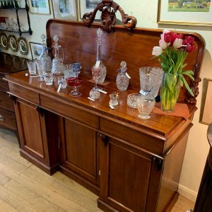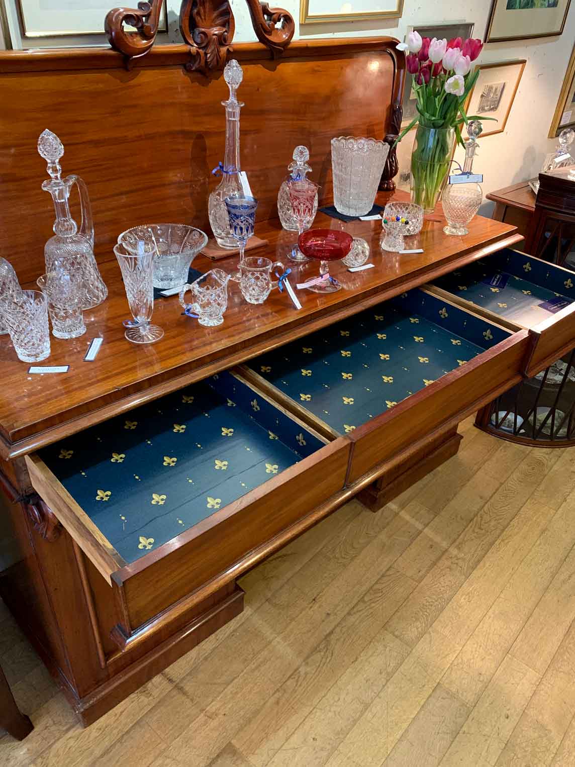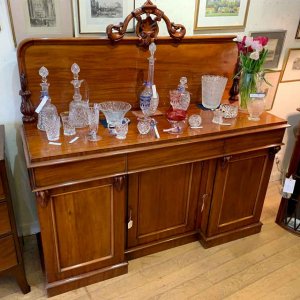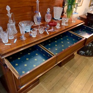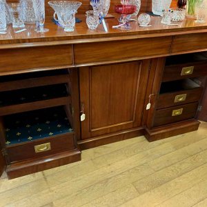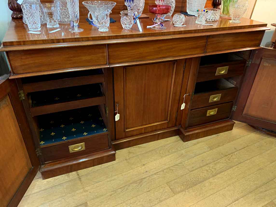 19th Century Victorian Side Board with three top drawers and cupboards below with drawers, shelves, and trays non a plinth base.