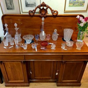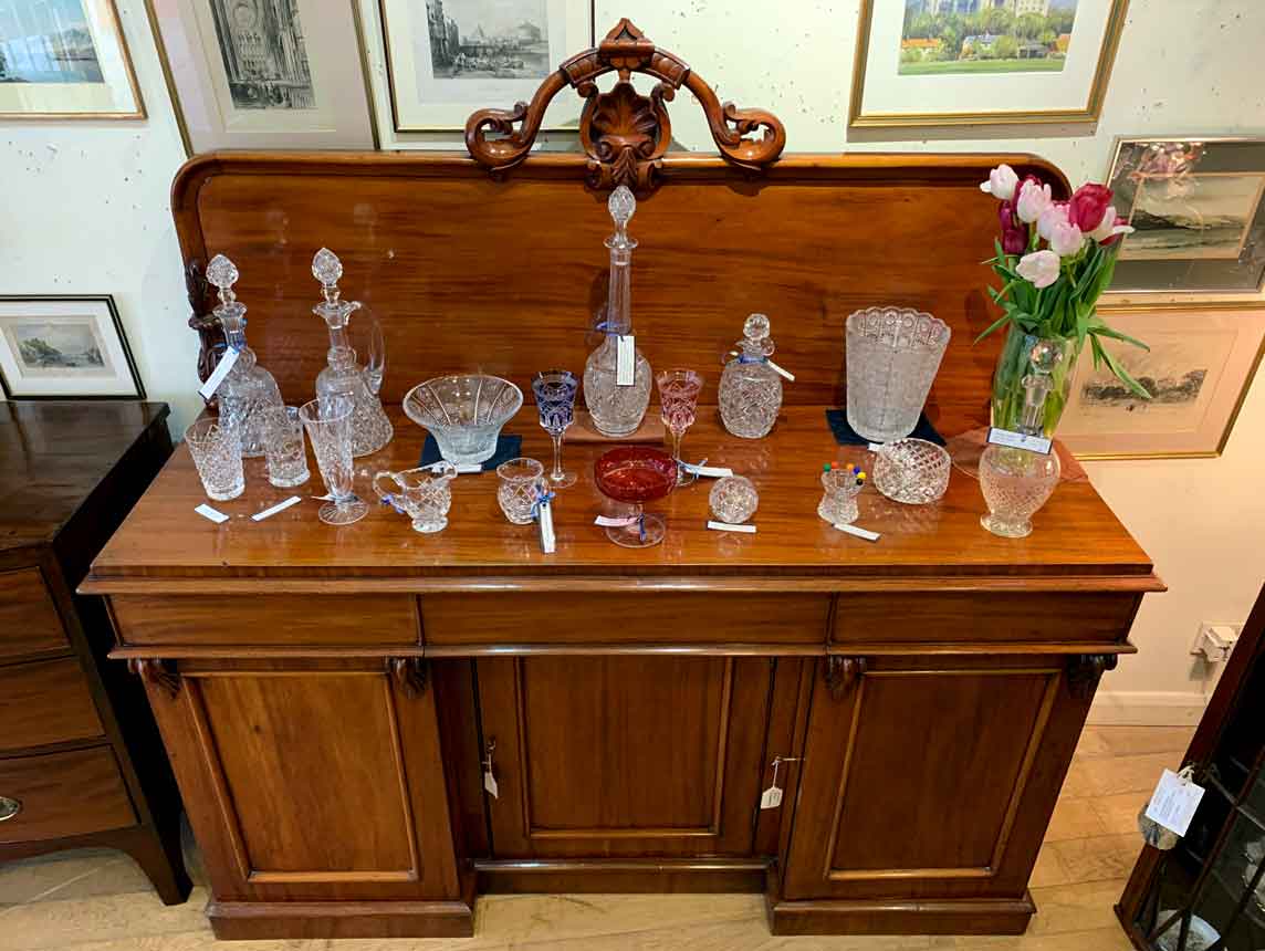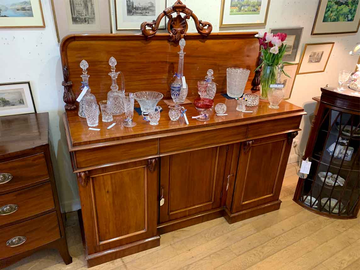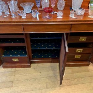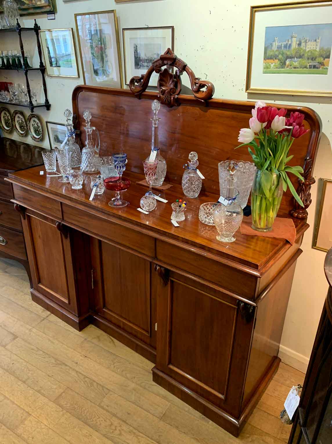 19th Century Victorian Side Board with three top drawers and cupboards below with drawers, shelves, and trays non a plinth base.