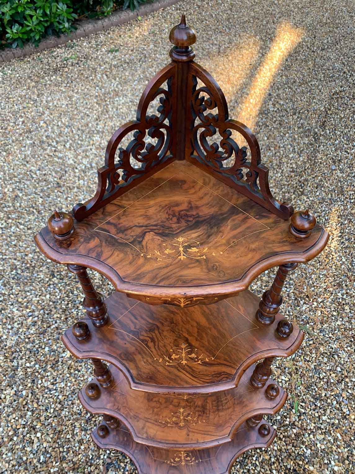 19th Century Victorian Burr Walnut Inlaid Corner Whatnot, with a fret carved gallery over four serpentine tiers raised on turned spiral columns, all standing on turned legs terminating in castors.
