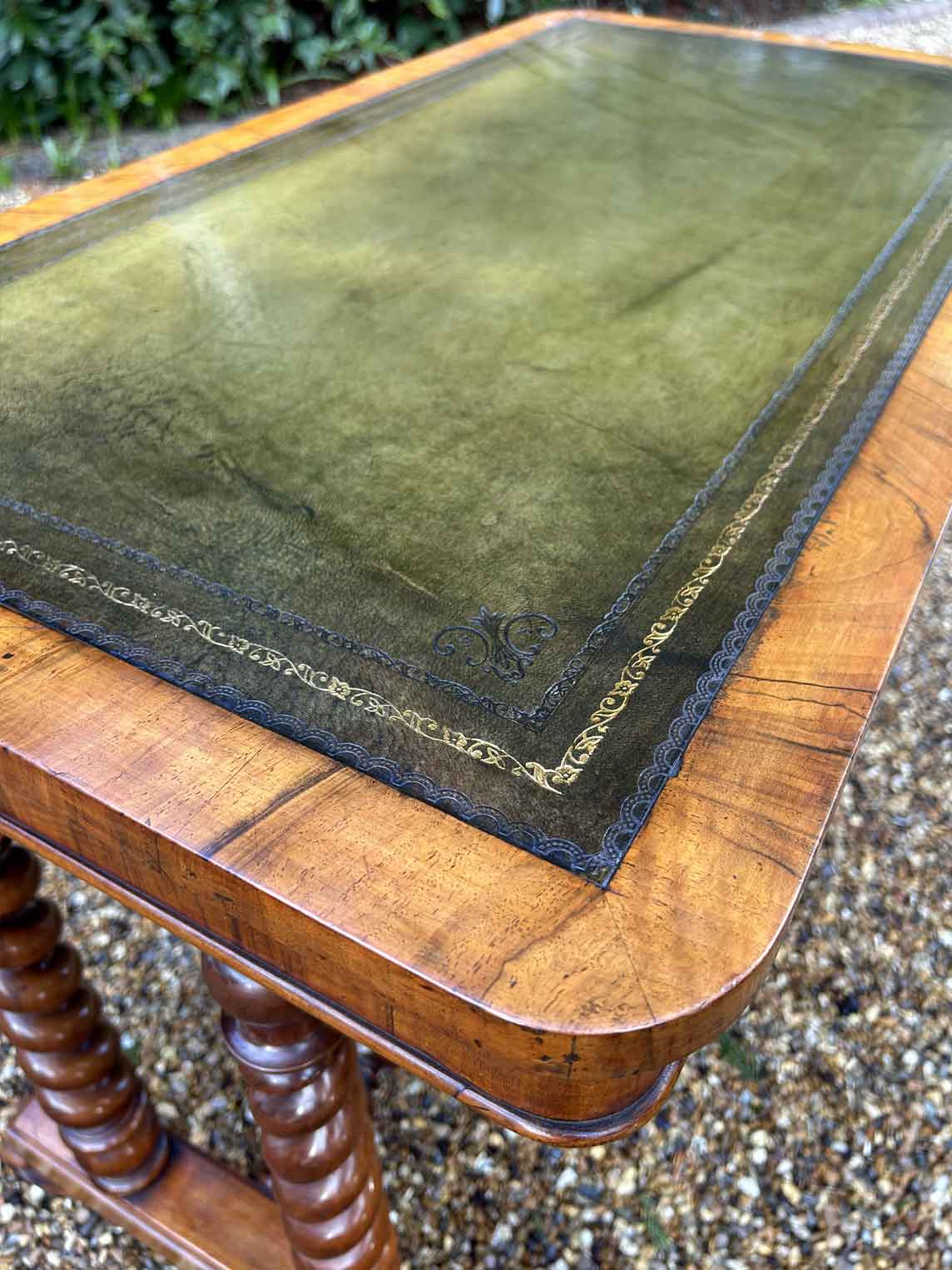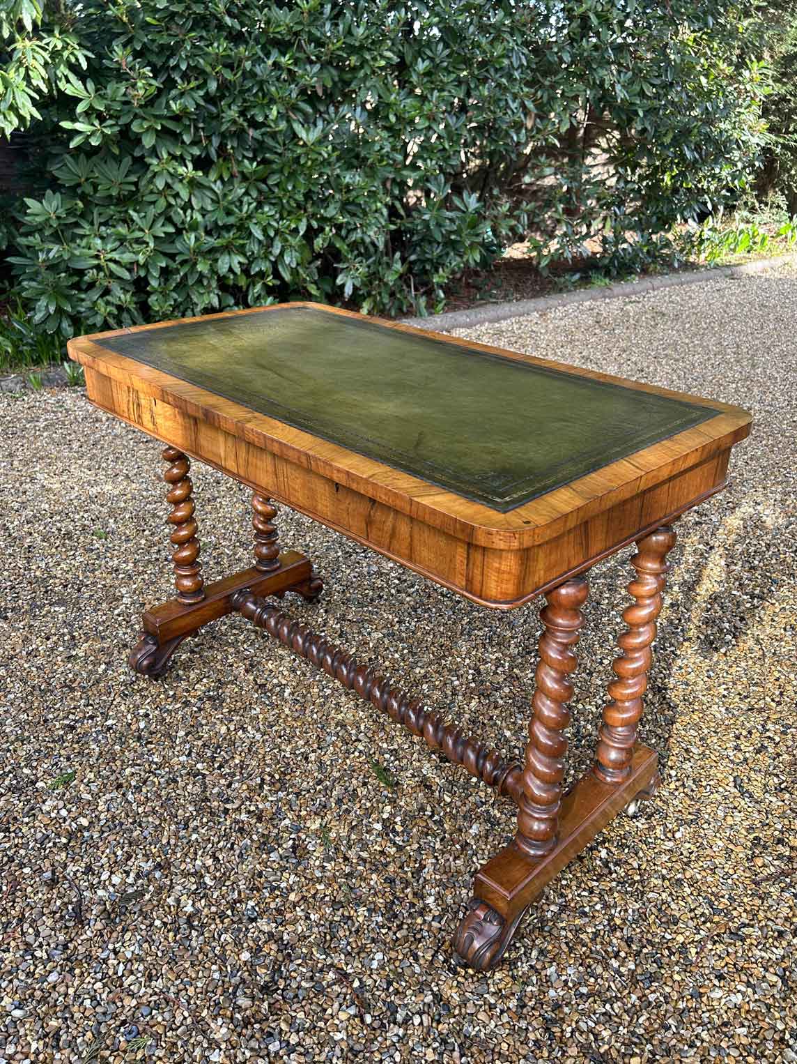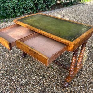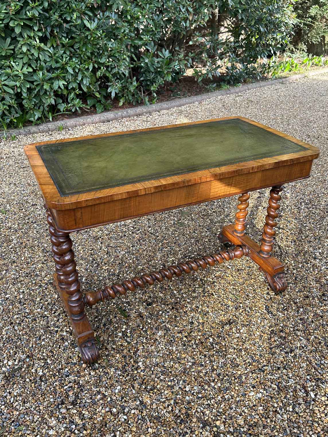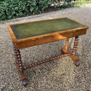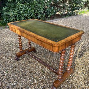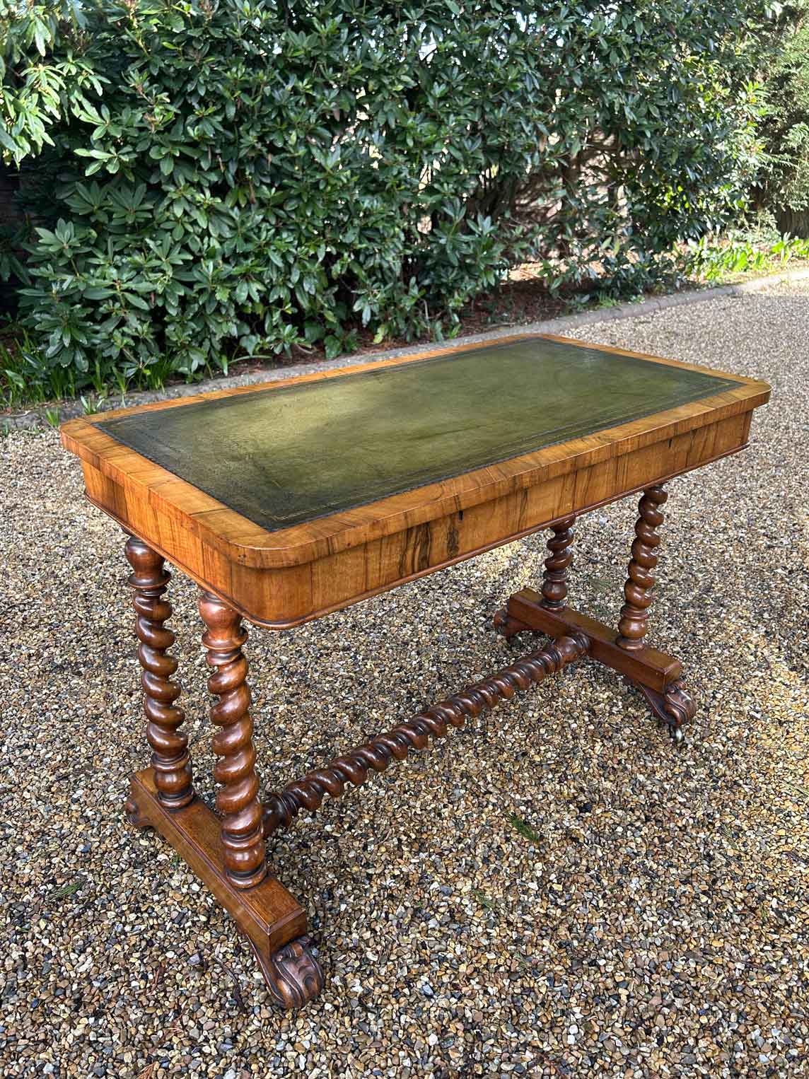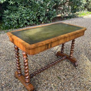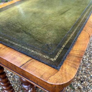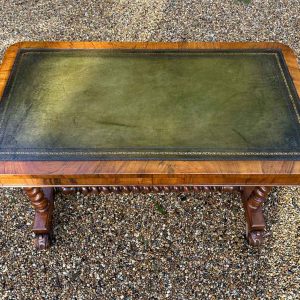 A 19th Century Victorian Walnut Writing Table, the top inset with green leather below has two hidden pull out drawers. The turned barley twist supports with finely carved decoration to base on castors.