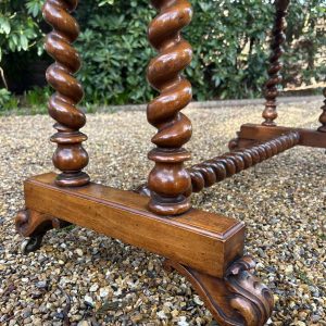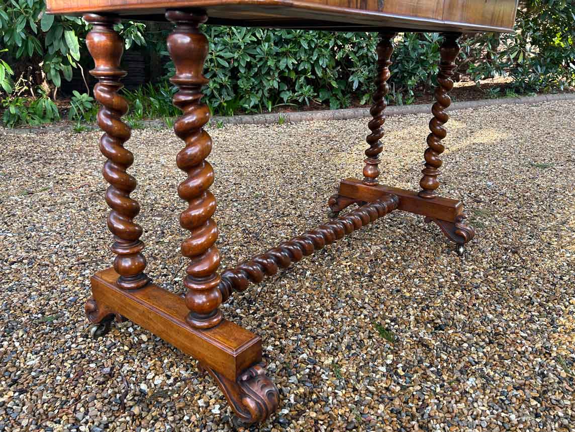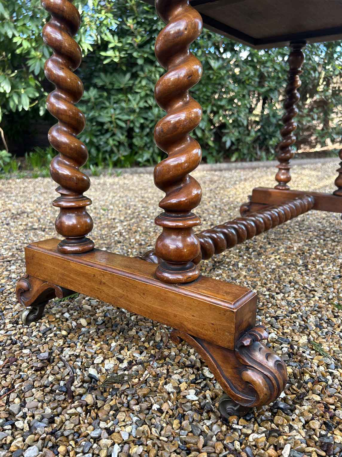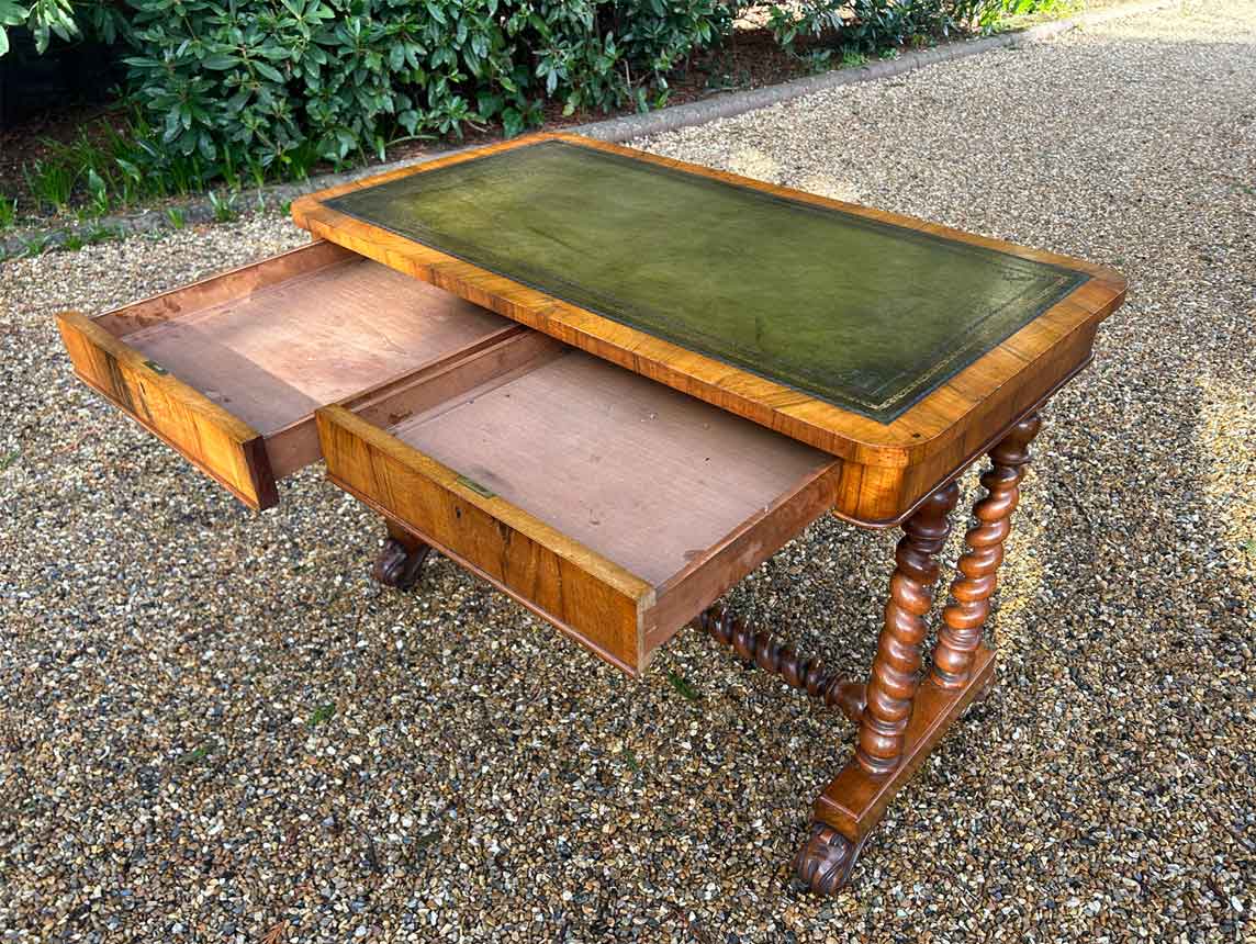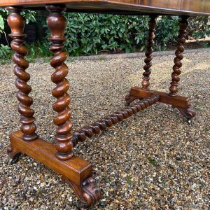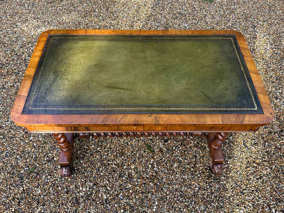A 19th Century Victorian Walnut Writing Table, the top inset with green leather below has two hidden pull out drawers. The turned barley twist supports with finely carved decoration to base on castors.