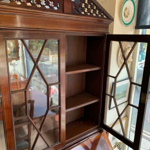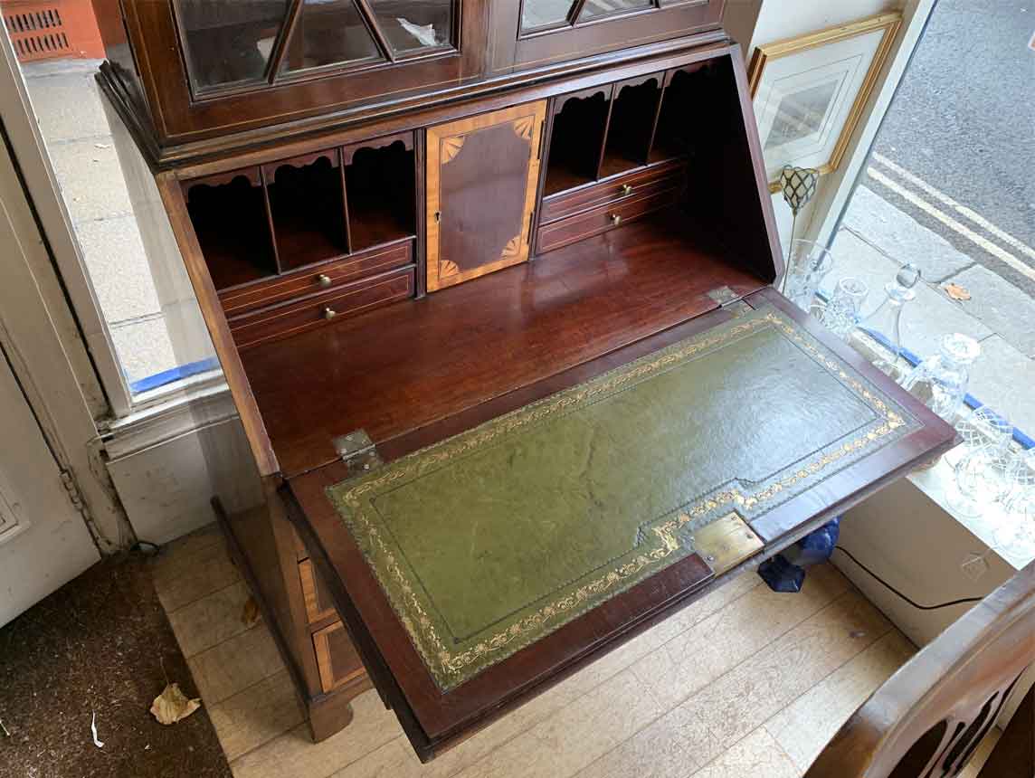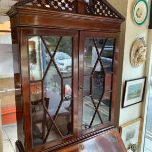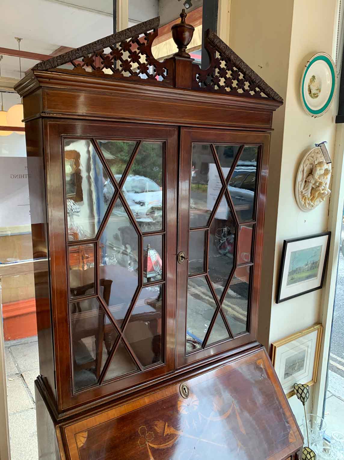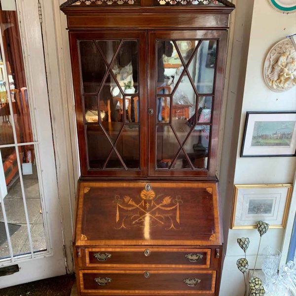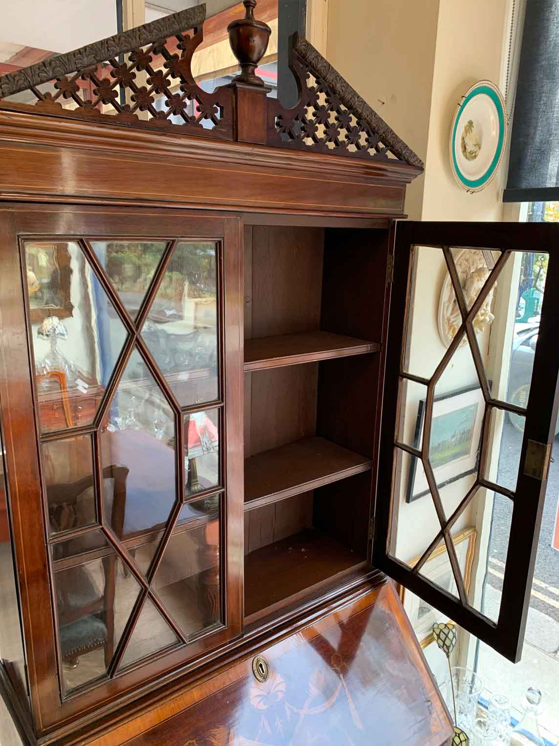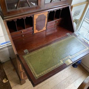Late 19th Century Victorian/early Edwardian Mahogany Inlaid Bureau Bookcase with fitted interior, brass handles and bracket feet. Comes apart in two sections.