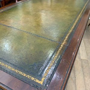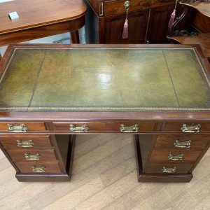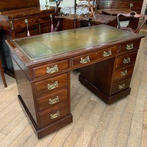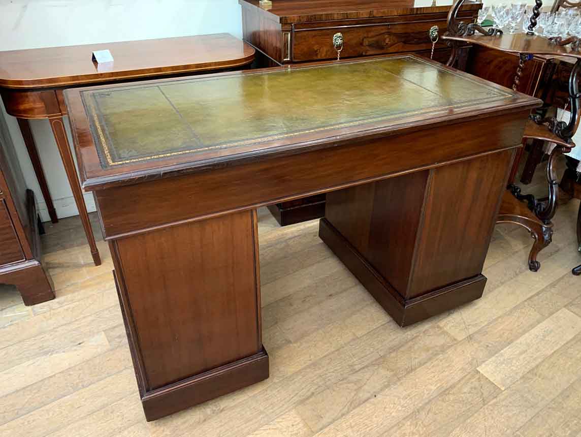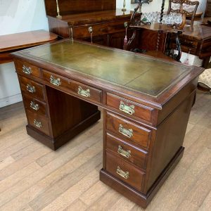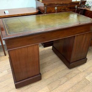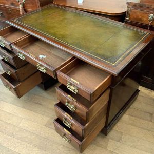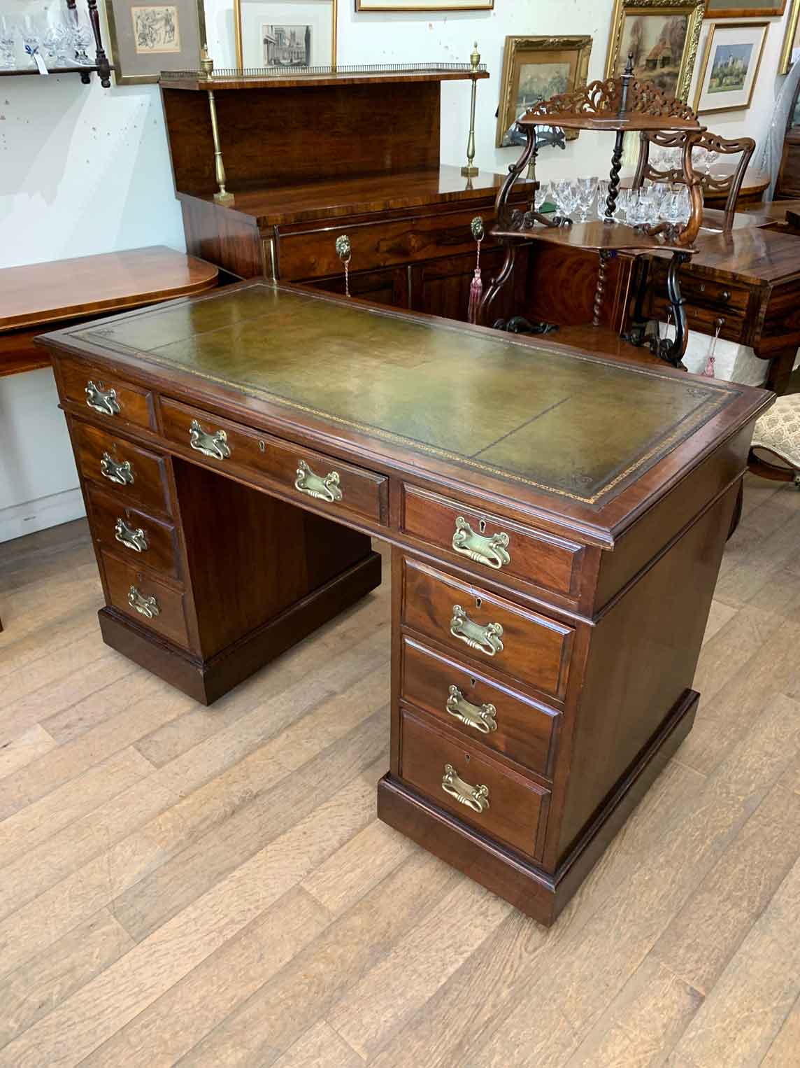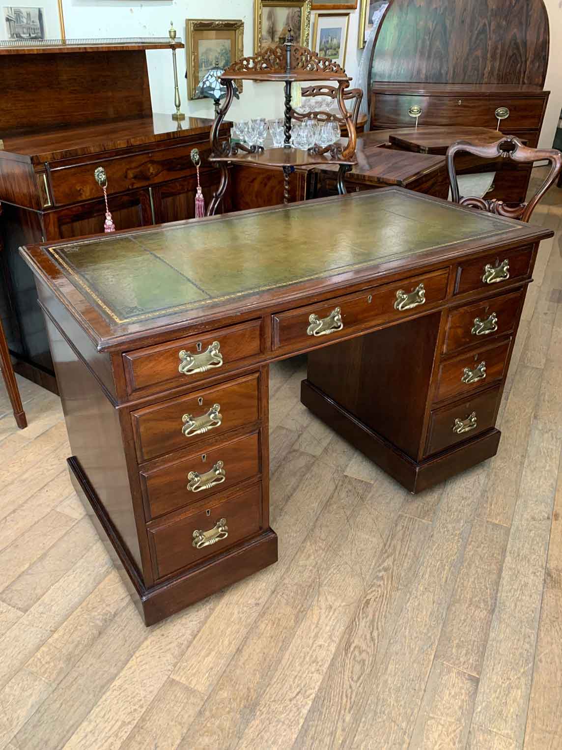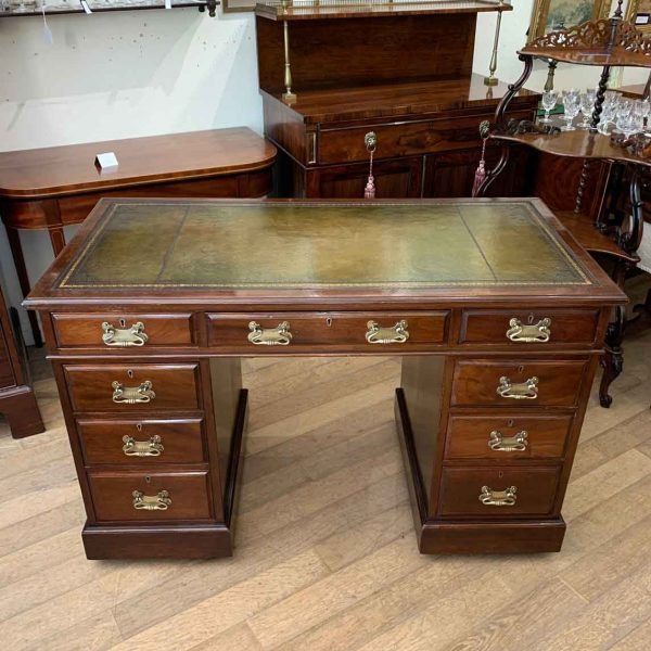 19th Century Mahogany Pedestal Desk, the top with a leather writing surface and nine drawers, all with fitted with turned brass handles and lined mahogany drawers. Comes apart in three separate sections.
