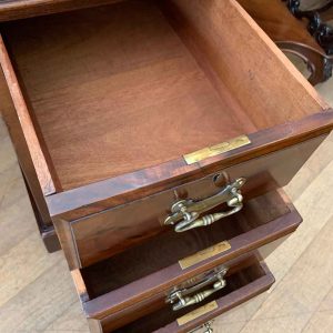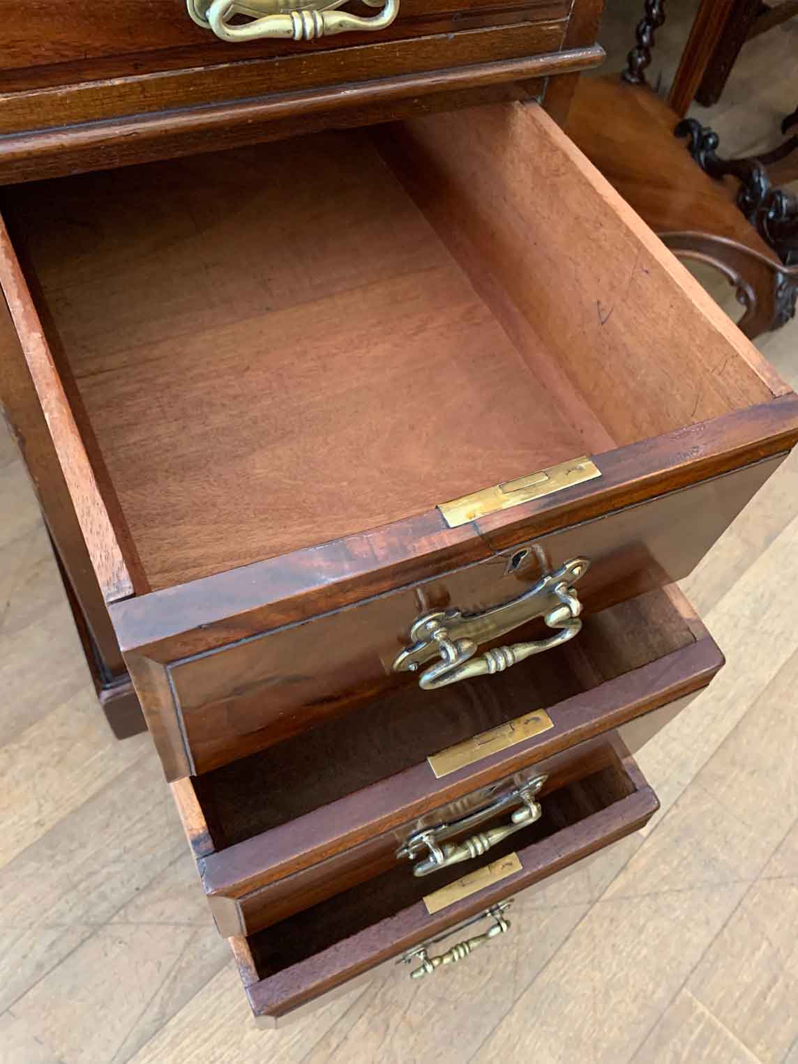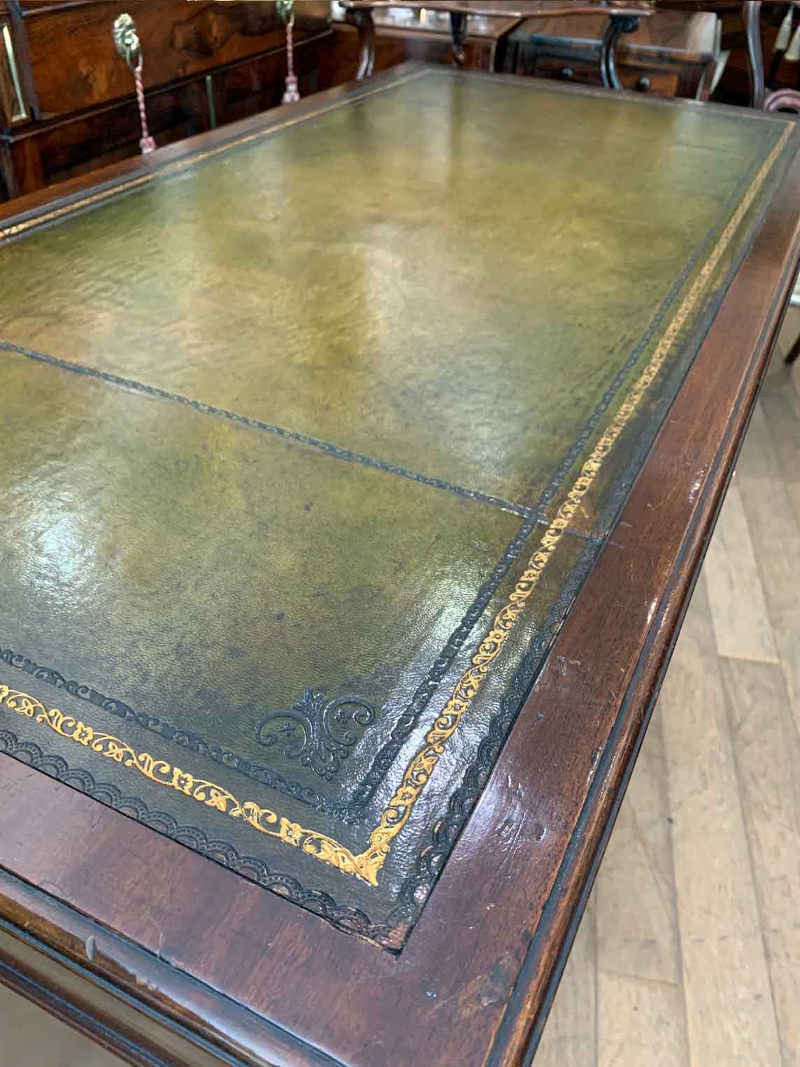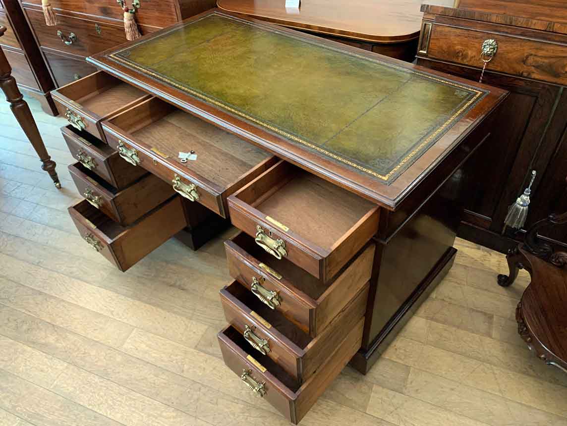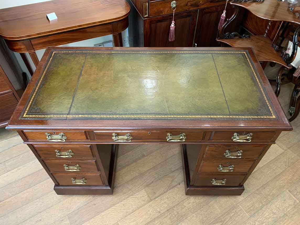 19th Century Mahogany Pedestal Desk, the top with a leather writing surface and nine drawers, all with fitted with turned brass handles and lined mahogany drawers. Comes apart in three separate sections.