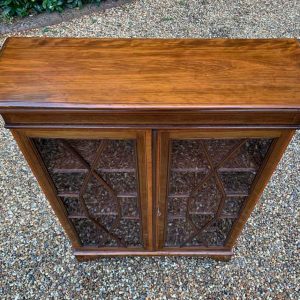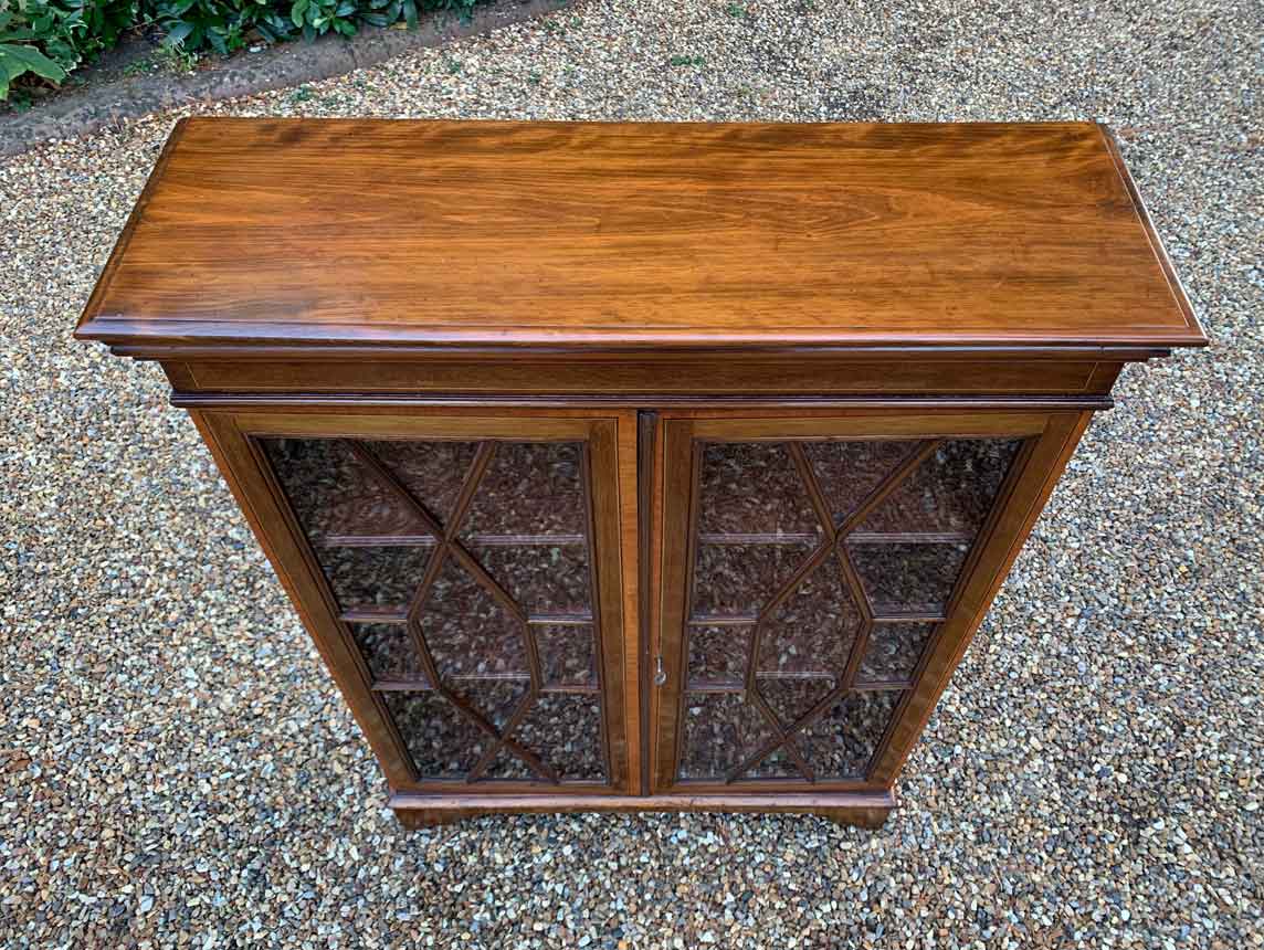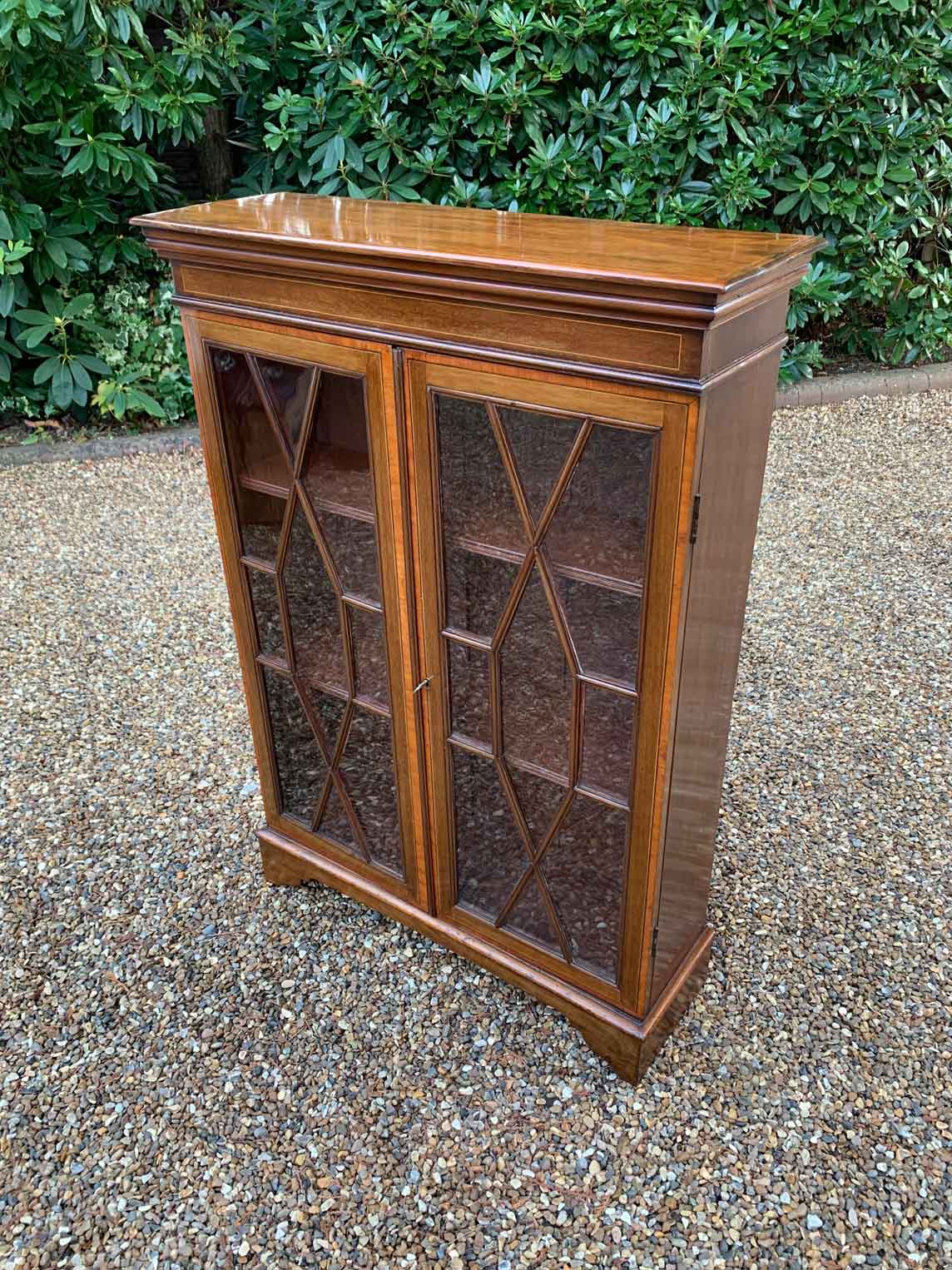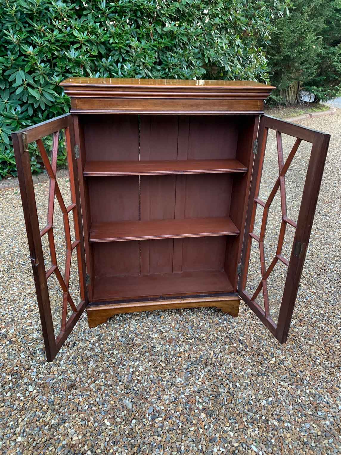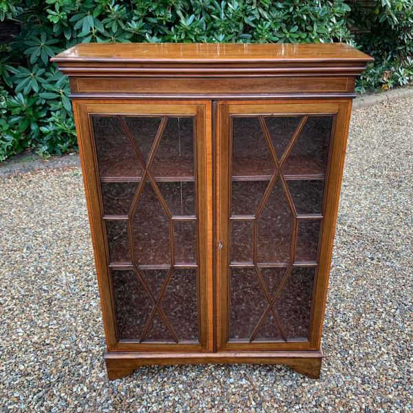 A good quality 19th Century Victorian Mahogany Bookcase with three shelves, inlay, glazed doors and key on bracket feet.