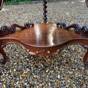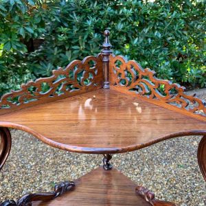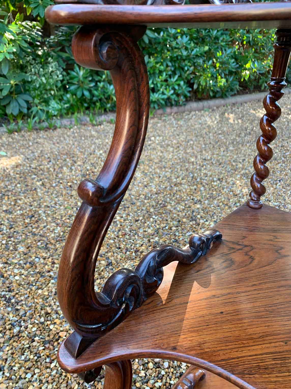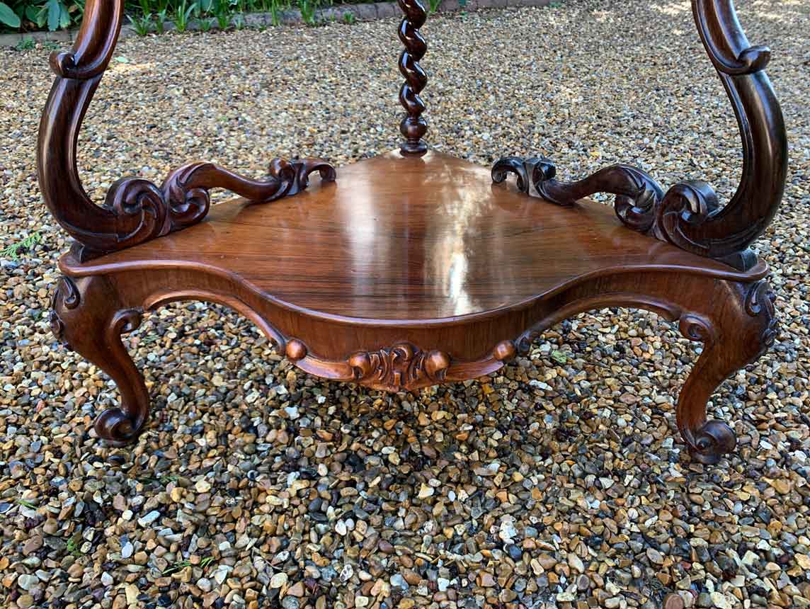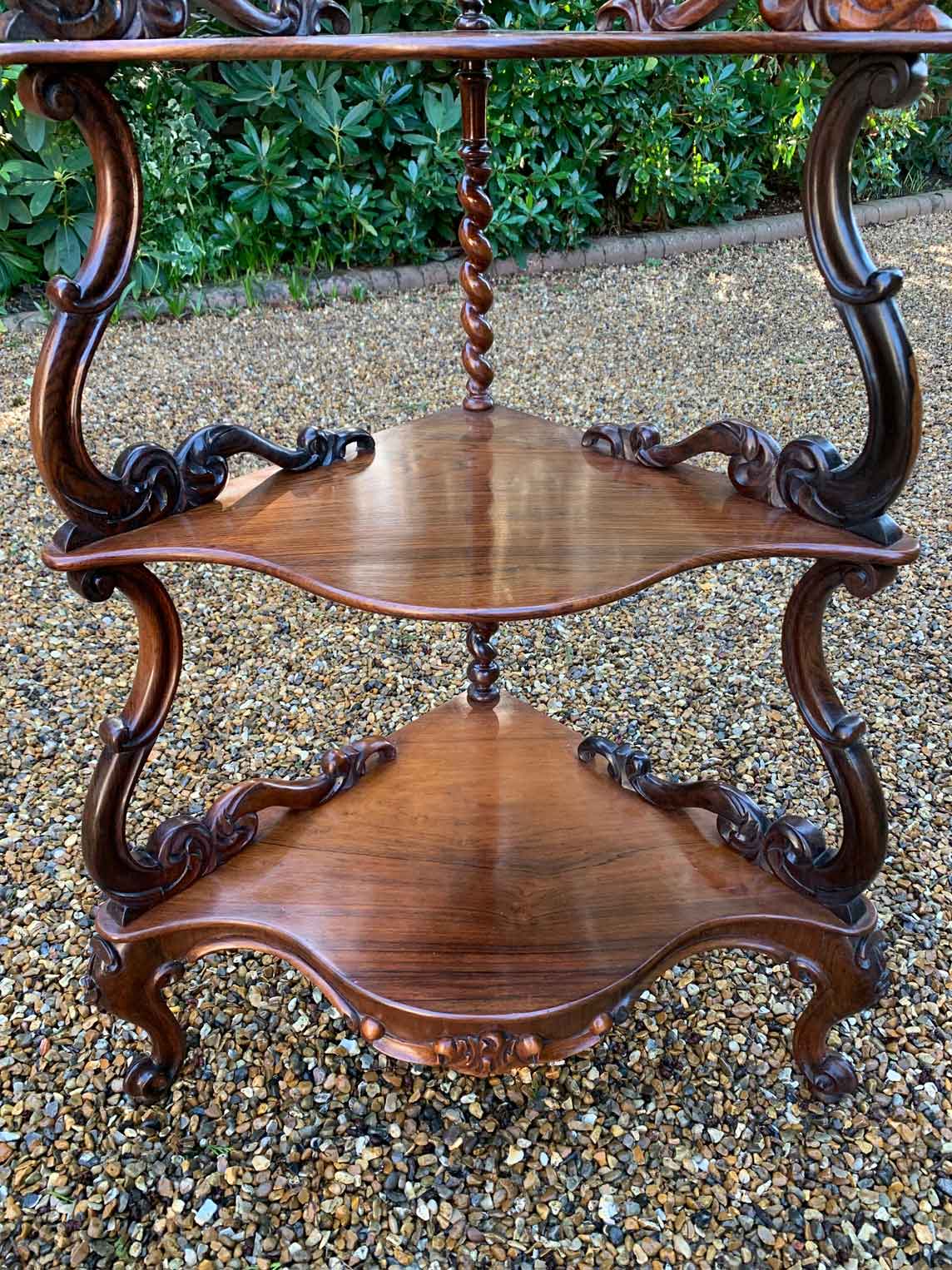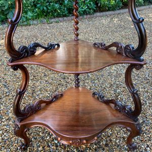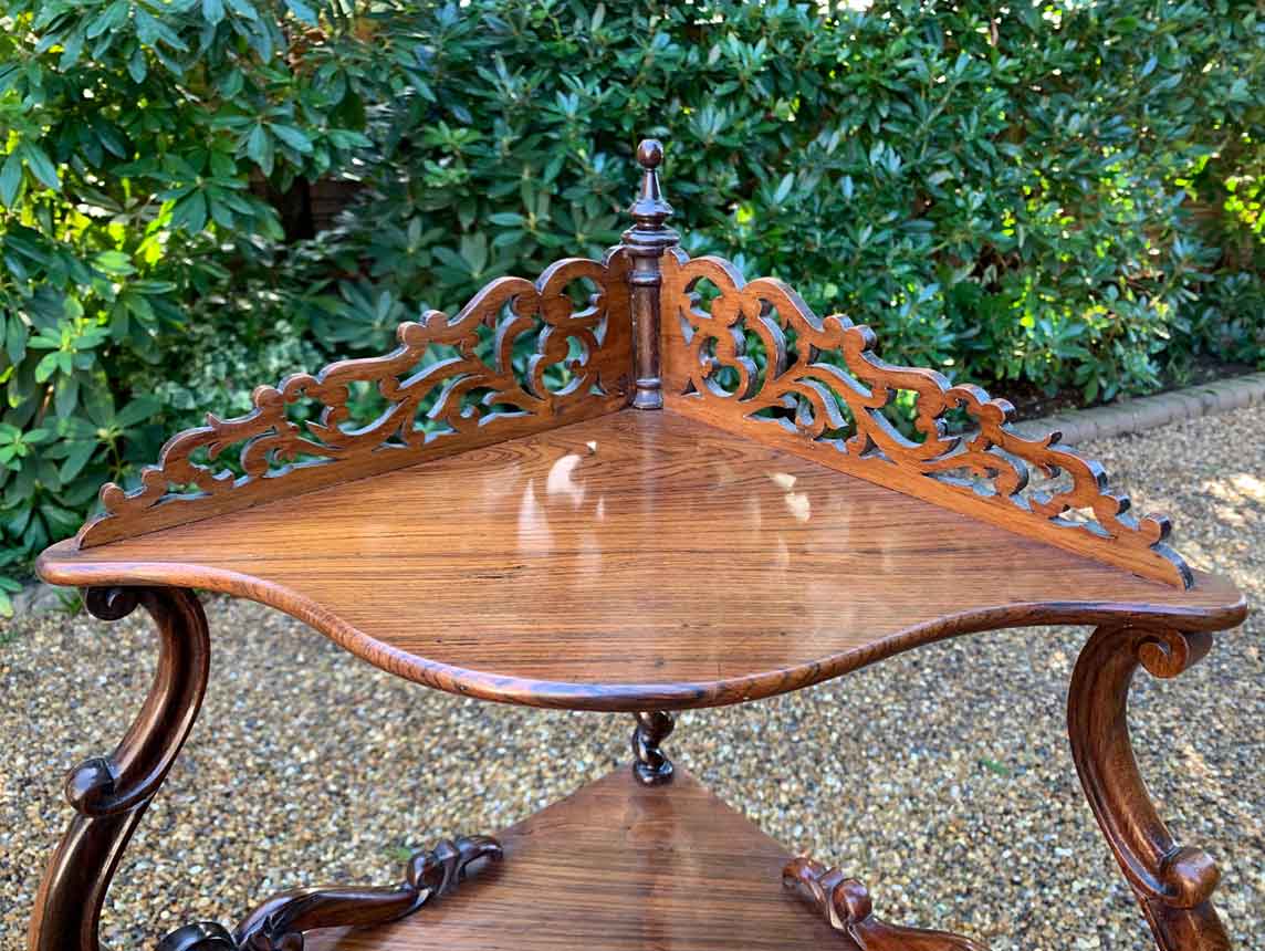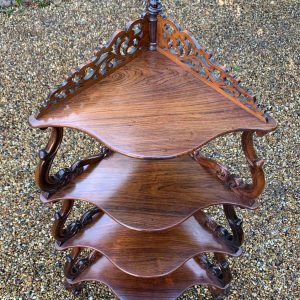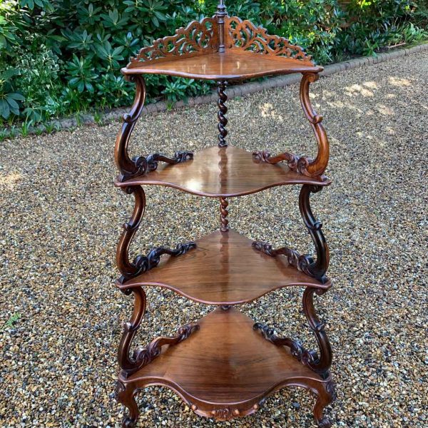 19th Century Victorian Rosewood Corner Whatnot, with a fret carved gallery over four serpentine tiers raised on turned spiral columns, all standing on cabriole legs.