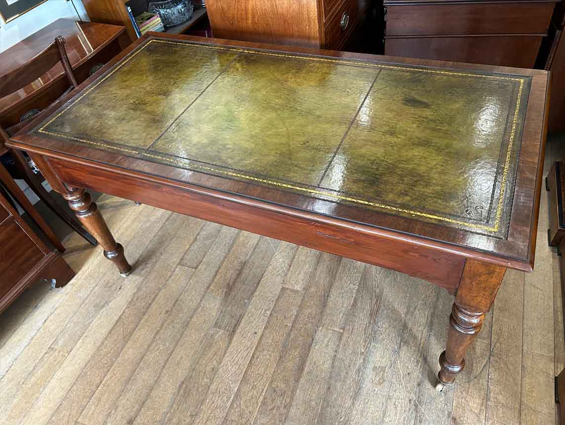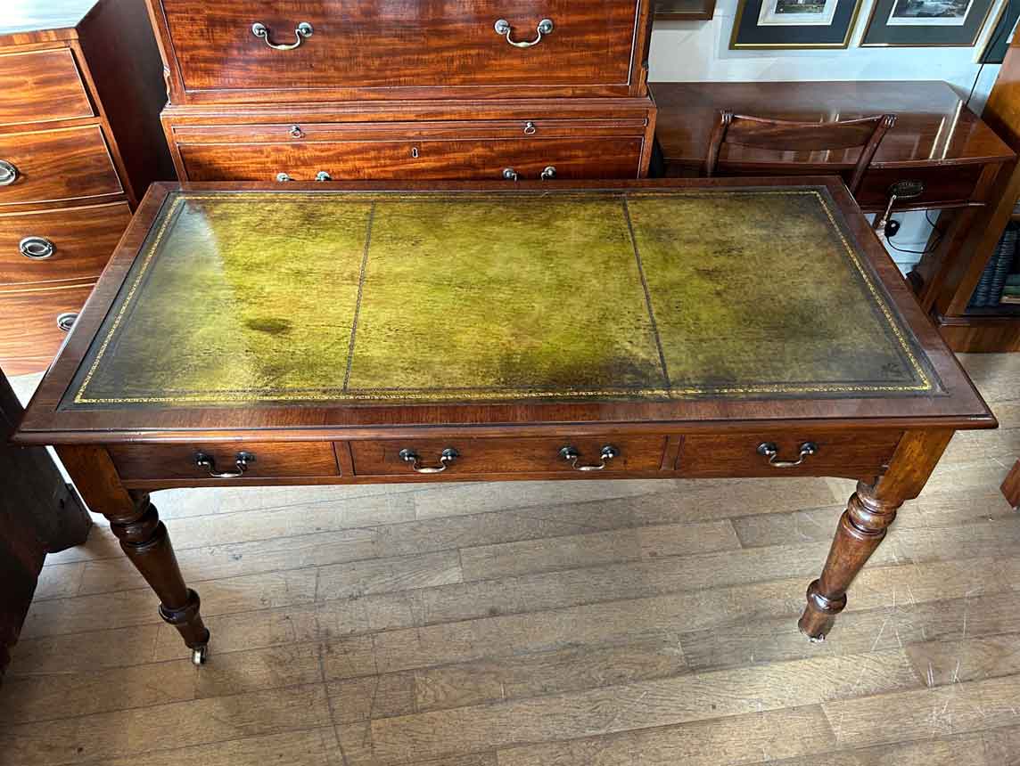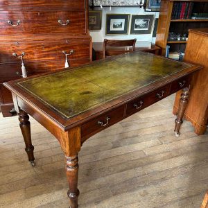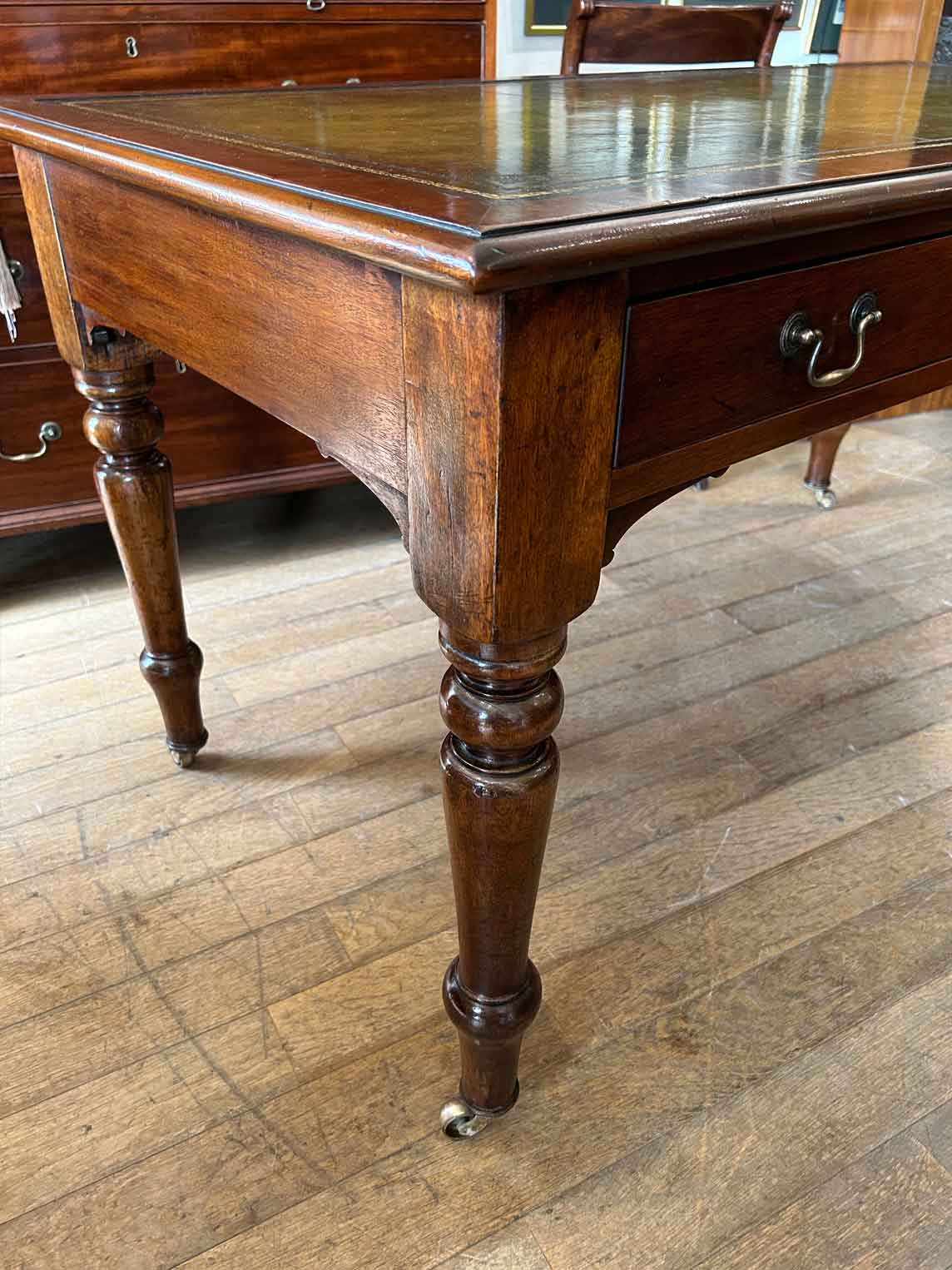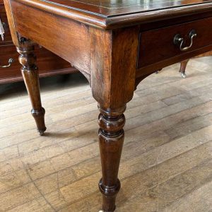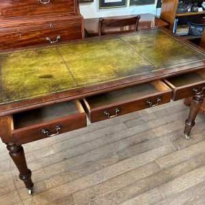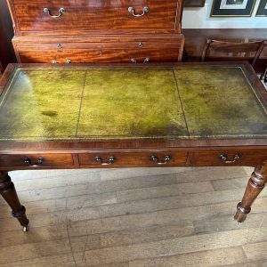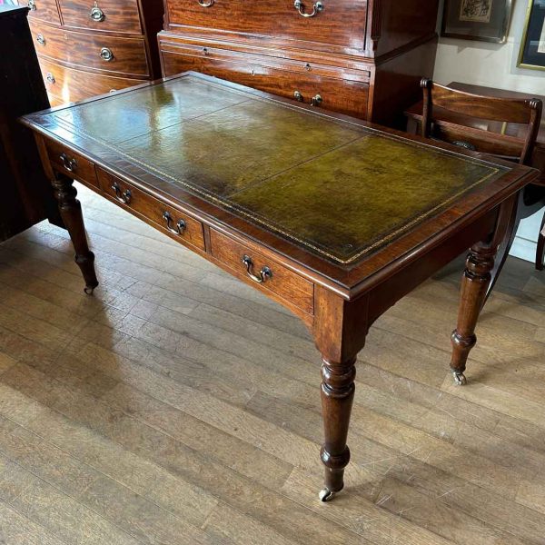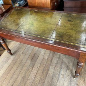 19th Century Mahogany Library / Writing Table with green leathered writing surface, three drawers fitted with brass swan neck handles. On turned legs and brass original castors to base.