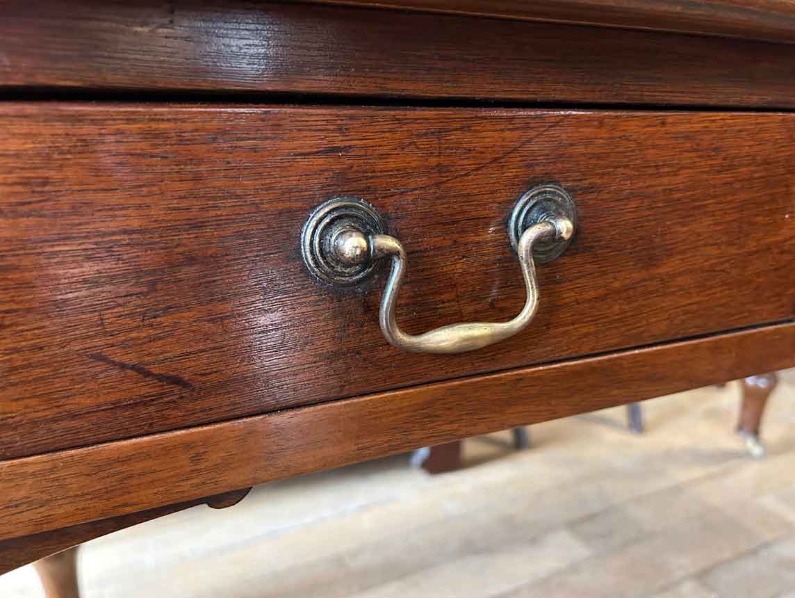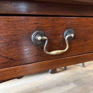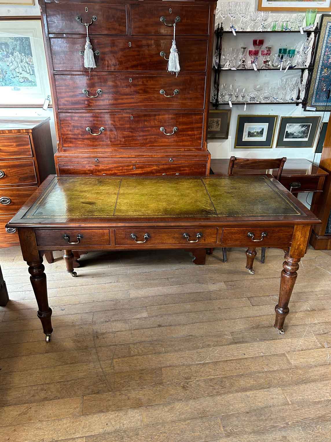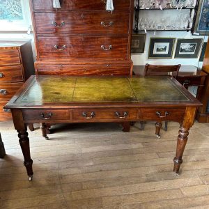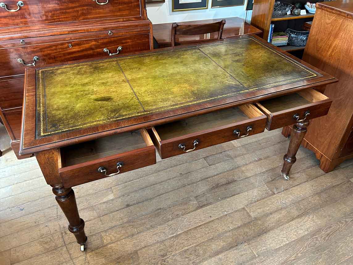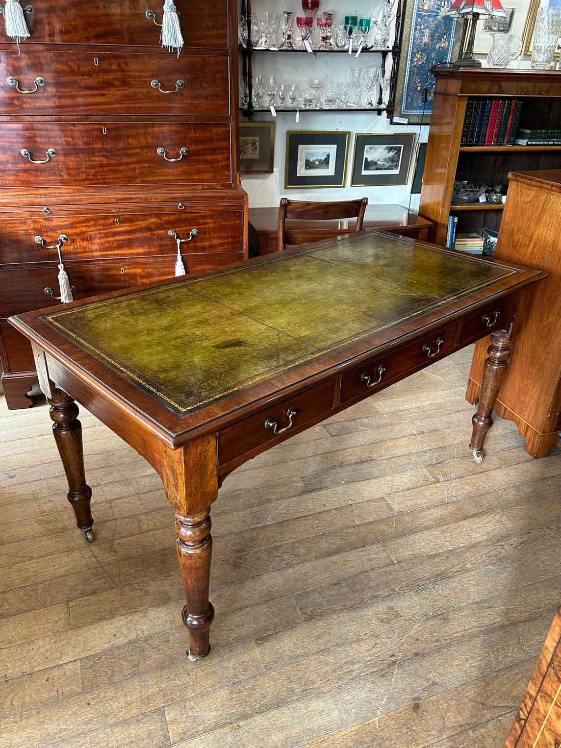 19th Century Mahogany Library / Writing Table with green leathered writing surface, three drawers fitted with brass swan neck handles. On turned legs and brass original castors to base.
