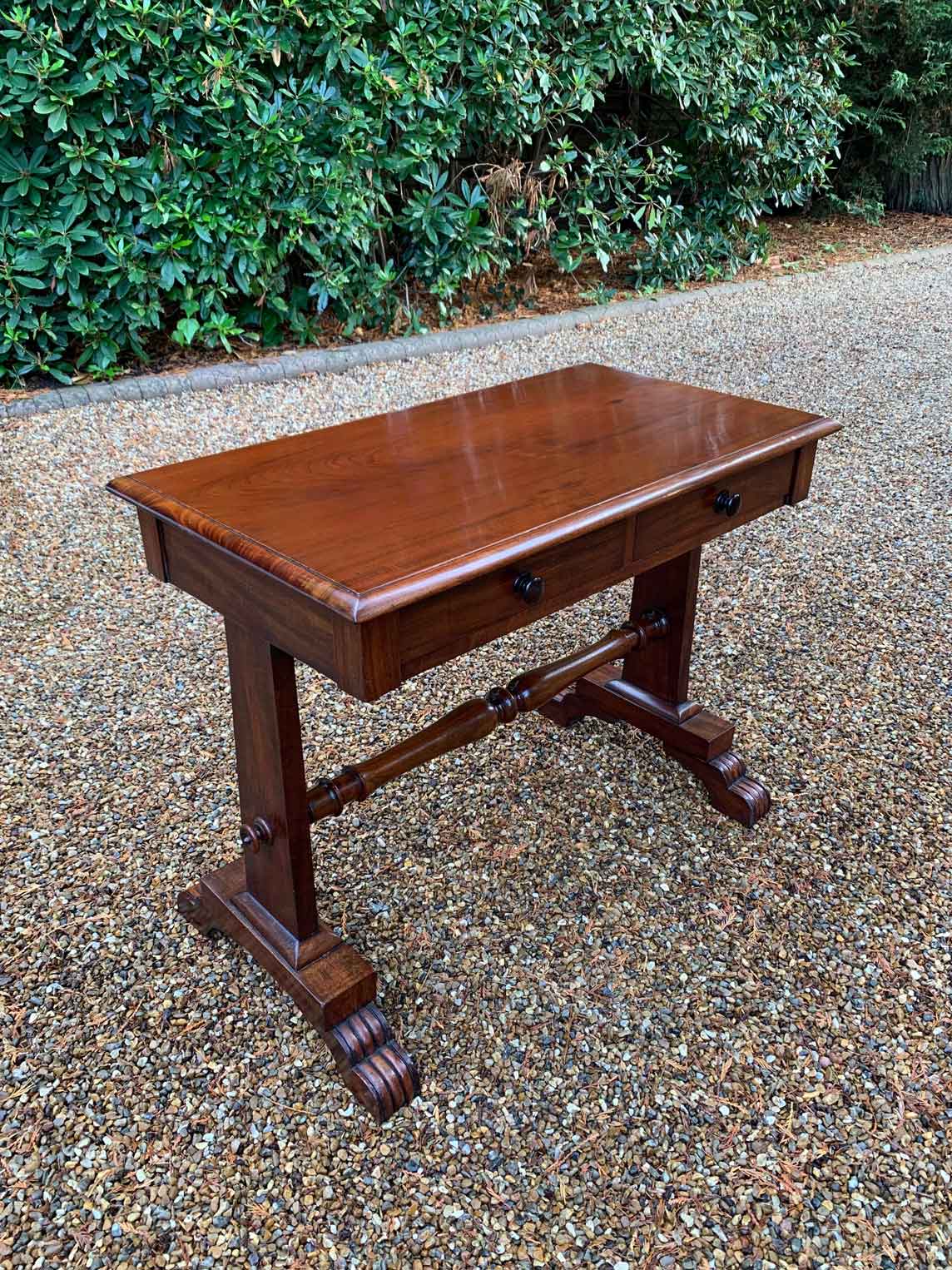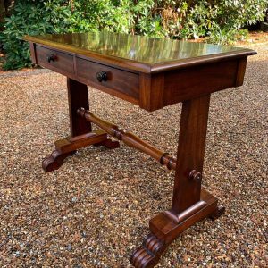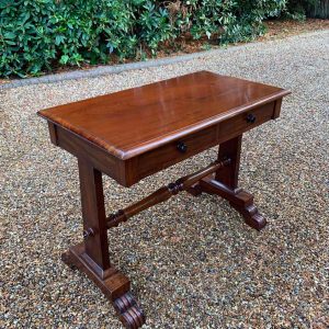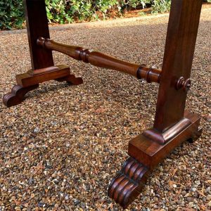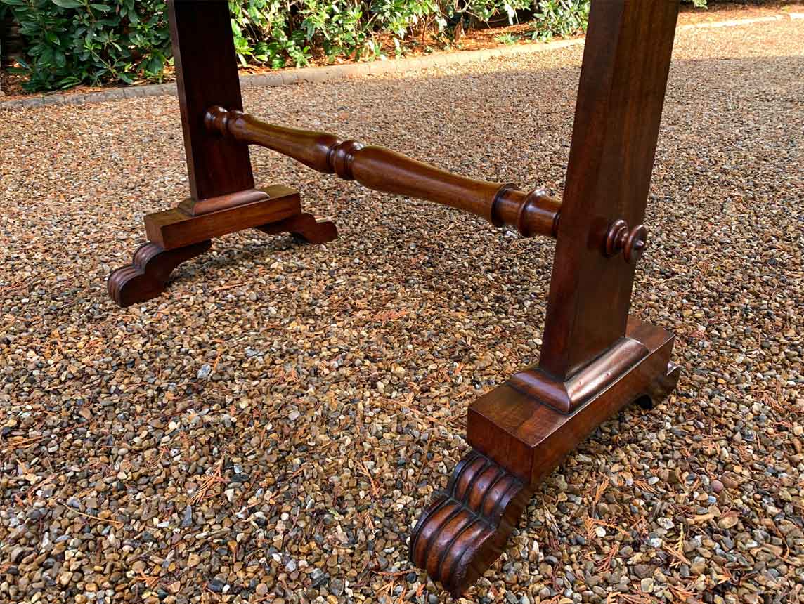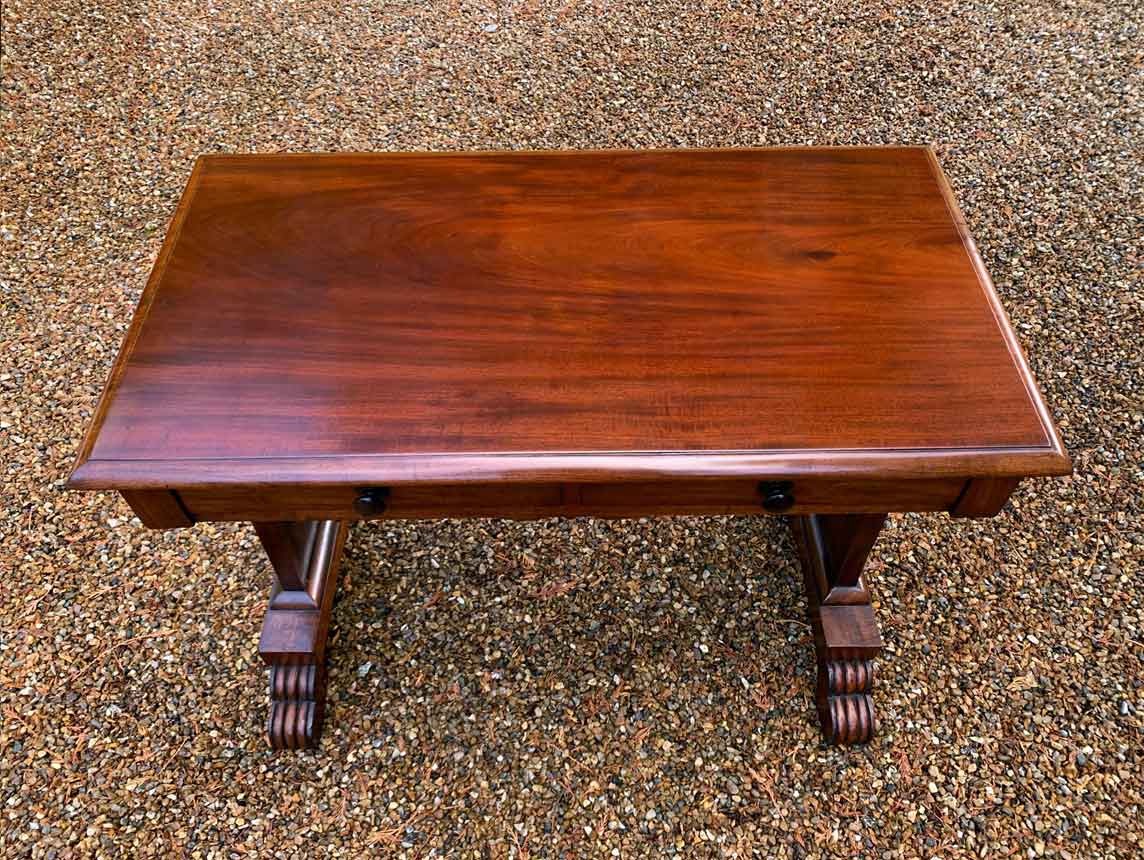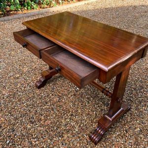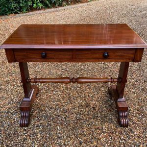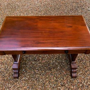 A very high quality 19th Century William IV Mahogany Library Table with two drawers on the front and dummy drawers on the back. Raised on turned supports and carving to feet.