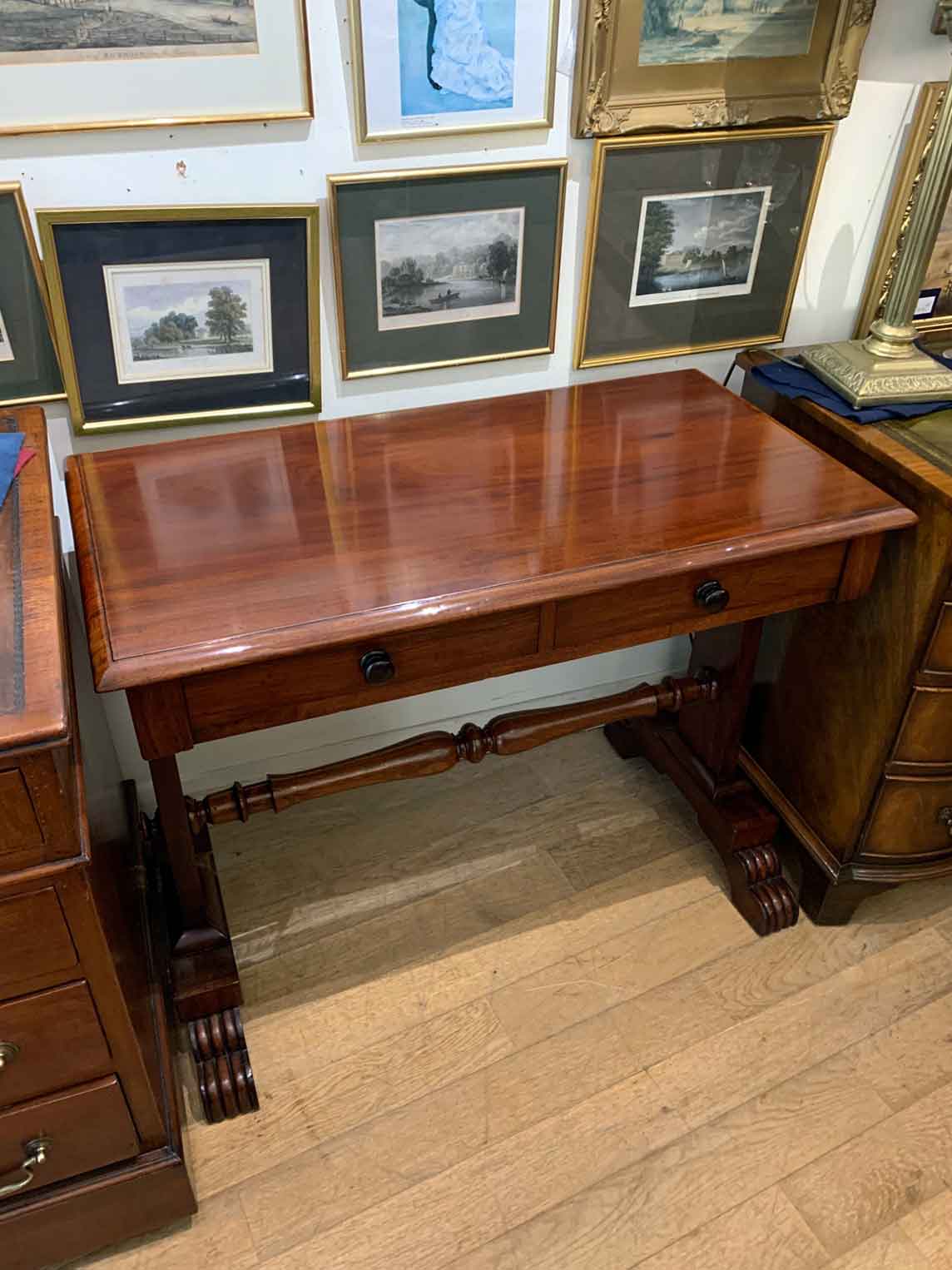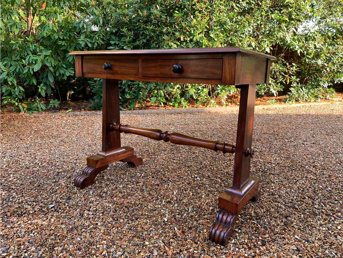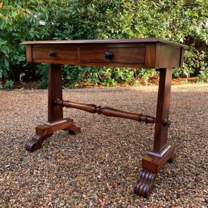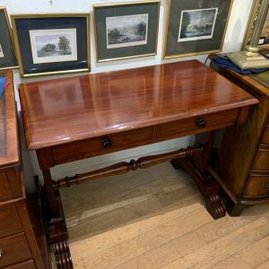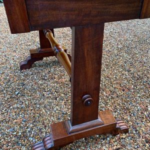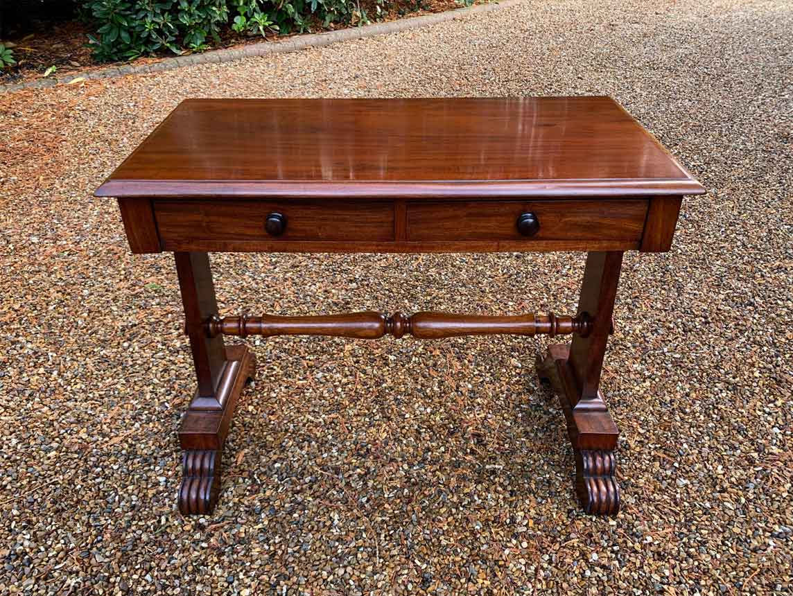 A very high quality 19th Century William IV Mahogany Library Table with two drawers on the front and dummy drawers on the back. Raised on turned supports and carving to feet.