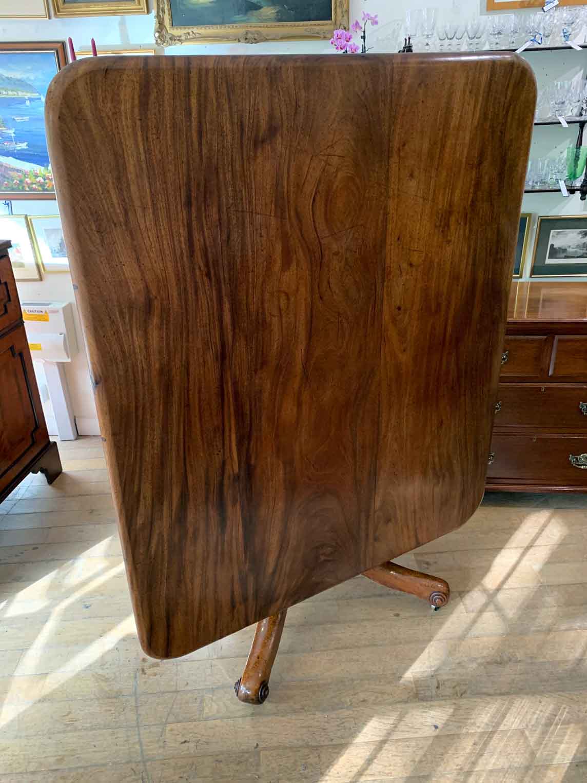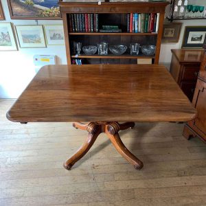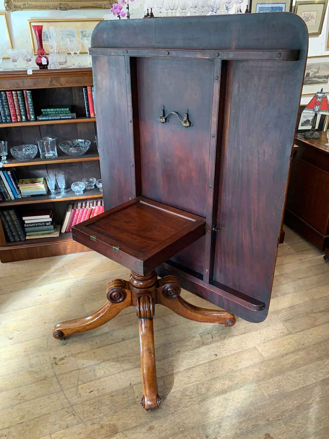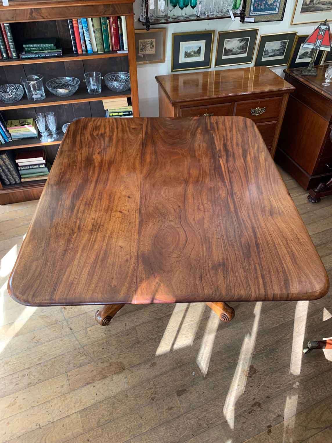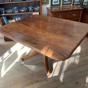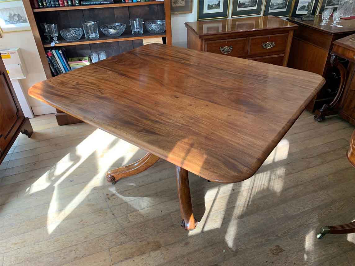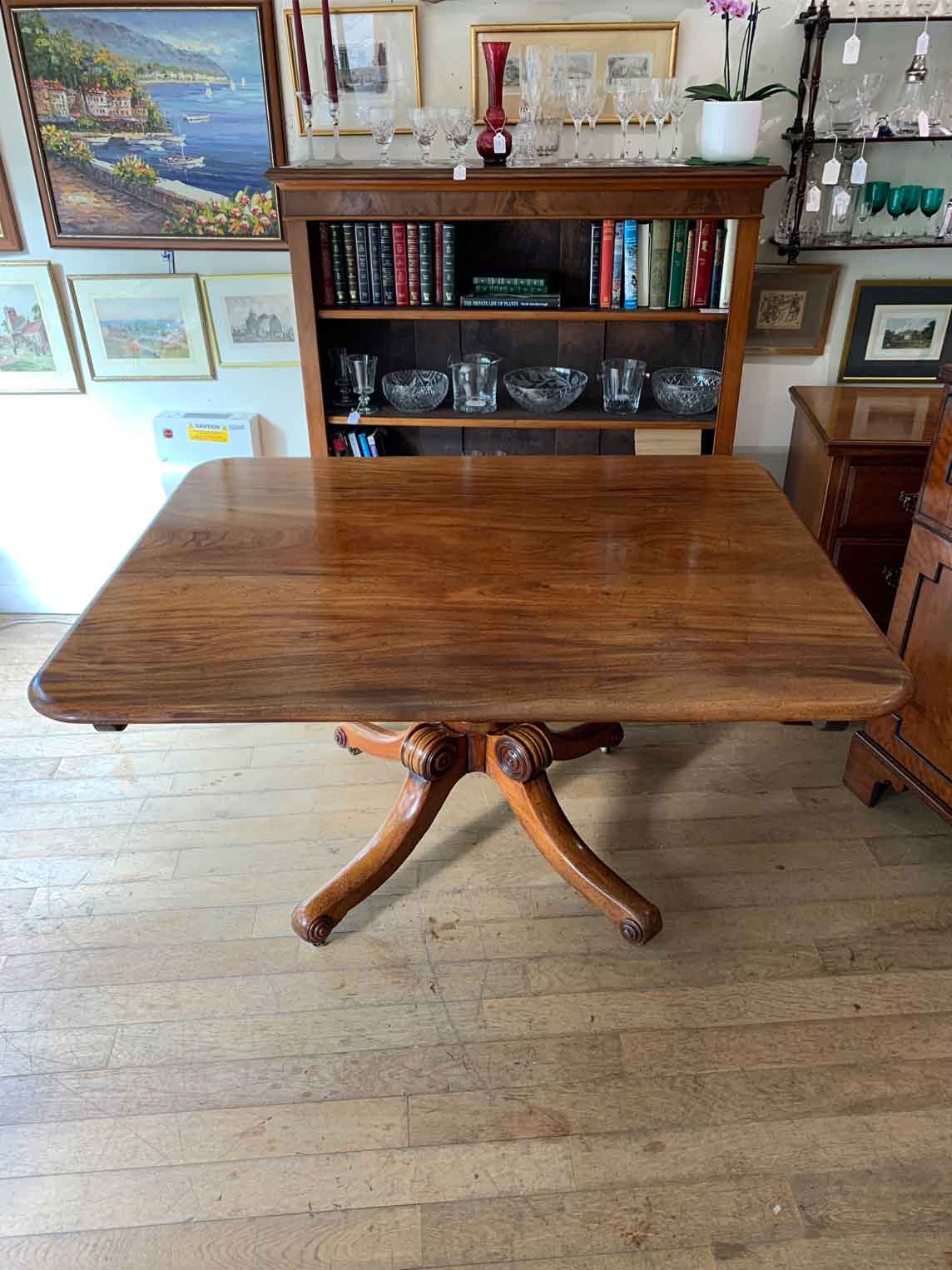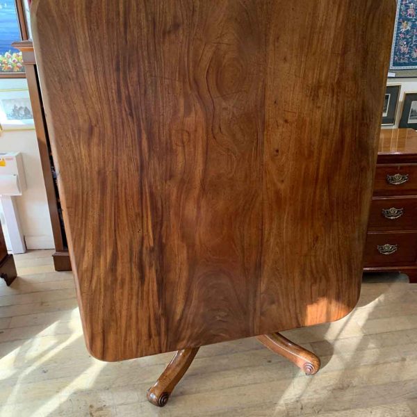 19th Century Mahogany Tilt Top Dining Table with a rectangular top, raised on a solid mahogany turned column with carvings with original castors. To seat four / six.