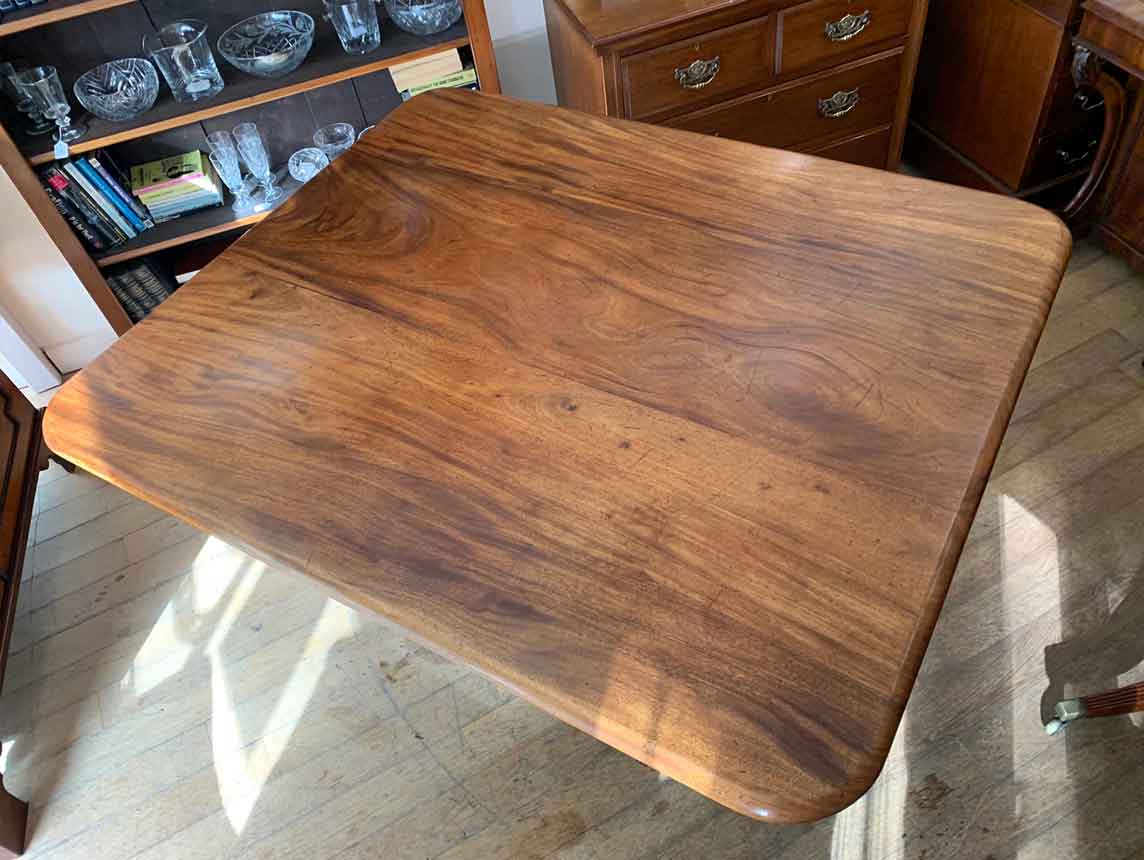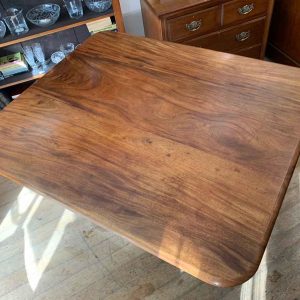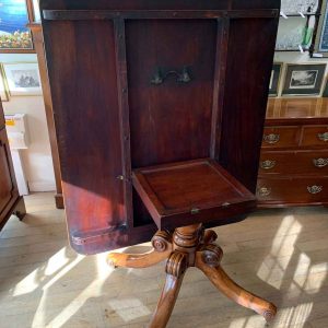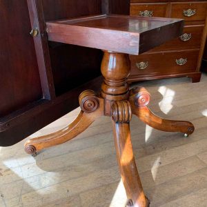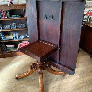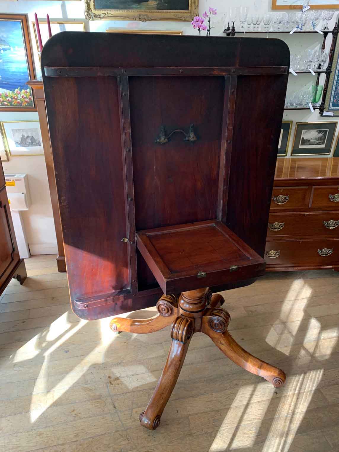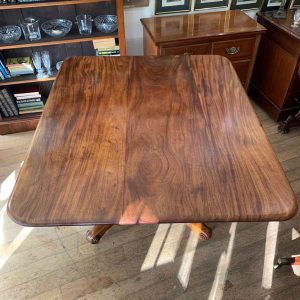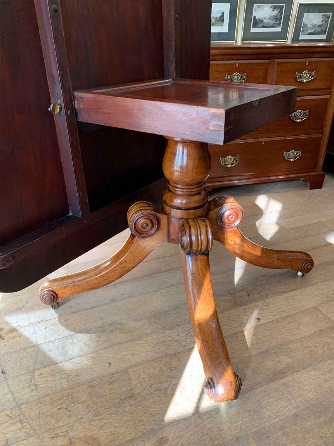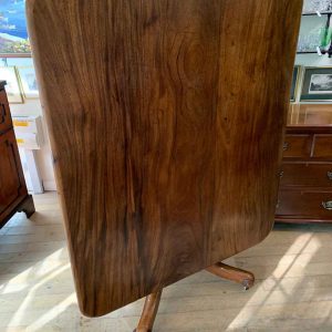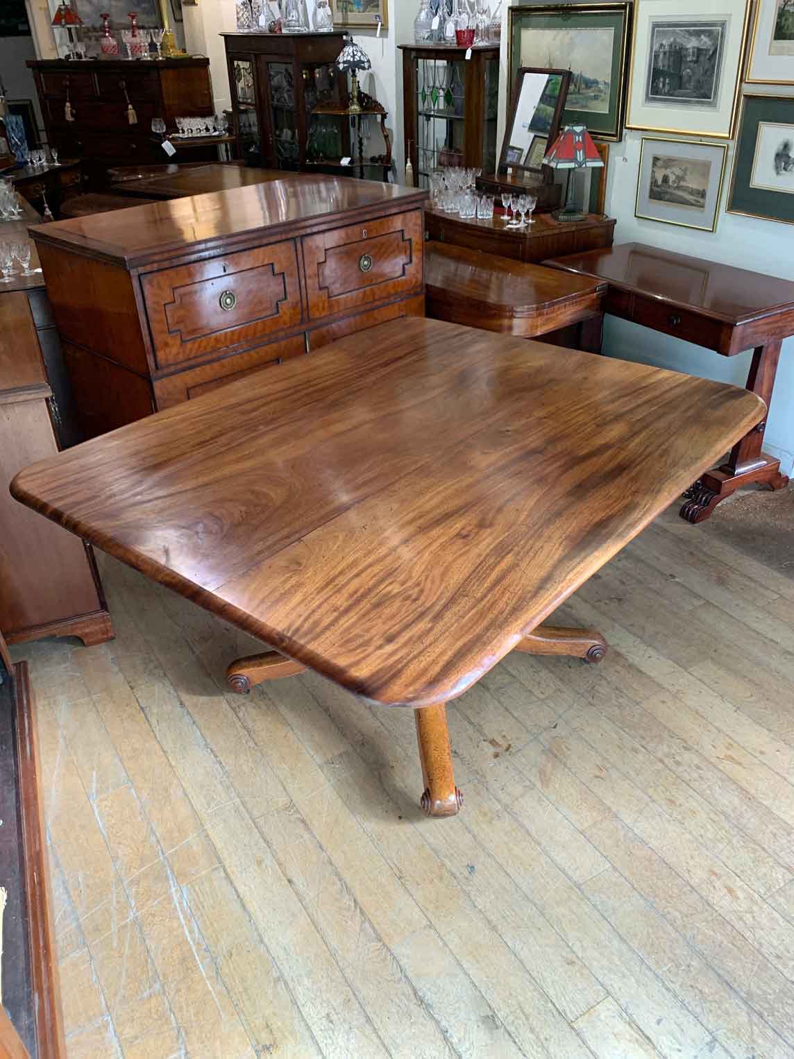 19th Century Mahogany Tilt Top Dining Table with a rectangular top, raised on a solid mahogany turned column with carvings with original castors. To seat four / six.