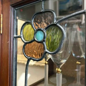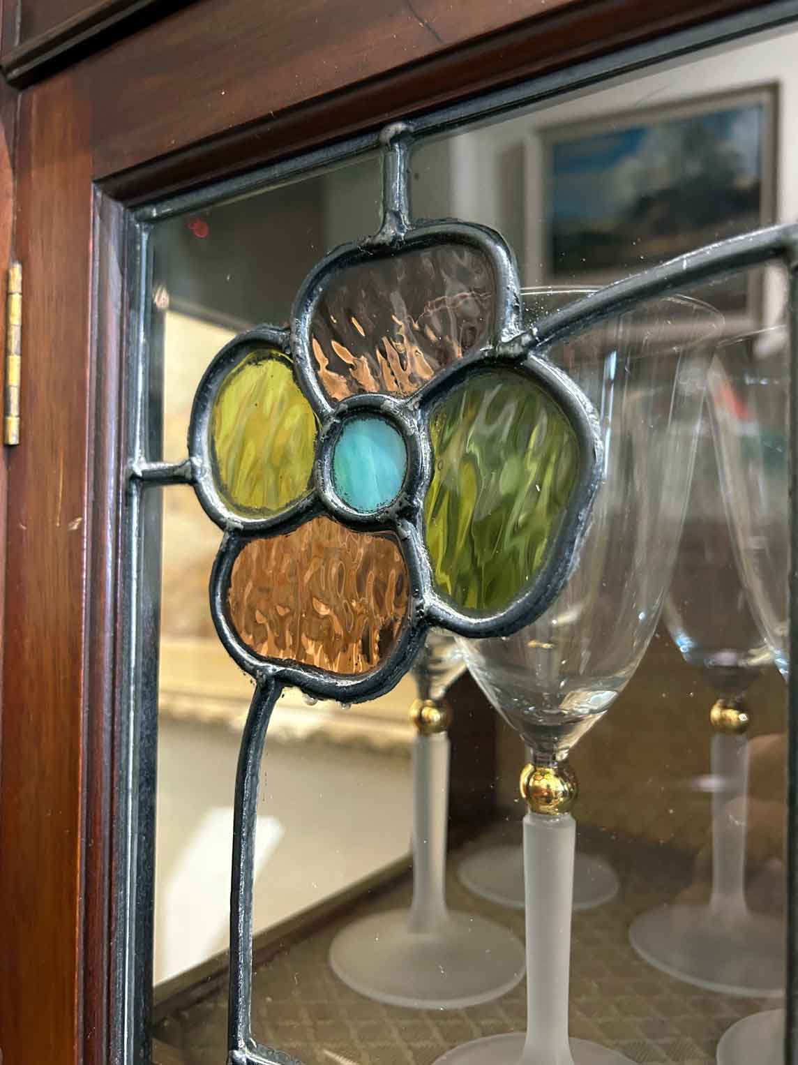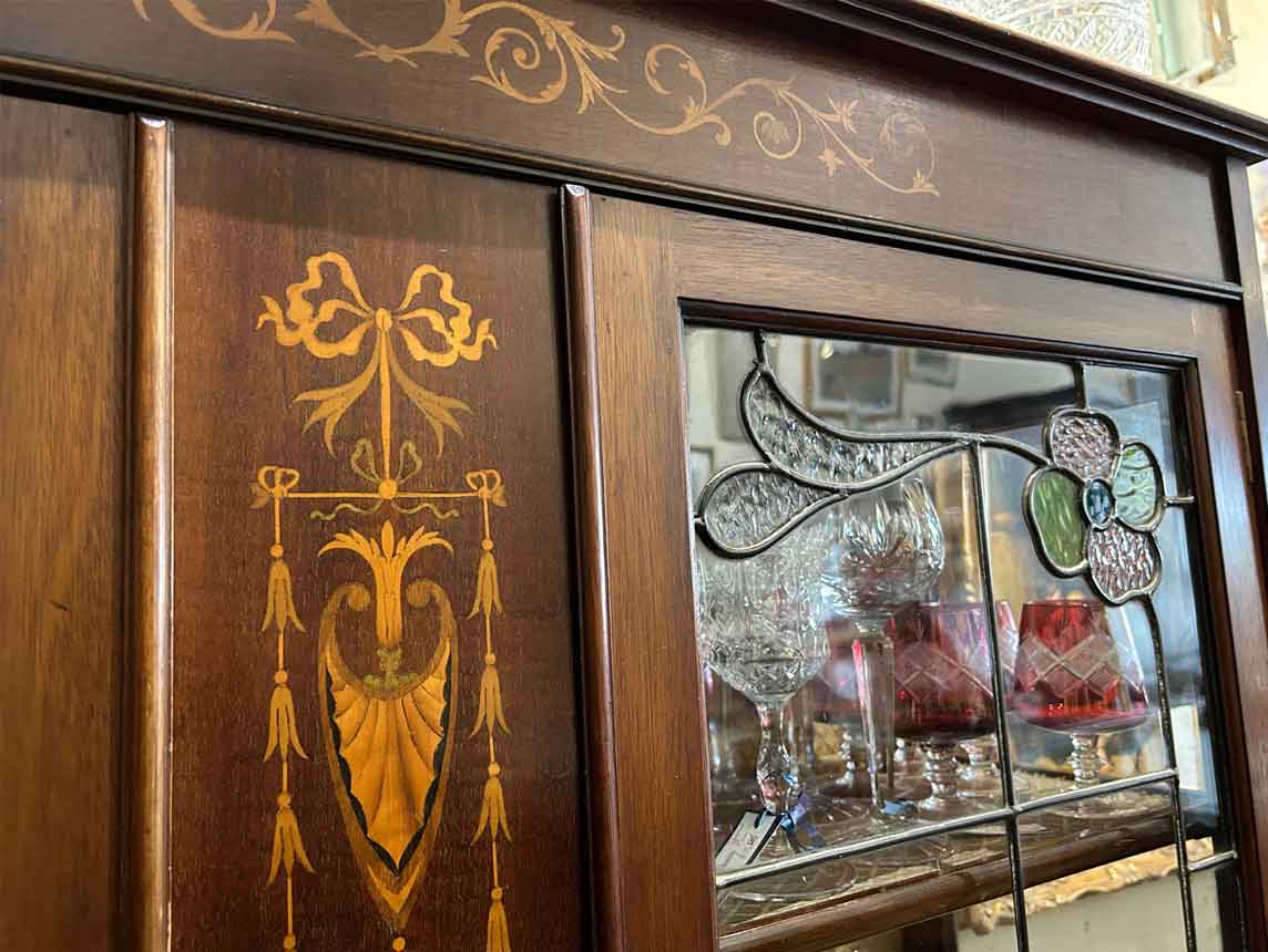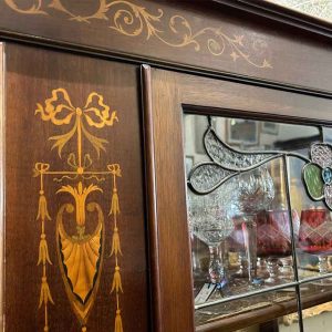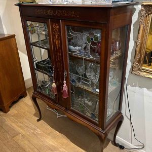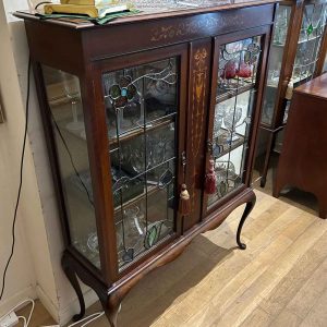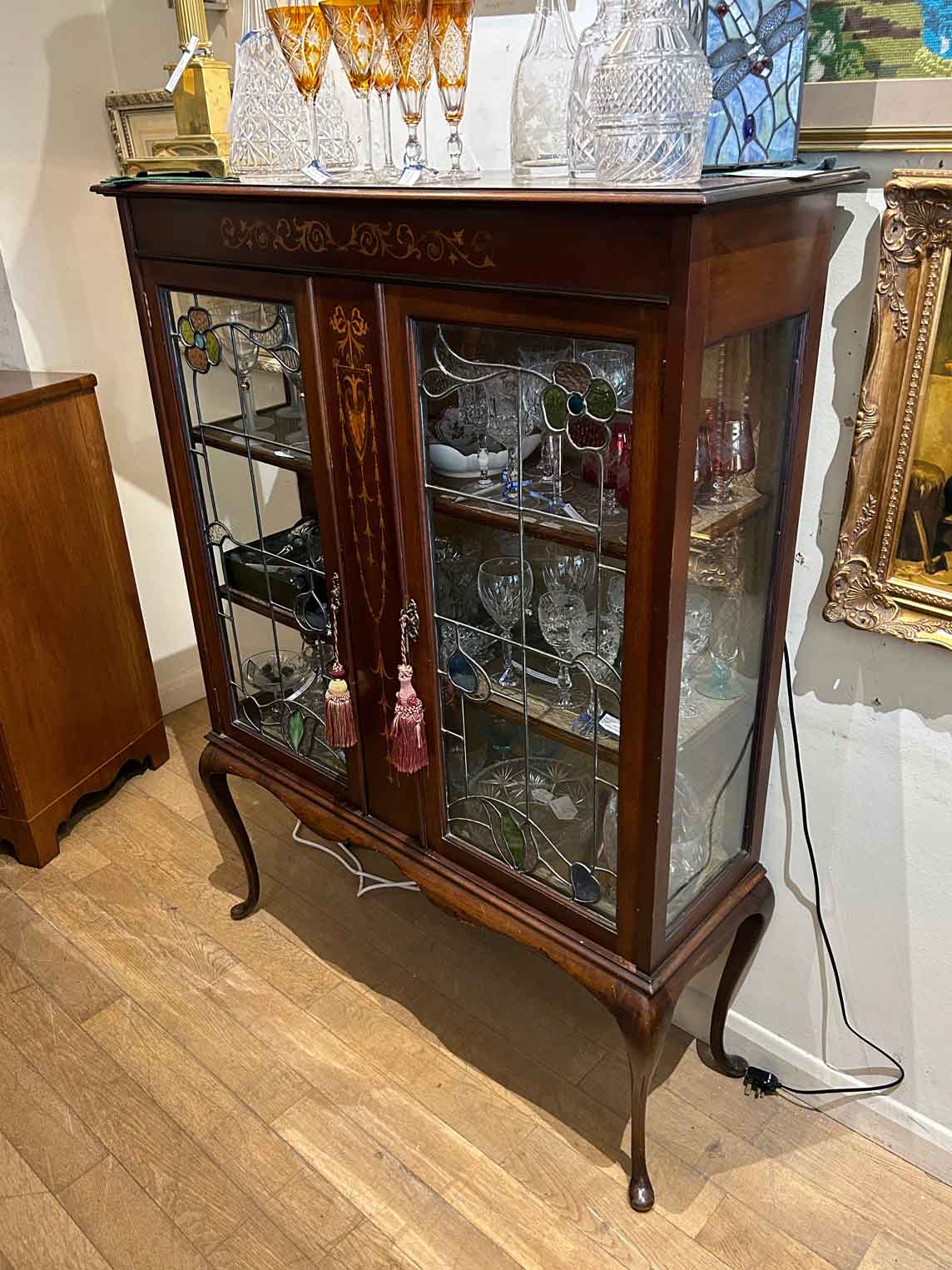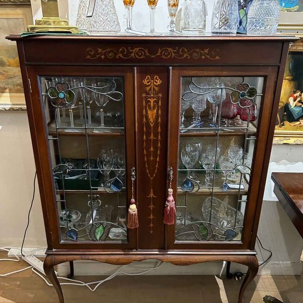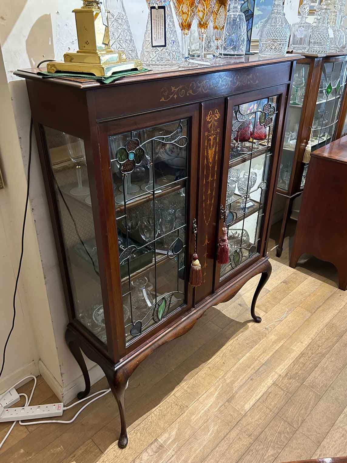 19th Century Art Nouveau Mahogany Inlaid Display Cabinet with floral stain glass windows, three shelves and working keys on four cabriole legs.