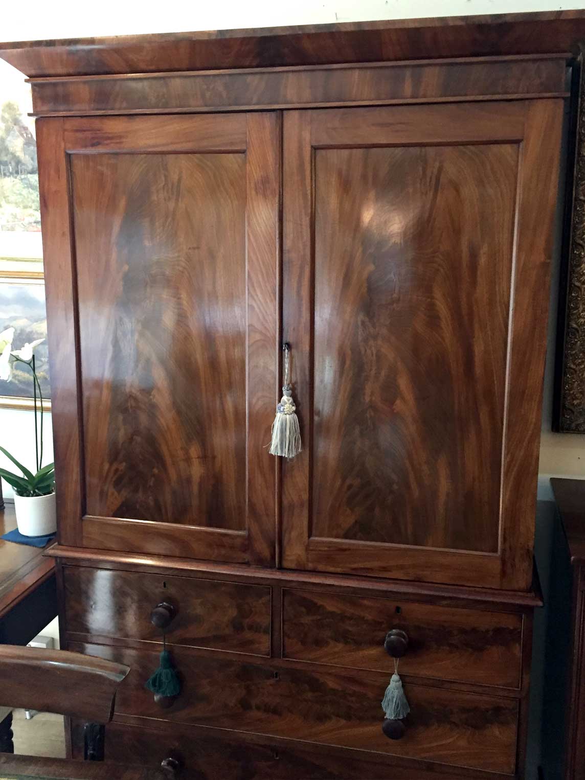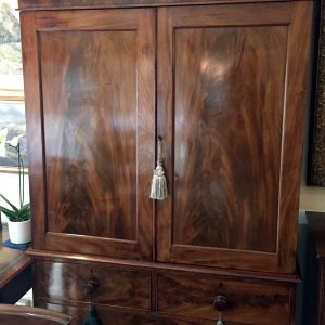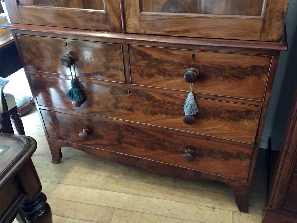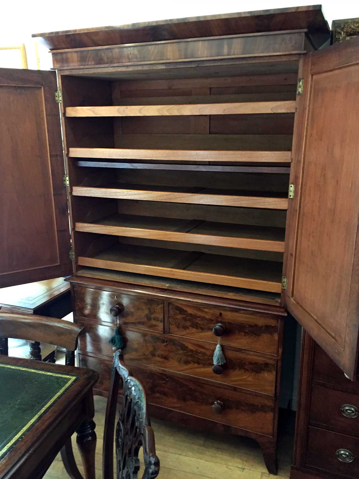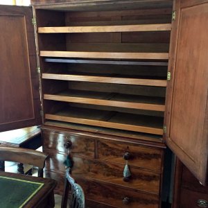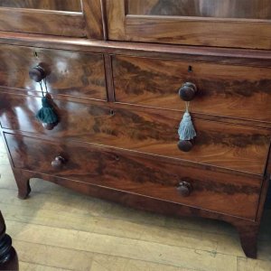 19th Century Victorian Mahogany Linen Press. Two short and two long solid oak lined drawers with original bun handles and 5 original sliding trays on bracket feet. Comes apart in three separate sections.