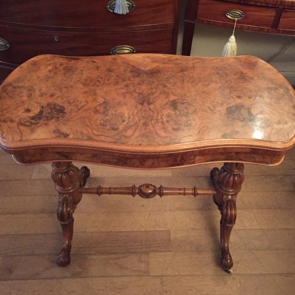 19th Century Victorian Burr Walnut Serpentine Card Table with quarter veneer highly figured burr walnut top and frieze, serpentine in shape with a round end and an inverted corner.