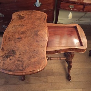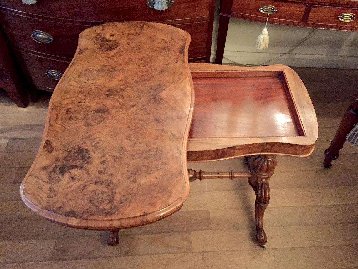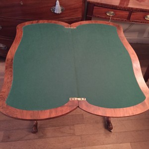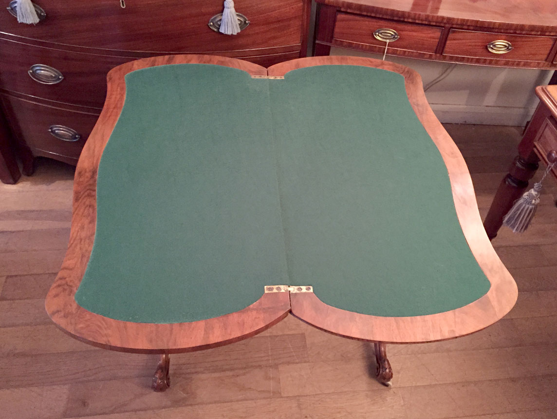 The turned supports are in solid walnut with finely carved gadrooned decoration to the lower turnings. The cabriole legs are well executed and proportioned and terminate with their original white china wheels. The top rotates by 90 degrees and unfolds to convert to the card table.